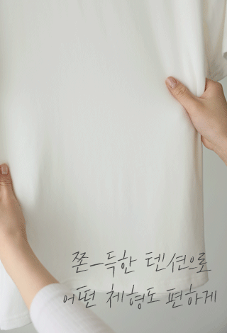 가장 기본이 되는 라운드 네크라인은 시보리 마감을 더해 쉽게 늘어나지 않도록 견고하게 마무리했어요. 어깨라인이 자연스럽게 드롭되는 디자인이라 팔뚝 살을 자연스럽게 감춰주면서도 전체적인 실루엣이 여유로워 보인답니다.