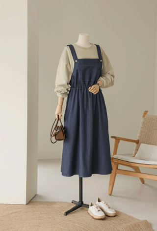 A:가슴 라인 밑에서부터 과하지 않게 떨어지는 에이라인이니까요, 부해 보이기보다 오히려 허리선을 높게 잡아주어 다리가 길어 보여요.
