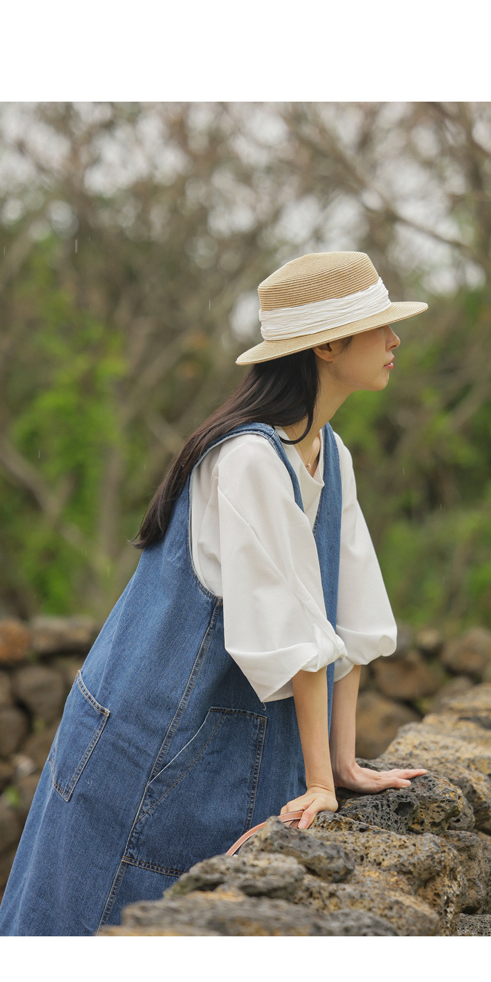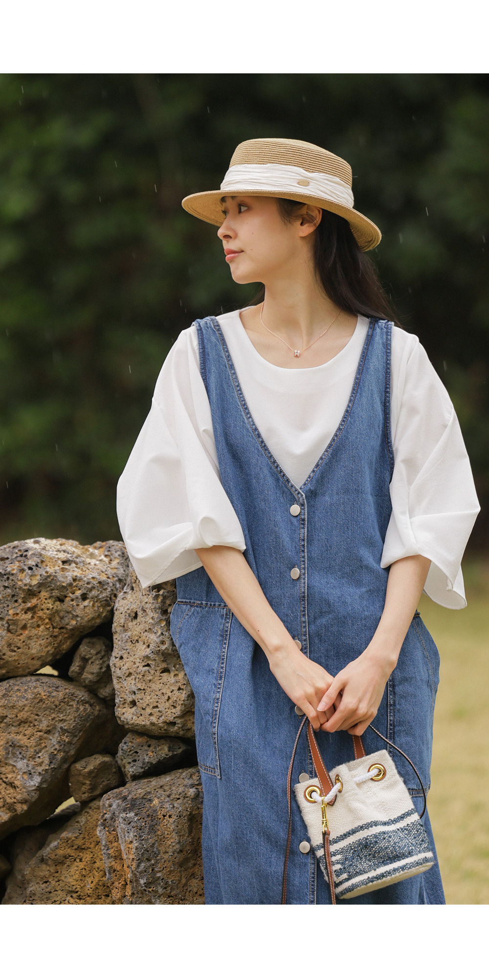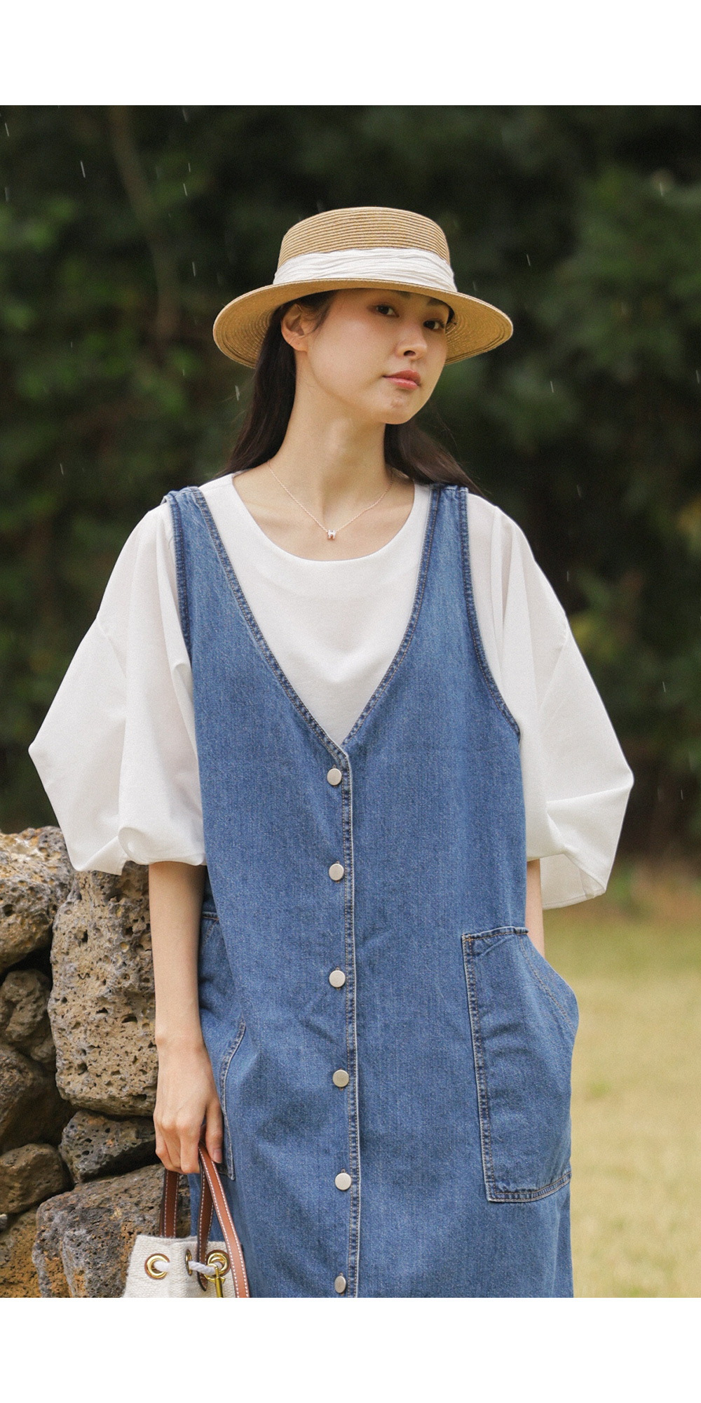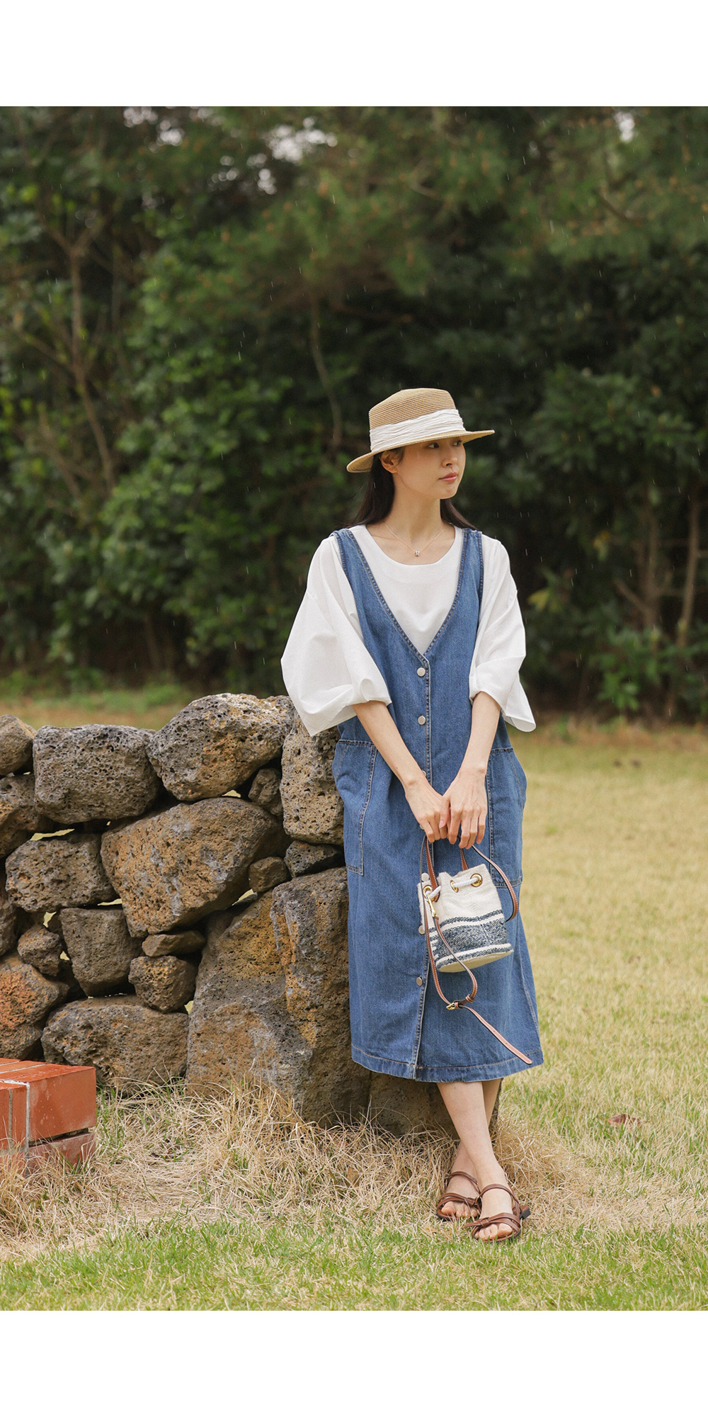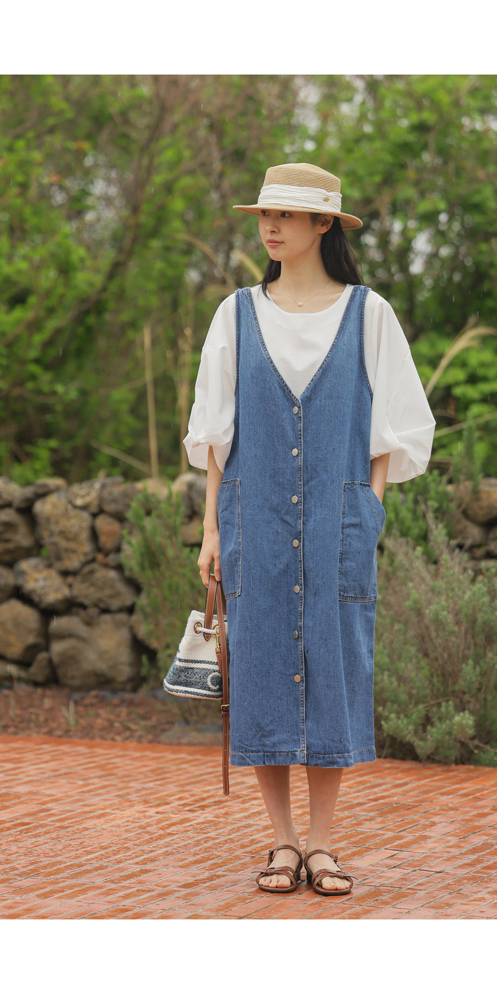 코디정보 주수메 퍼프 블라우스 _ 네이비치시긴 여유일자 팬츠 _ 라이트데님
