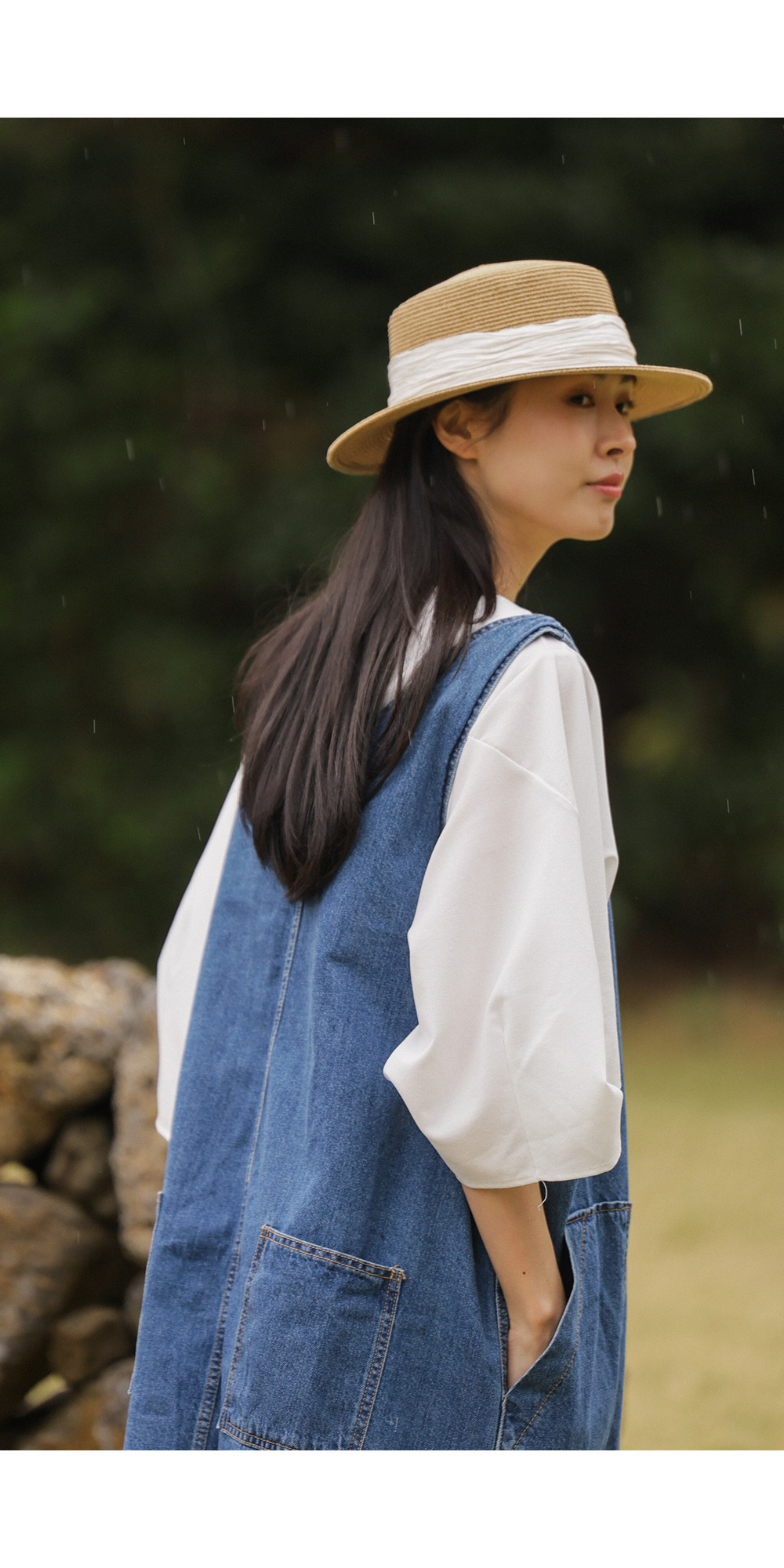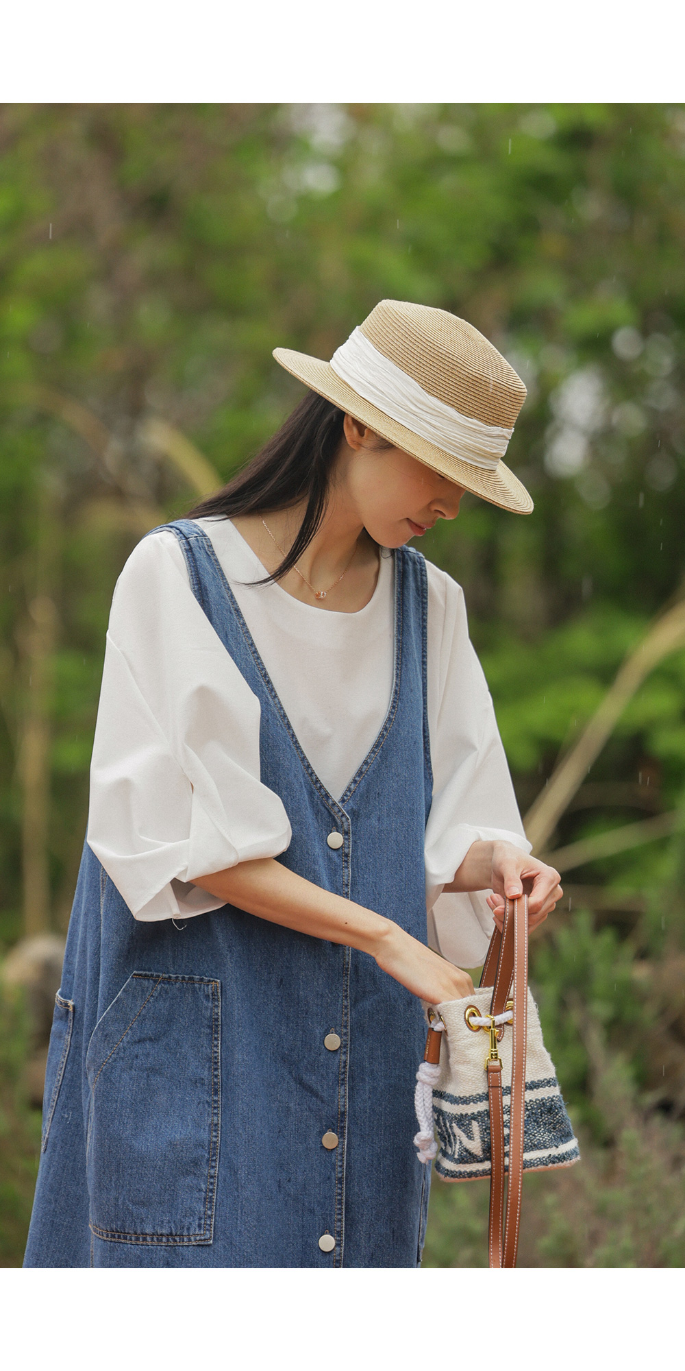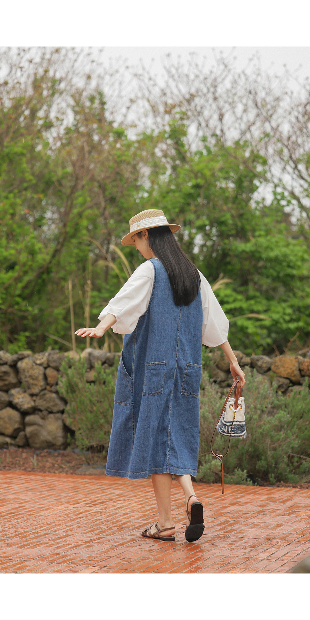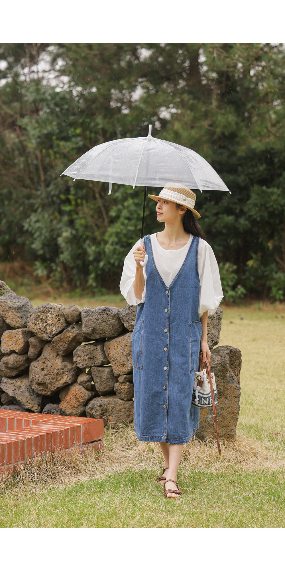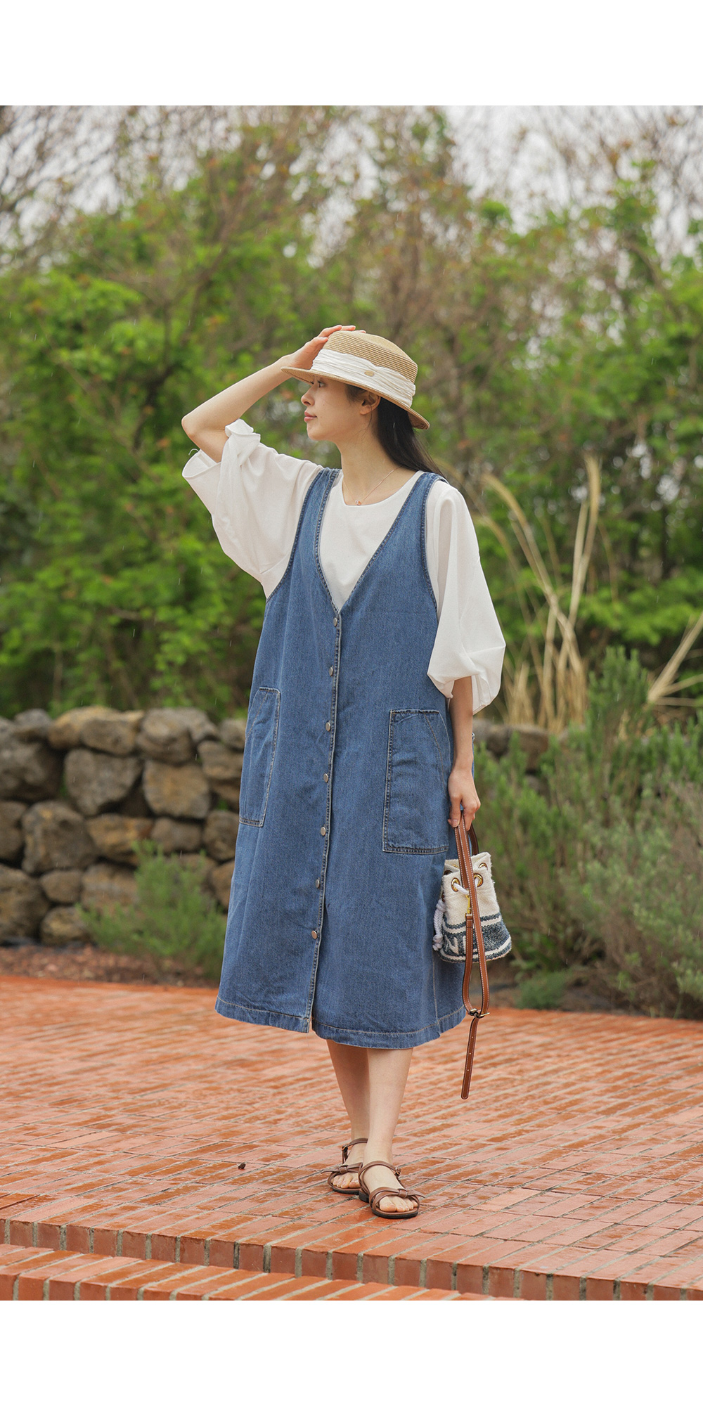 코디정보 주수메 퍼프 블라우스 _ 네이비치시긴 여유일자 팬츠 _ 라이트데님