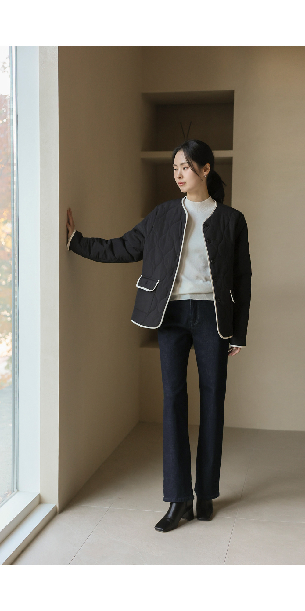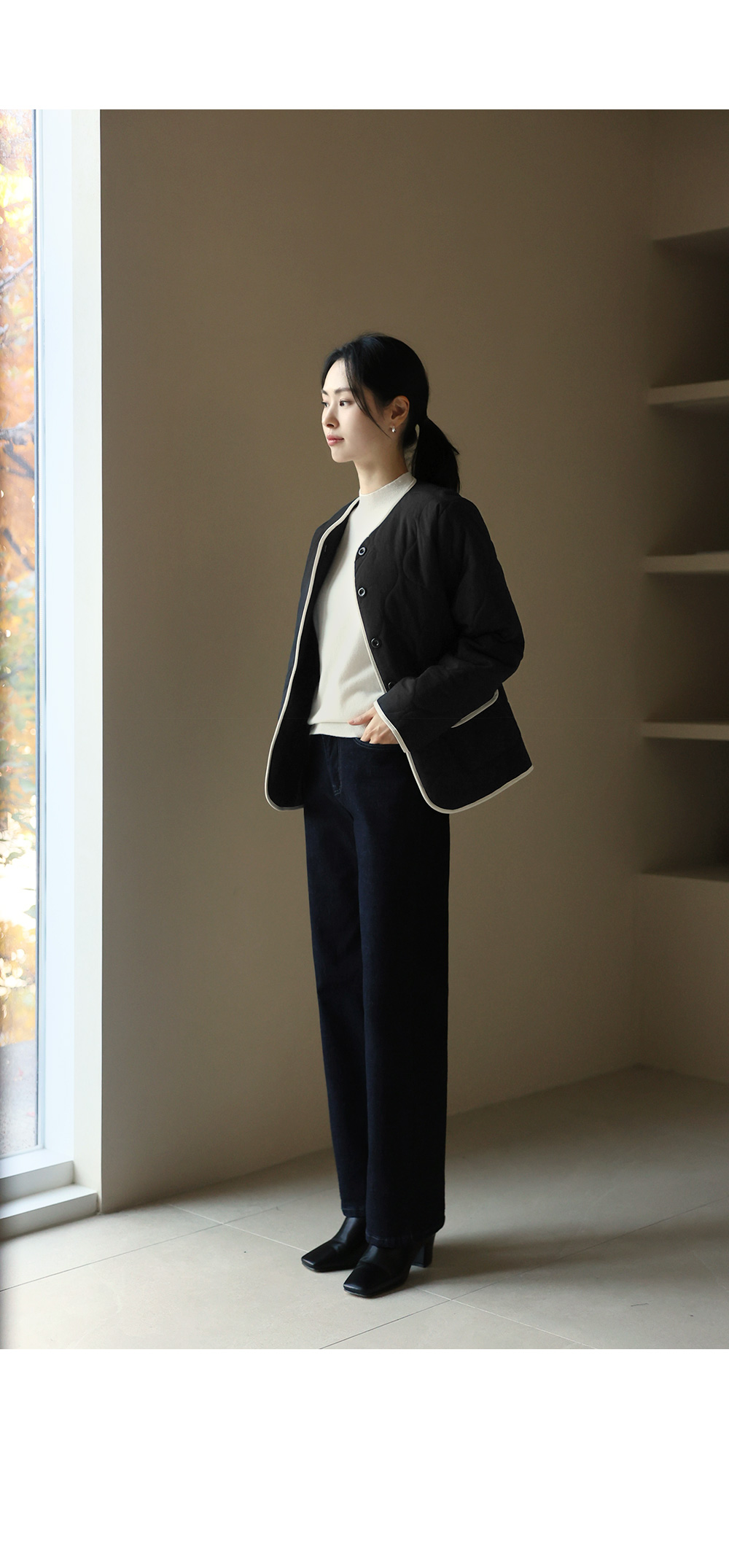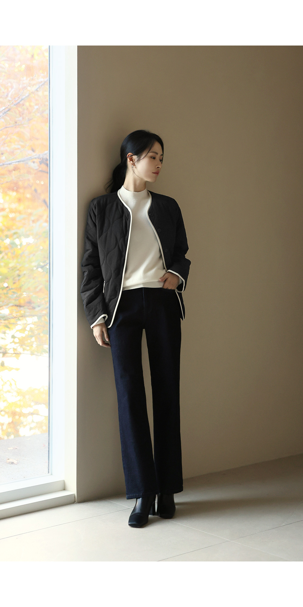모델정보 HR : 키 167cm / 상의 55 / 하의 26(S) / 신발 240mm코디정보 라니움 배색 패딩점퍼 _ 블랙제어티 반폴라 니트 _ 크림 다히어 일자팬츠 _ 데님