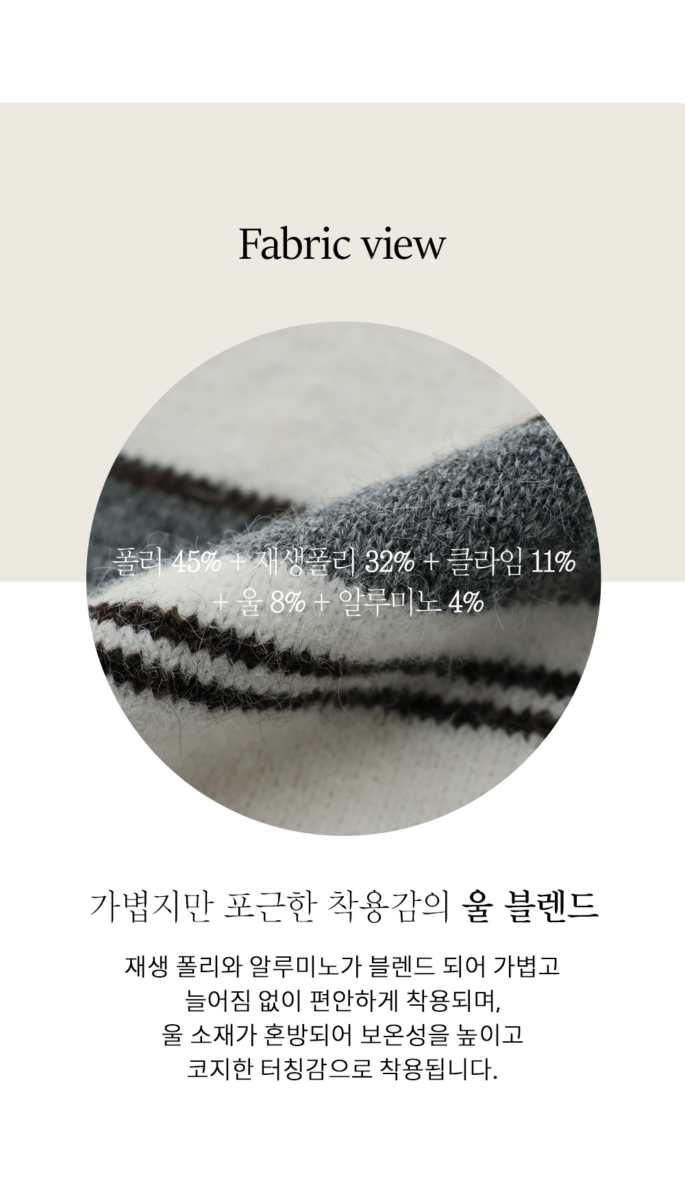 폴리45%,재생폴리32%,클라임11%,울8%,알루미노4%