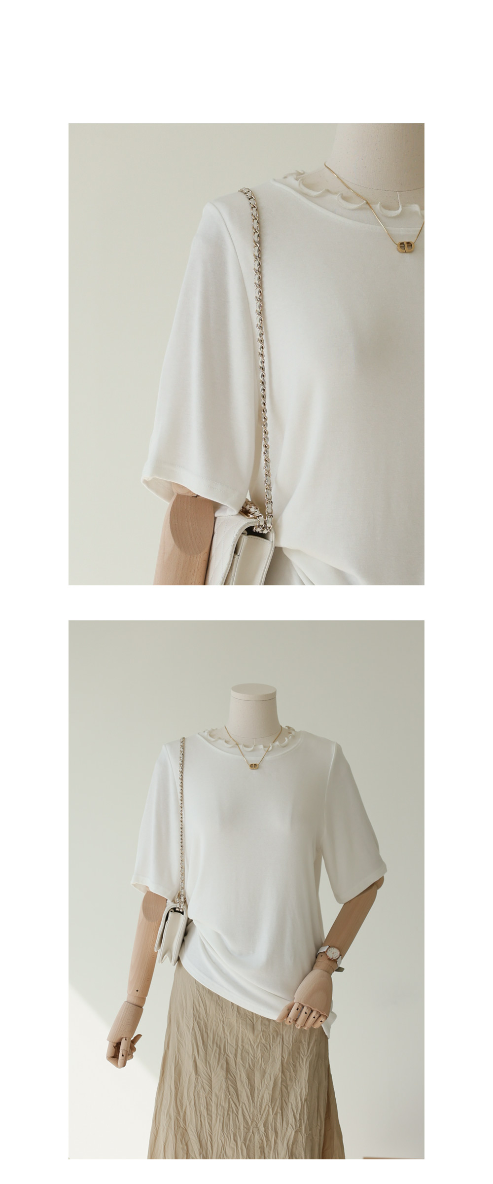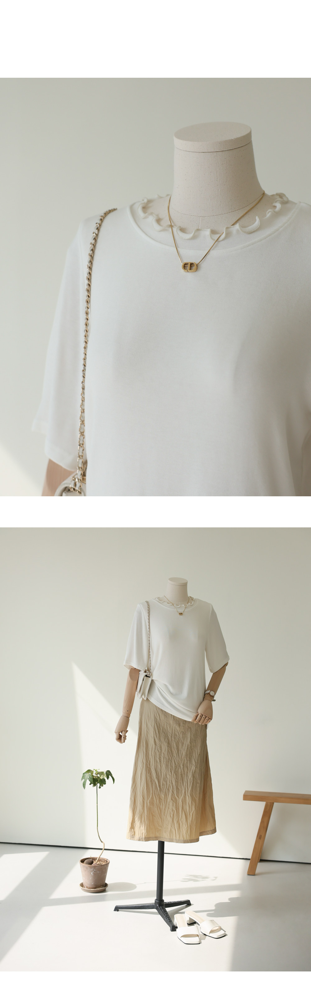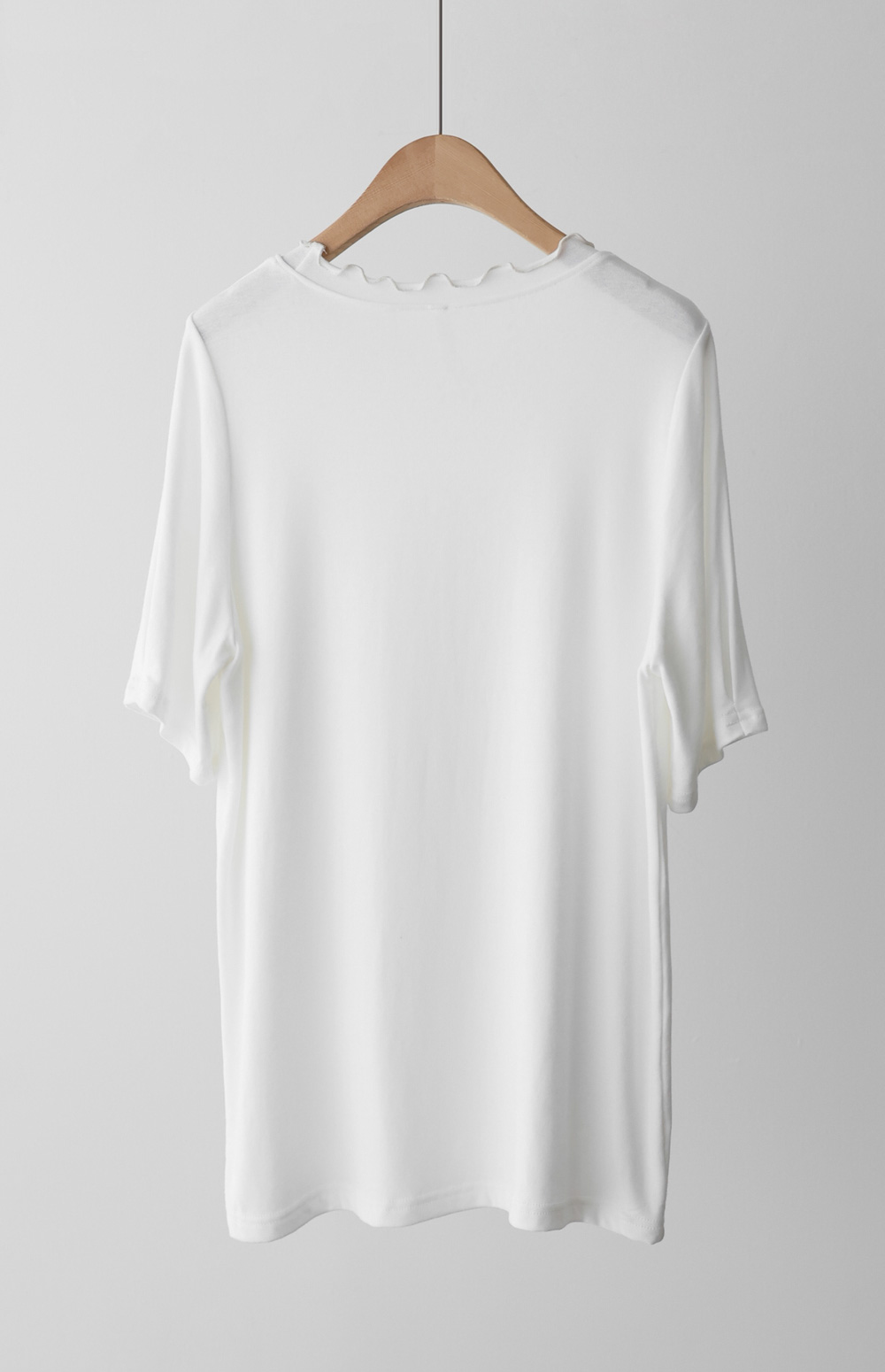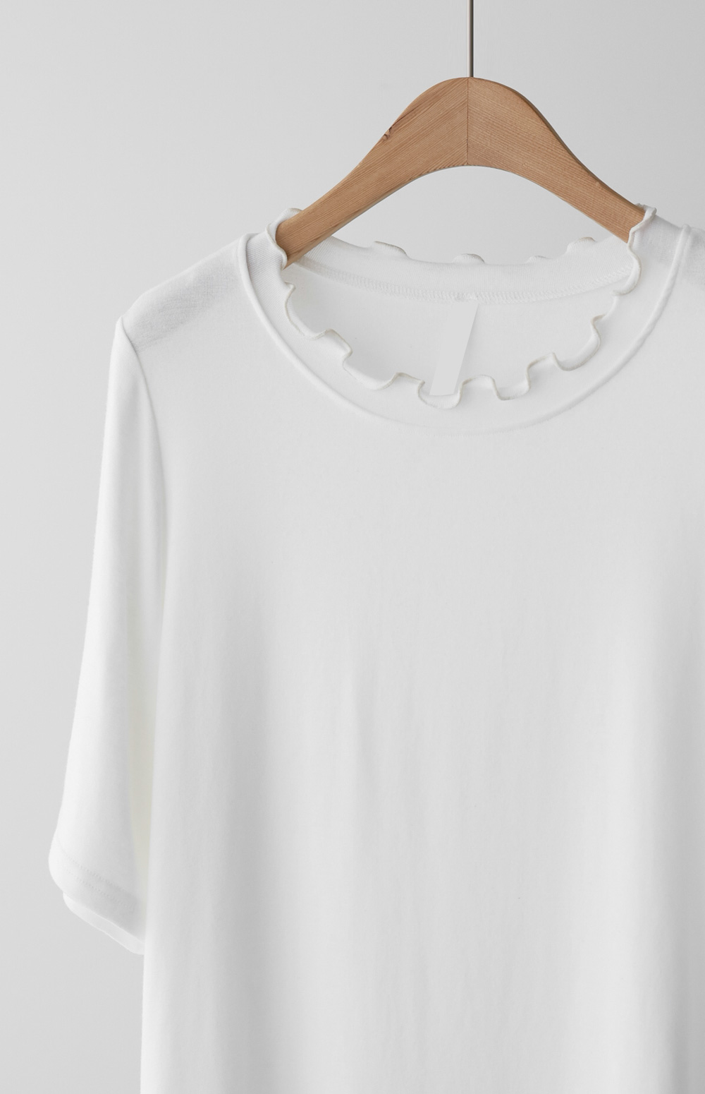 반팔 티셔츠는 매일 입는 옷이지만, 우아함은 포기할 수 없기에 특별한 디테일을 담았어요. 넥 라인 끝단에 더해진 섬세한 물결 프릴이 인상을 화사하고 부드럽게 만들어주며, 일반 티셔츠와는 차원이 다른 은은한 광택감이 룩의 완성도를 높여준답니다.