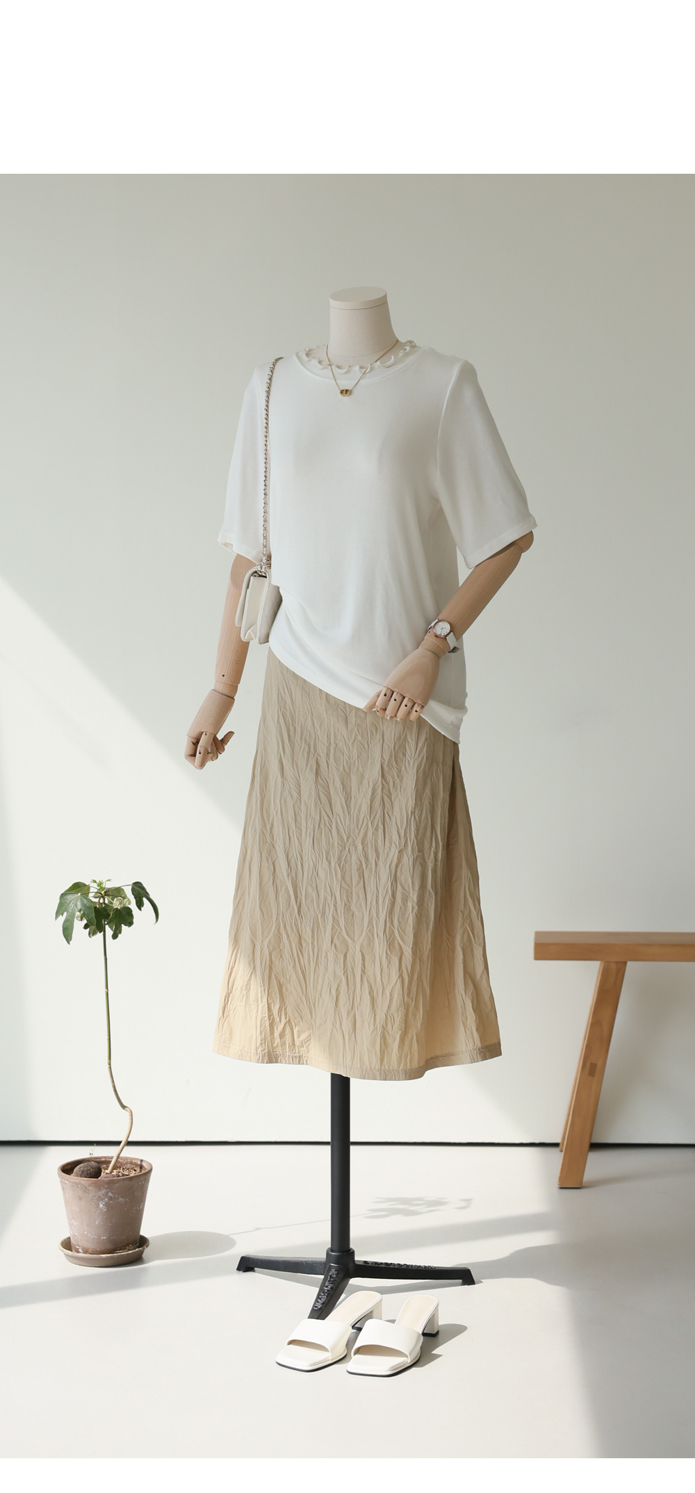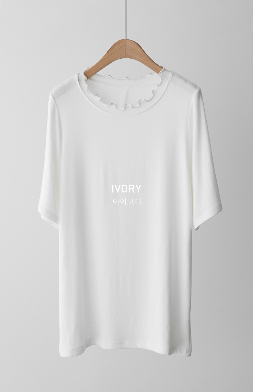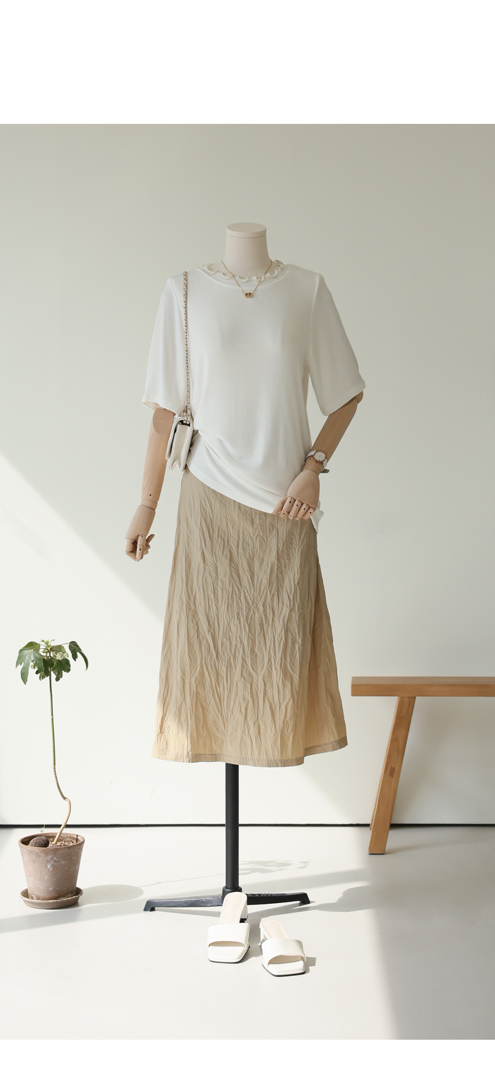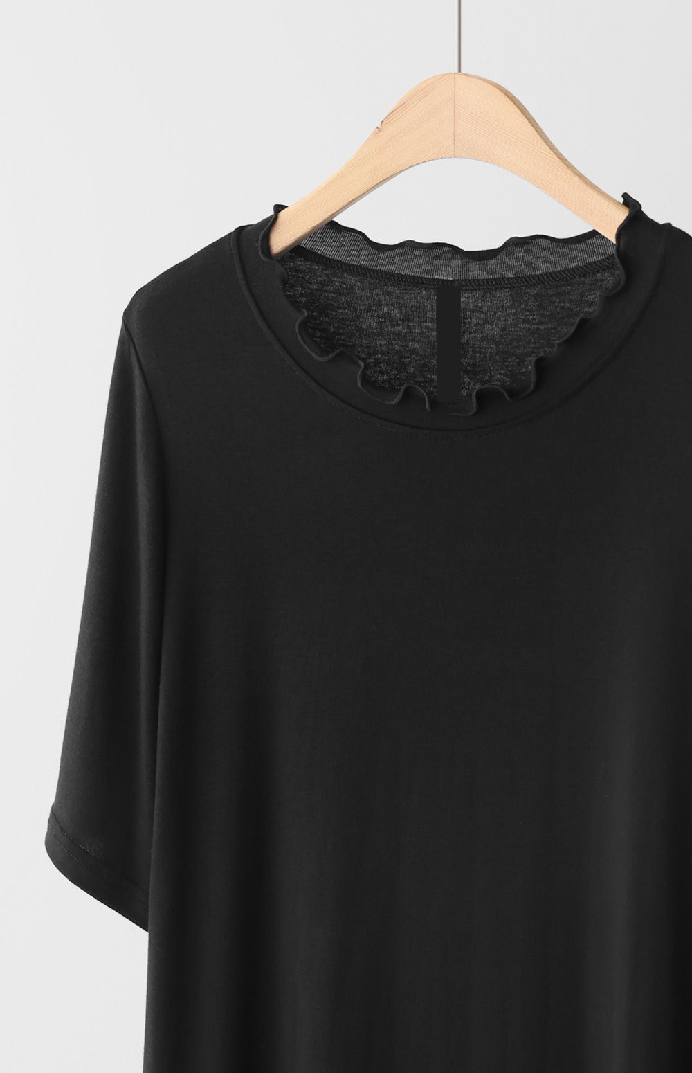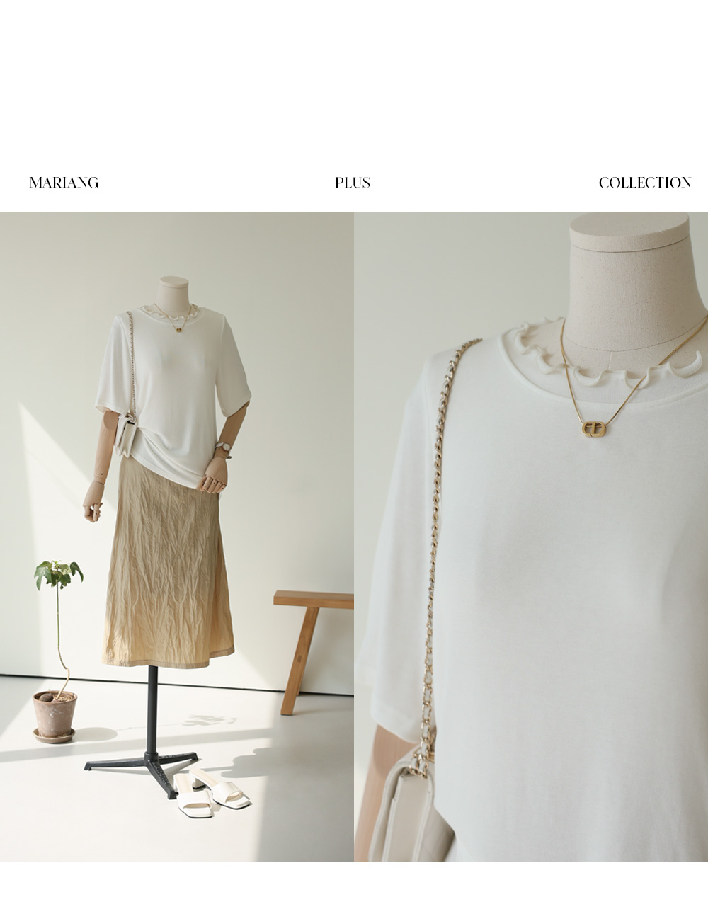 반팔 티셔츠는 매일 입는 옷이지만, 우아함은 포기할 수 없기에 특별한 디테일을 담았어요. 넥 라인 끝단에 더해진 섬세한 물결 프릴이 인상을 화사하고 부드럽게 만들어주며, 일반 티셔츠와는 차원이 다른 은은한 광택감이 룩의 완성도를 높여준답니다.