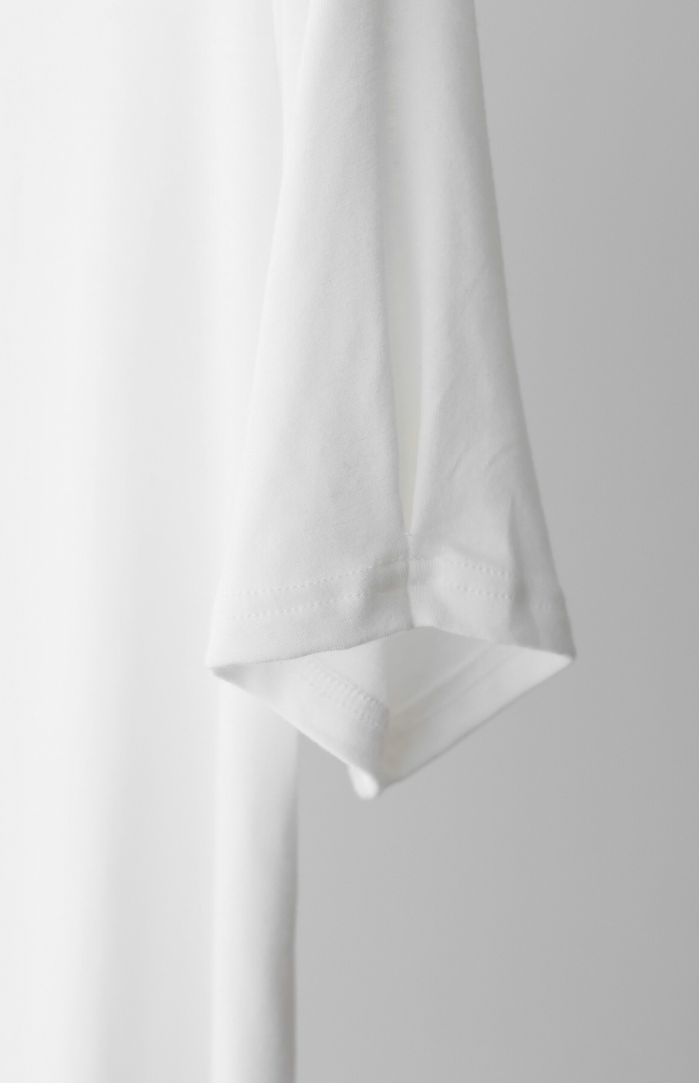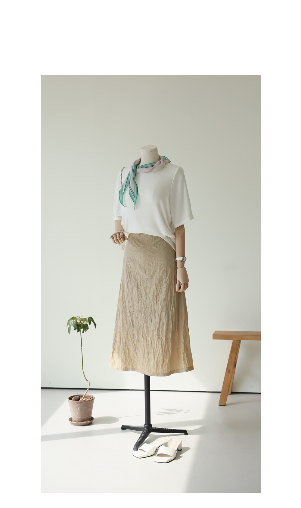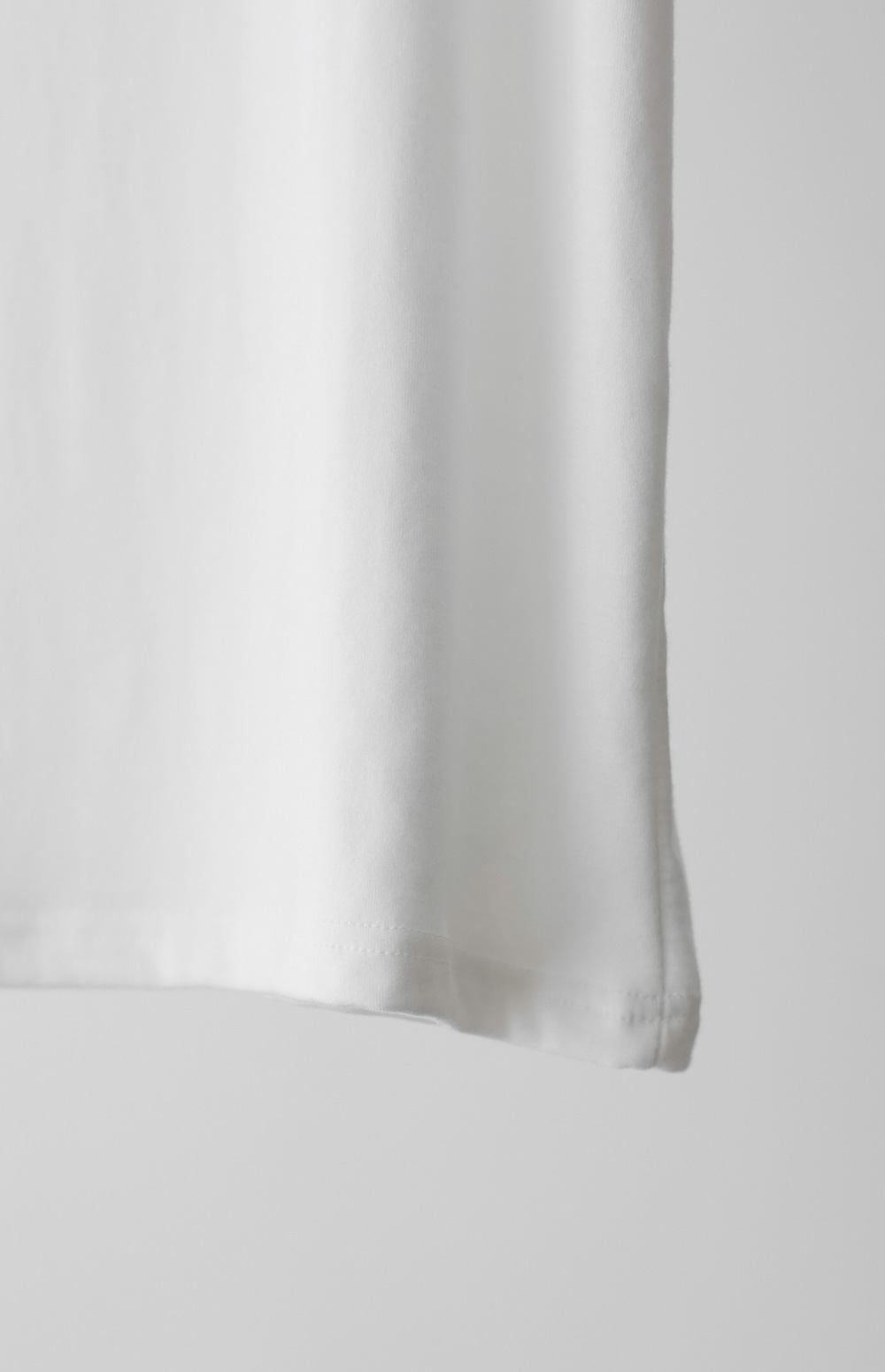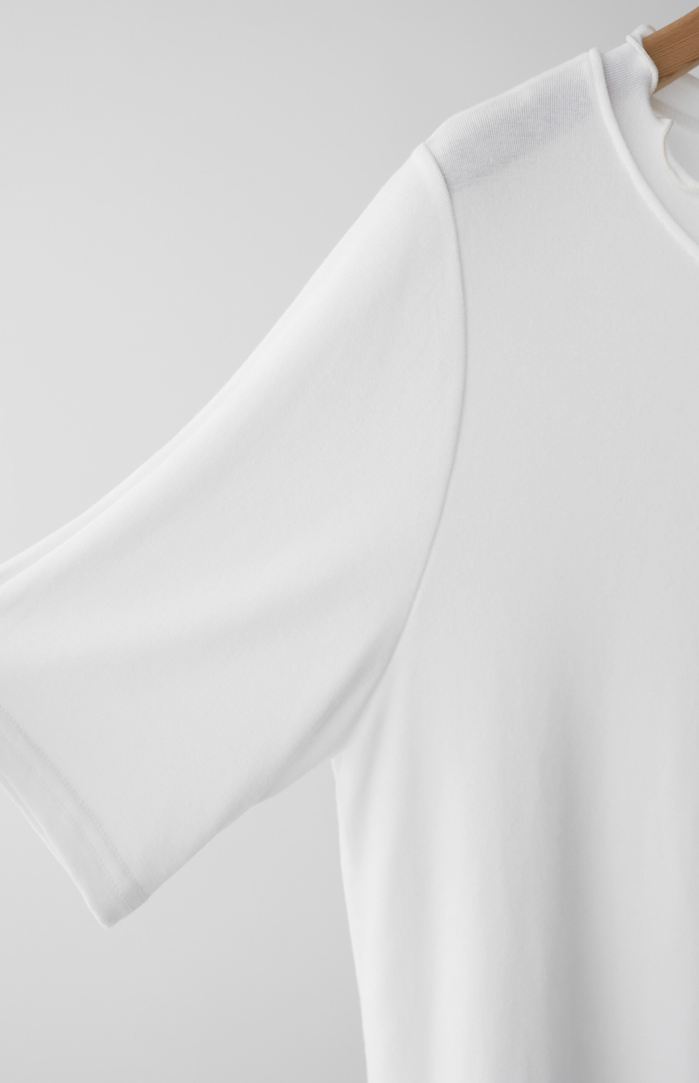 반팔 티셔츠는 매일 입는 옷이지만, 우아함은 포기할 수 없기에 특별한 디테일을 담았어요. 넥 라인 끝단에 더해진 섬세한 물결 프릴이 인상을 화사하고 부드럽게 만들어주며, 일반 티셔츠와는 차원이 다른 은은한 광택감이 룩의 완성도를 높여준답니다.