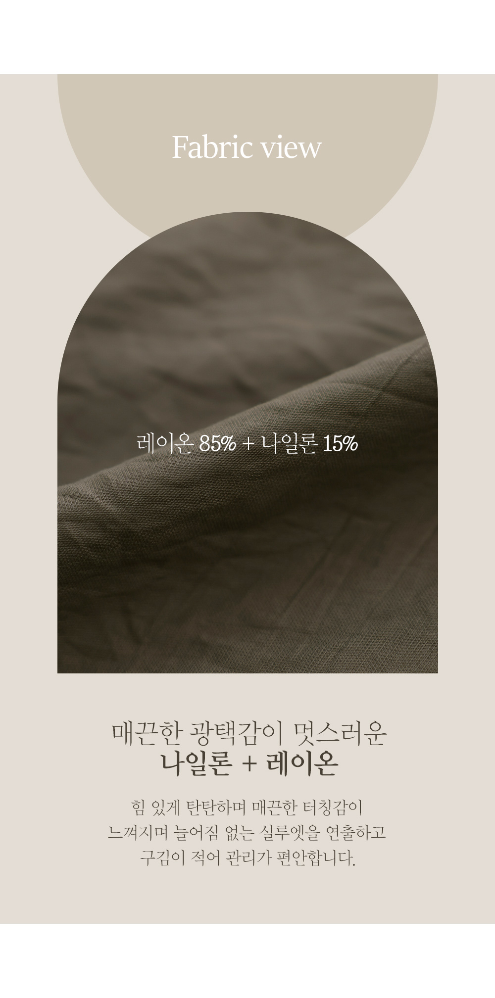 레이온의 부드러운 터칭감과 나일론의 탄탄함이 만나 최적의 밸런스를 보여주는 소재예요. 얇은 두께감으로 제작되어 무게감이 거의 느껴지지 않을 만큼 가볍고, 매끄러운 촉감이 피부에 닿을 때 자극 없이 편안하게 감싸준답니다. 조직감이 탄탄해 실루엣이 쉽게 흐트러지지 않고 여리여리한 핏을 오랫동안 유지해 주는 것이 특징이에요.