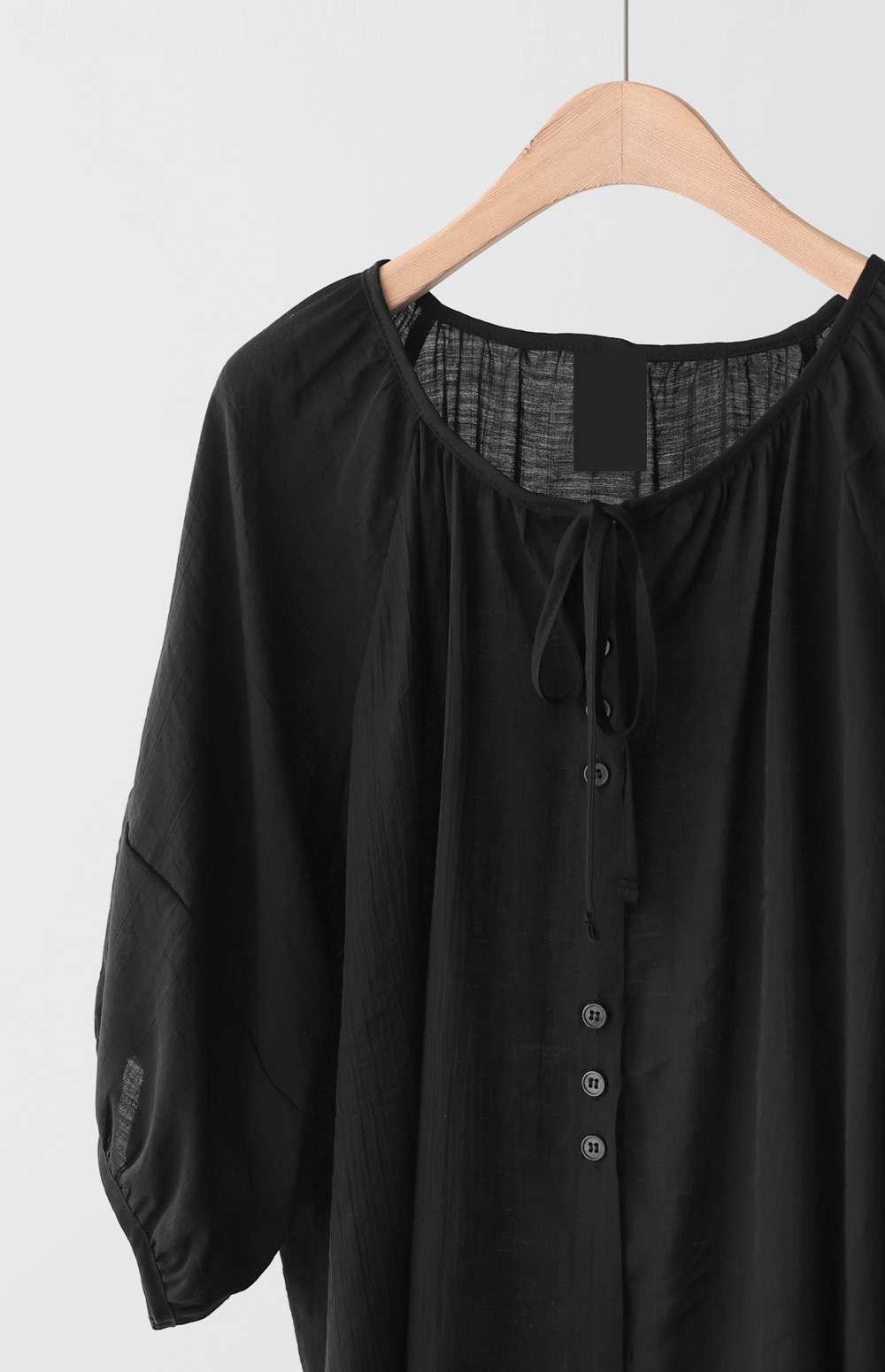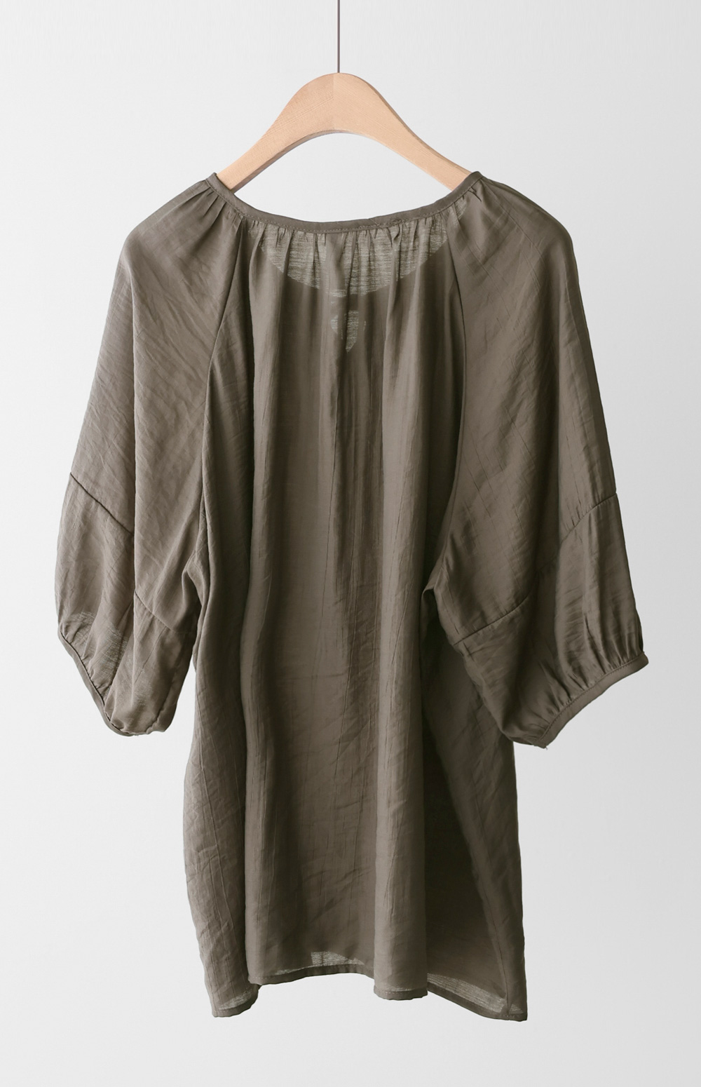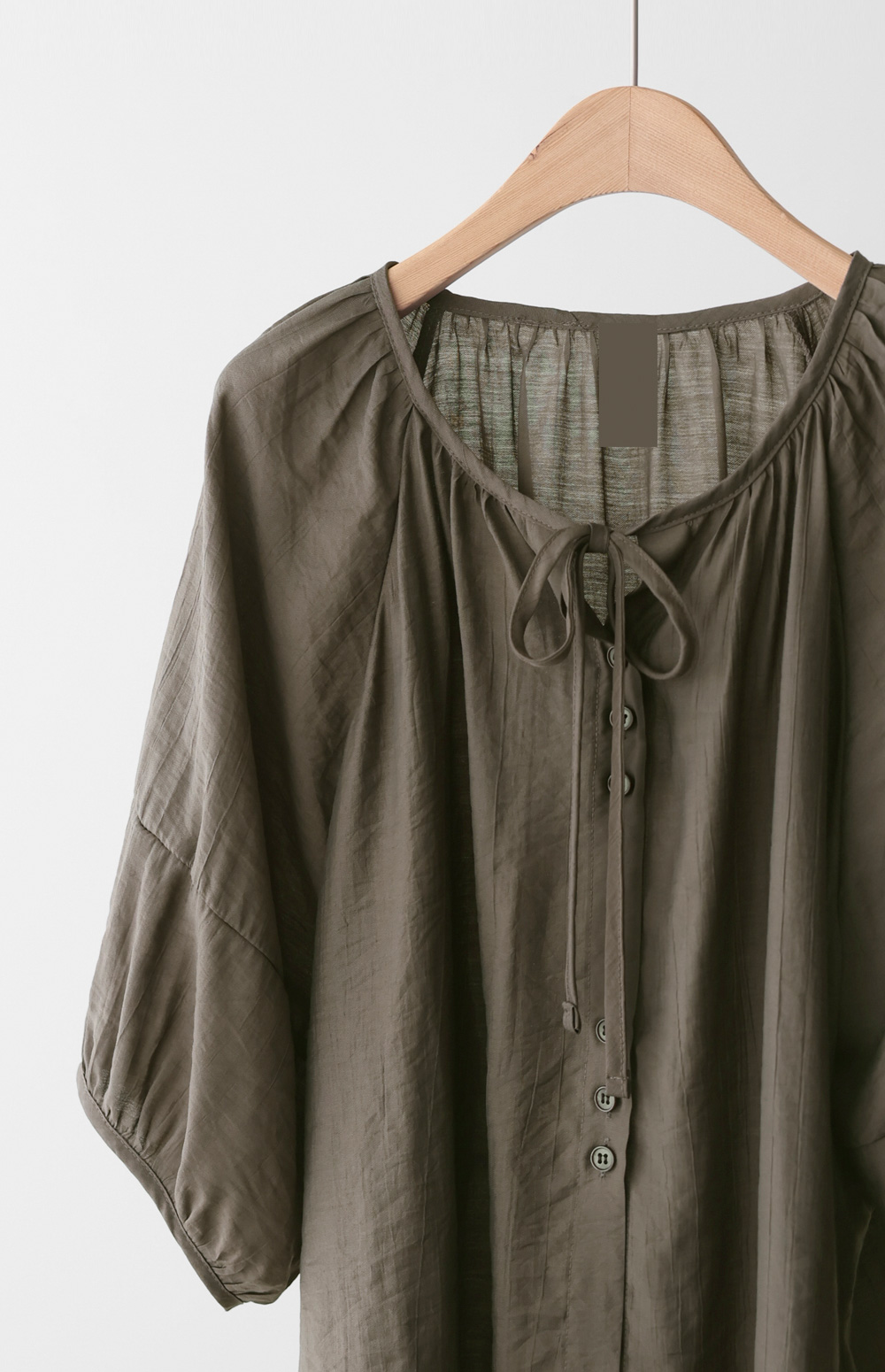내추럴하면서도 세련된 무드를 가득 담은 블라우스 아이템을 소개해 드려요. 래글런 디자인으로 어깨 라인이 부드럽게 떨어져 상체 부각 없이 매끄럽고 여리여리한 실루엣을 연출해 주는데요. 넥라인의 셔링 디테일과 스트랩이 얼굴선을 더욱 화사하고 입체적으로 살려준답니다.