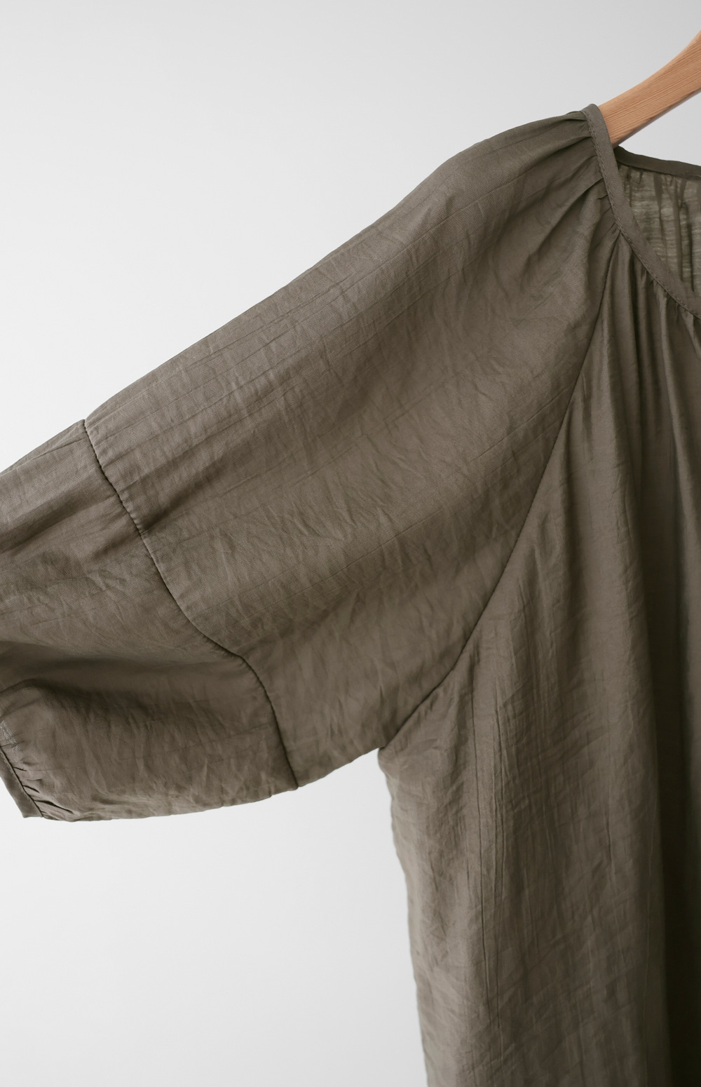 가장 먼저 시선을 사로잡는 건 넥라인의 셔링 디테일이에요. 내추럴하게 잡힌 셔링이 자연스러운 볼륨감을 만들어주어 가슴 라인은 커버하고 전체적인 실루엣은 우아하게 잡아준답니다.