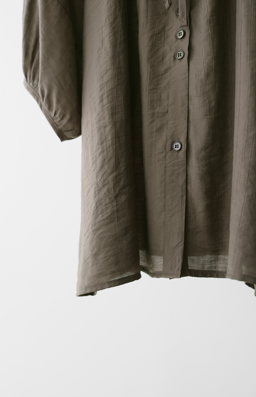 이 블라우스의 진정한 한 끗 포인트는 소매에서 이어지는 '입체적인 볼륨감'이에요. 팔뚝 살을 완벽하게 커버해 준답니다. 바람이 솔솔 잘 통하는 가벼운 소재라 입었을 때의 쾌적함은 물론, 시각적으로도 훨씬 가녀린 느낌을 선사해 드려요.
