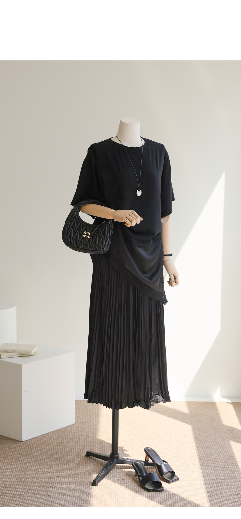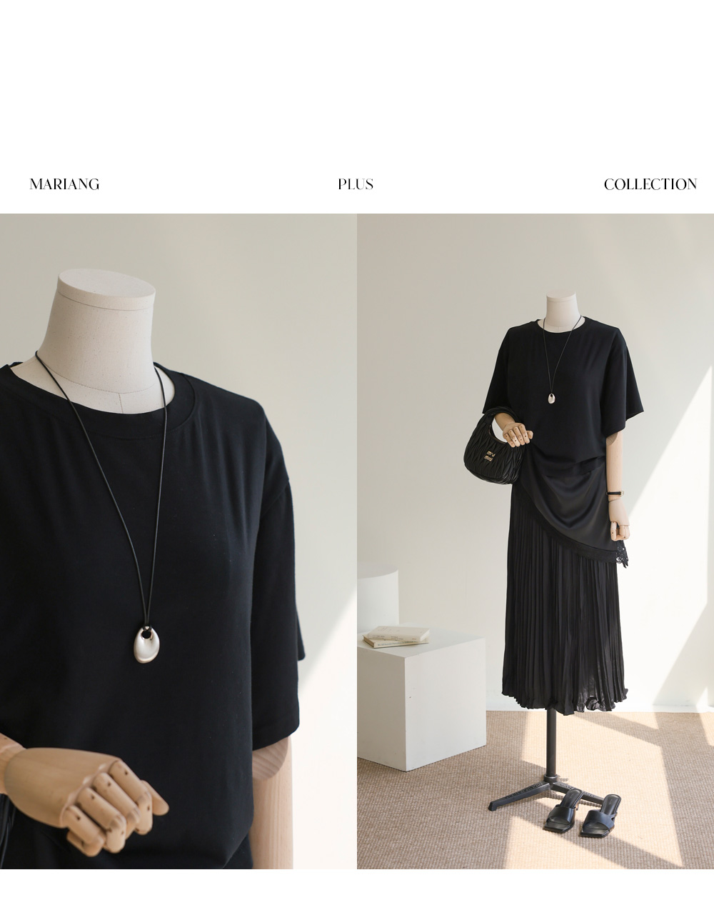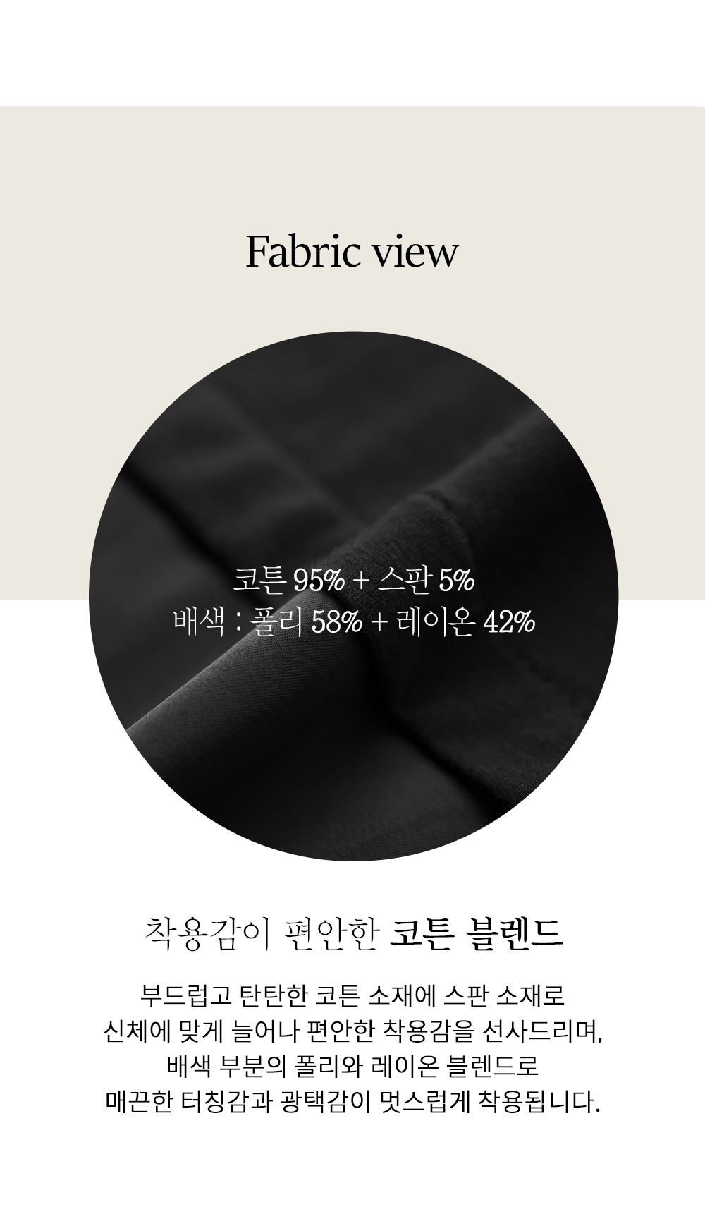 피부에 닿는 바디 부분은 부드러운 터칭감과 기분 좋은 신축성을 가진 코튼과 스판 소재를 혼방하여 장시간 착용에도 몸에 붙지 않고 쾌적함을 유지해 줘요. 밑단의 배색 부분은 탄탄하면서도 매끄러운 실키함이 느껴지는 폴리소재 블렌드로 구김 걱정을 덜어주며 은은하게 빛나는 광택감이 전체적인 룩의 품격을 한 층 더 높여준답니다. ![]() MD가 답하는 안심 Q&A