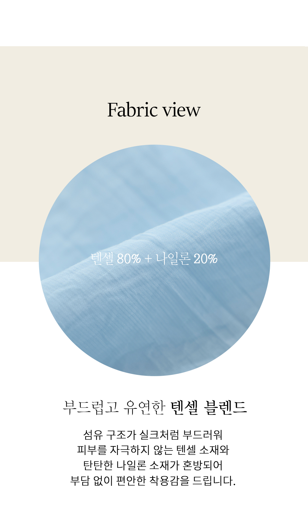탄탄하면서도 매끄러운 촉감이 돋보이는 텐셀과 나일론 혼방 소재를 사용했어요. 은은한 광택감이 감돌아 고급스러워 보일 뿐만 아니라, 피부에 닿을 때 청량한 느낌을 주어 쾌적하게 착용하기 좋구요. 늘어짐 걱정 없이 핏을 딱 잡아주는 탄탄함 덕분에 오랫동안 깔끔한 실루엣을 유지하며 즐기실 수 있답니다. ![]() MD가 답하는 안심 Q&A