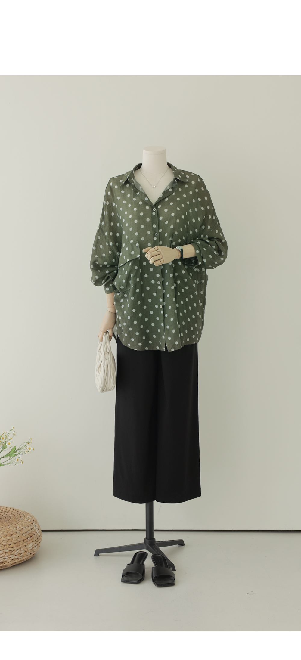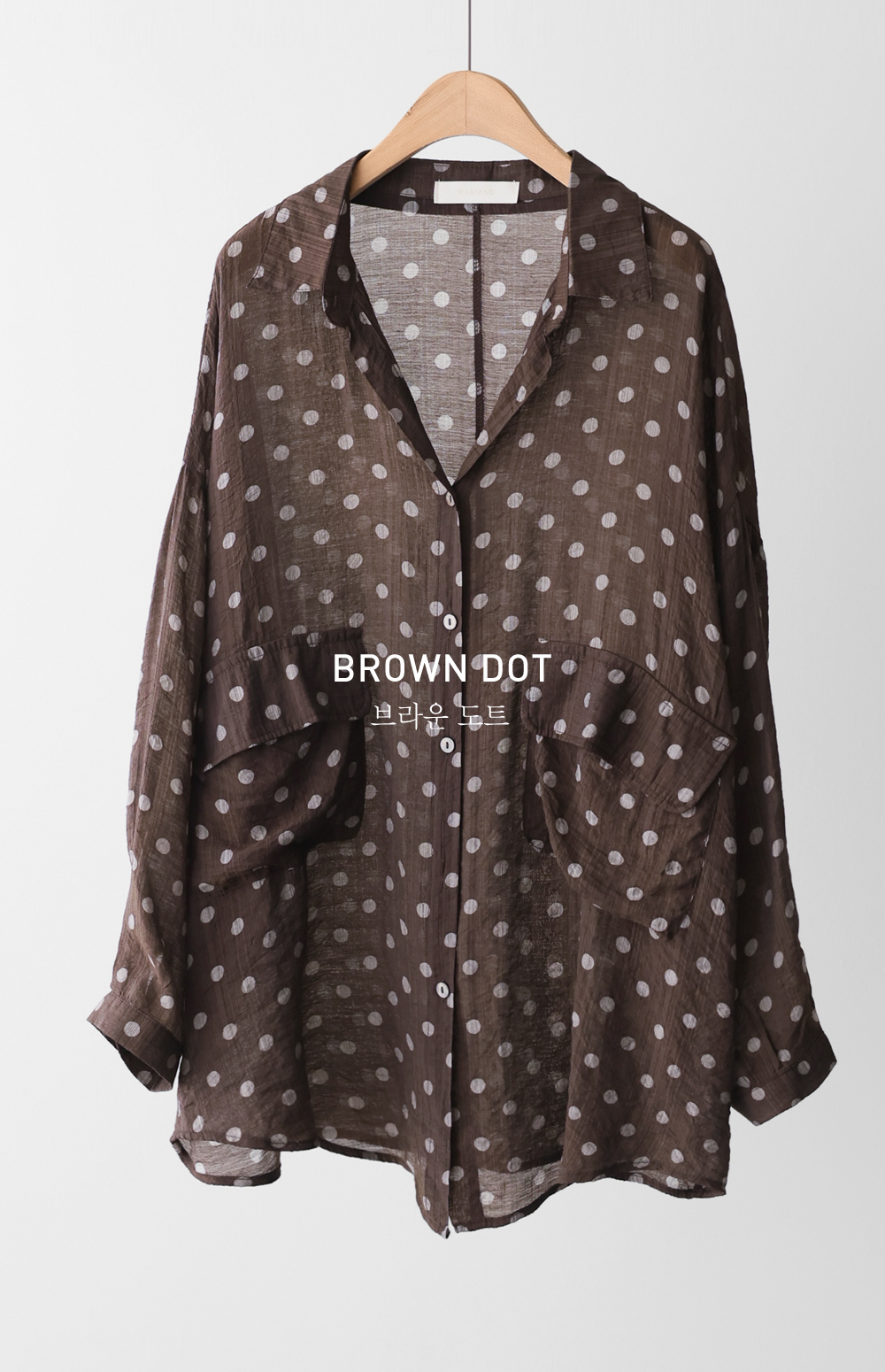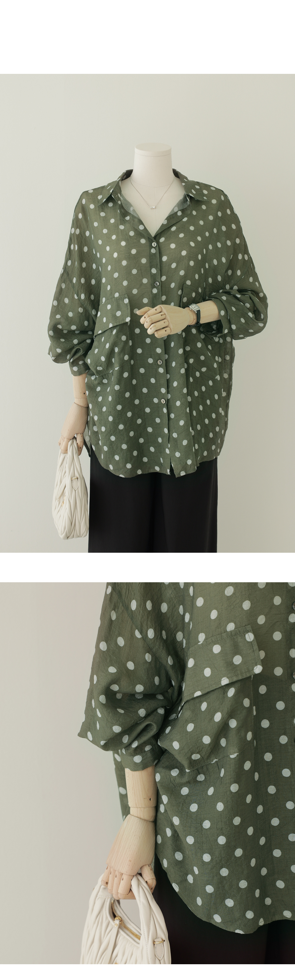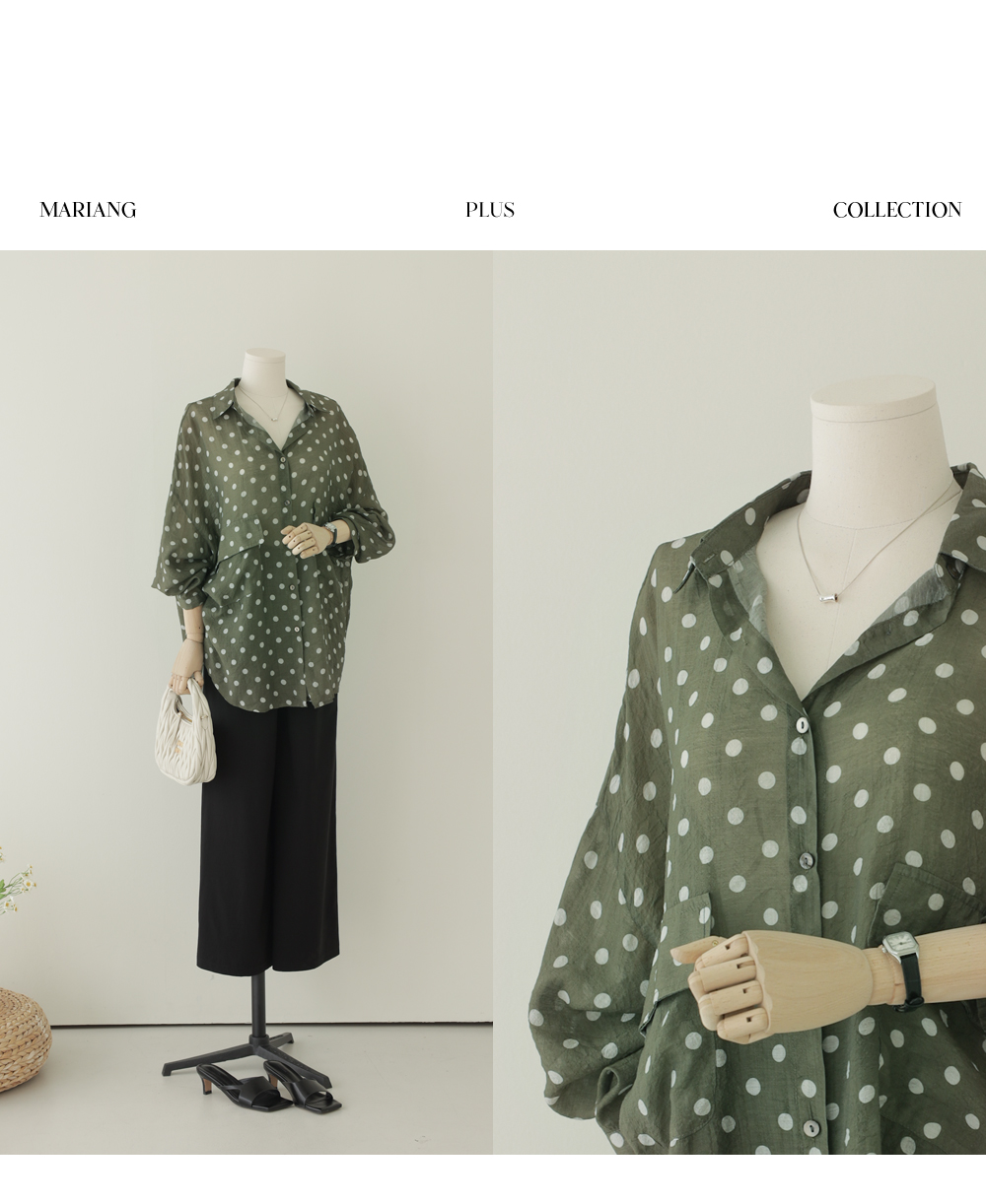 셔츠는 자칫 딱딱해 보일 수 있지만, 패턴과 소재에 따라 분위기가 확 달라지죠. 이번 아이템은 마리앙플러스에서 단독으로 진행하는 러블리한 도트 패턴 셔츠예요. 하늘하늘하게 떨어지는 실루엣 덕분에 입었을 때 상체 라인이 정말 가냘퍼 보인답니다.