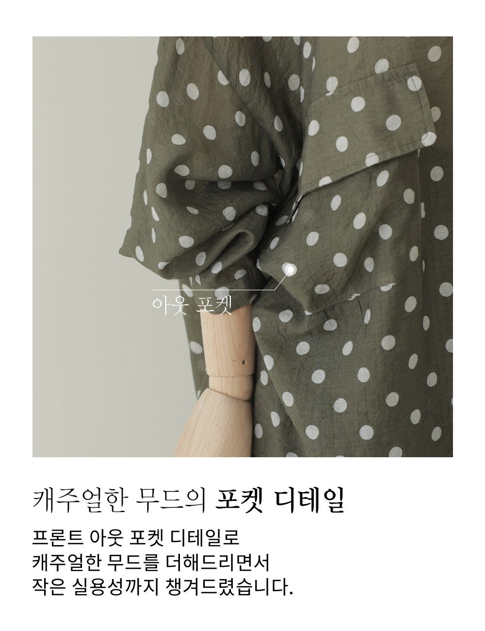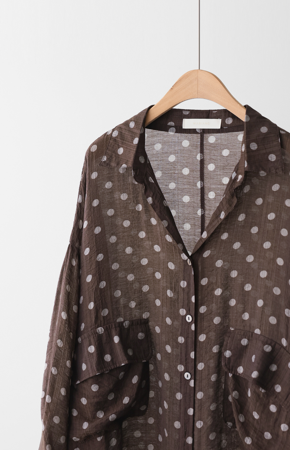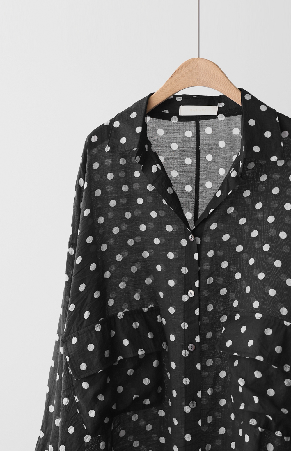 셔츠는 자칫 딱딱해 보일 수 있지만, 패턴과 소재에 따라 분위기가 확 달라지죠. 이번 아이템은 마리앙플러스에서 단독으로 진행하는 러블리한 도트 패턴 셔츠예요. 하늘하늘하게 떨어지는 실루엣 덕분에 입었을 때 상체 라인이 정말 가냘퍼 보인답니다.