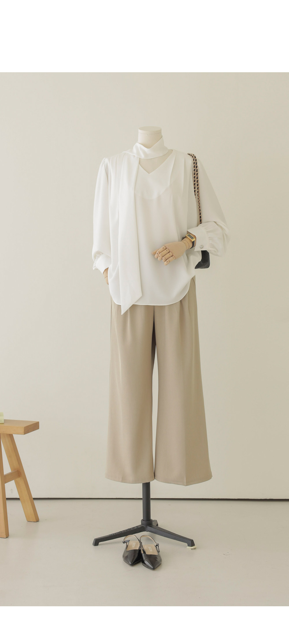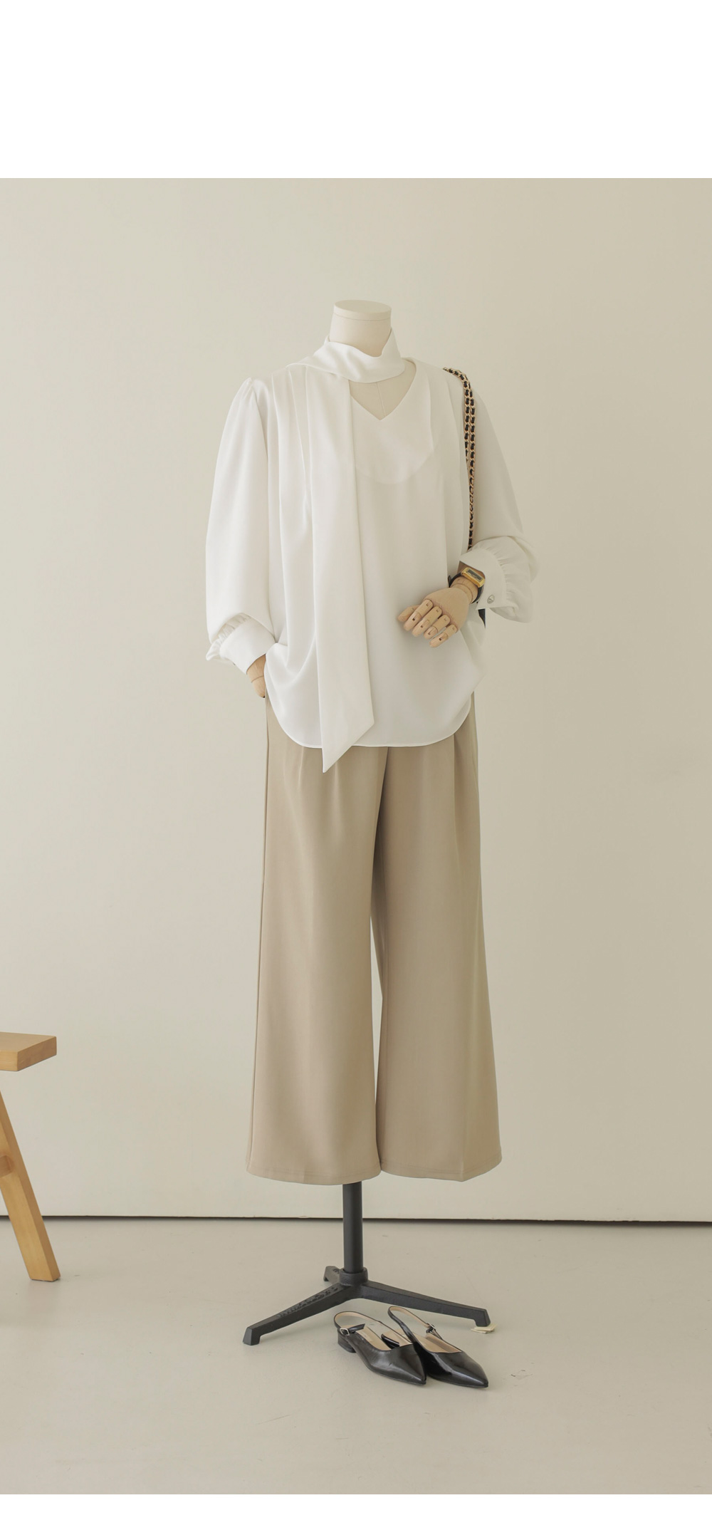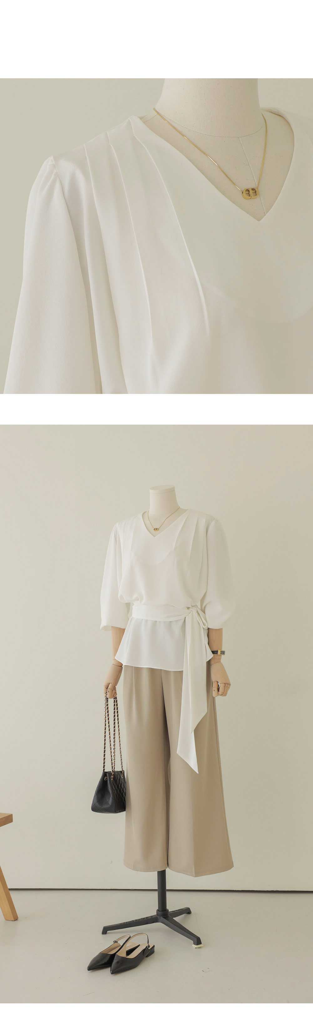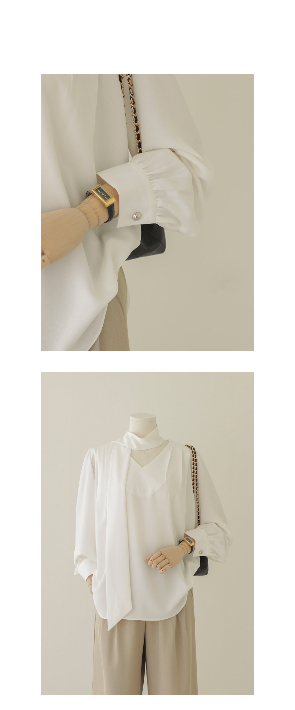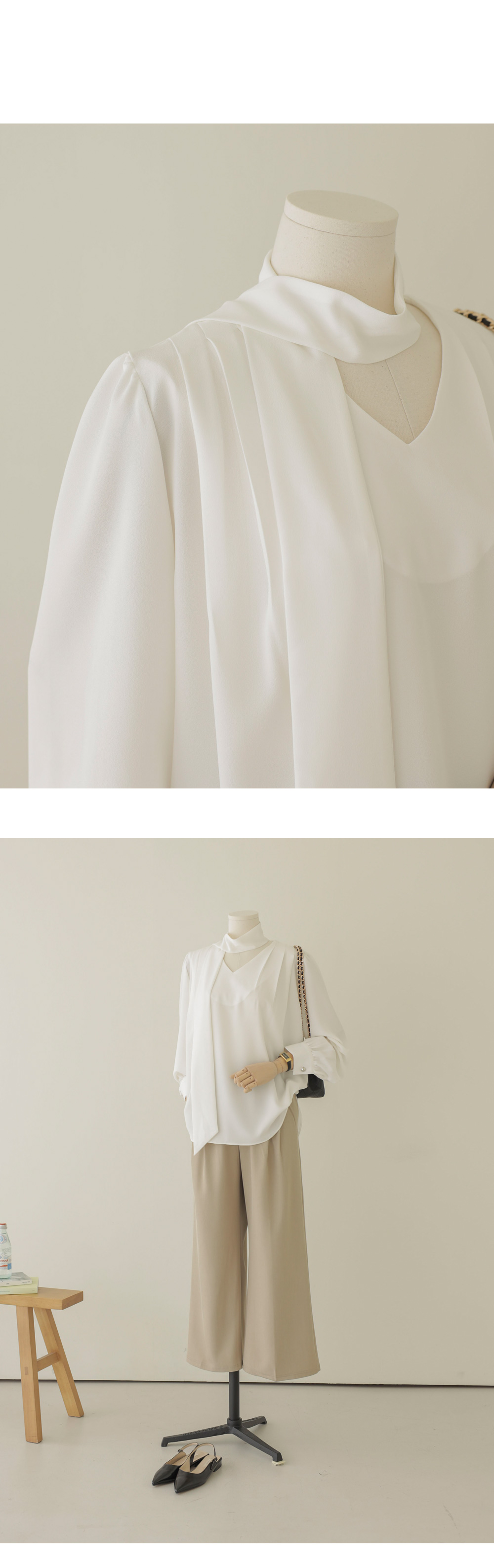 코디가 어려운 날, 이 블라우스 하나면 고민 끝이에요. 이번 아이템은 깊지 않은 브이넥 라인에 탈착 가능한 스카프가 세트로 구성되어 있어 활용도가 정말 높답니다.