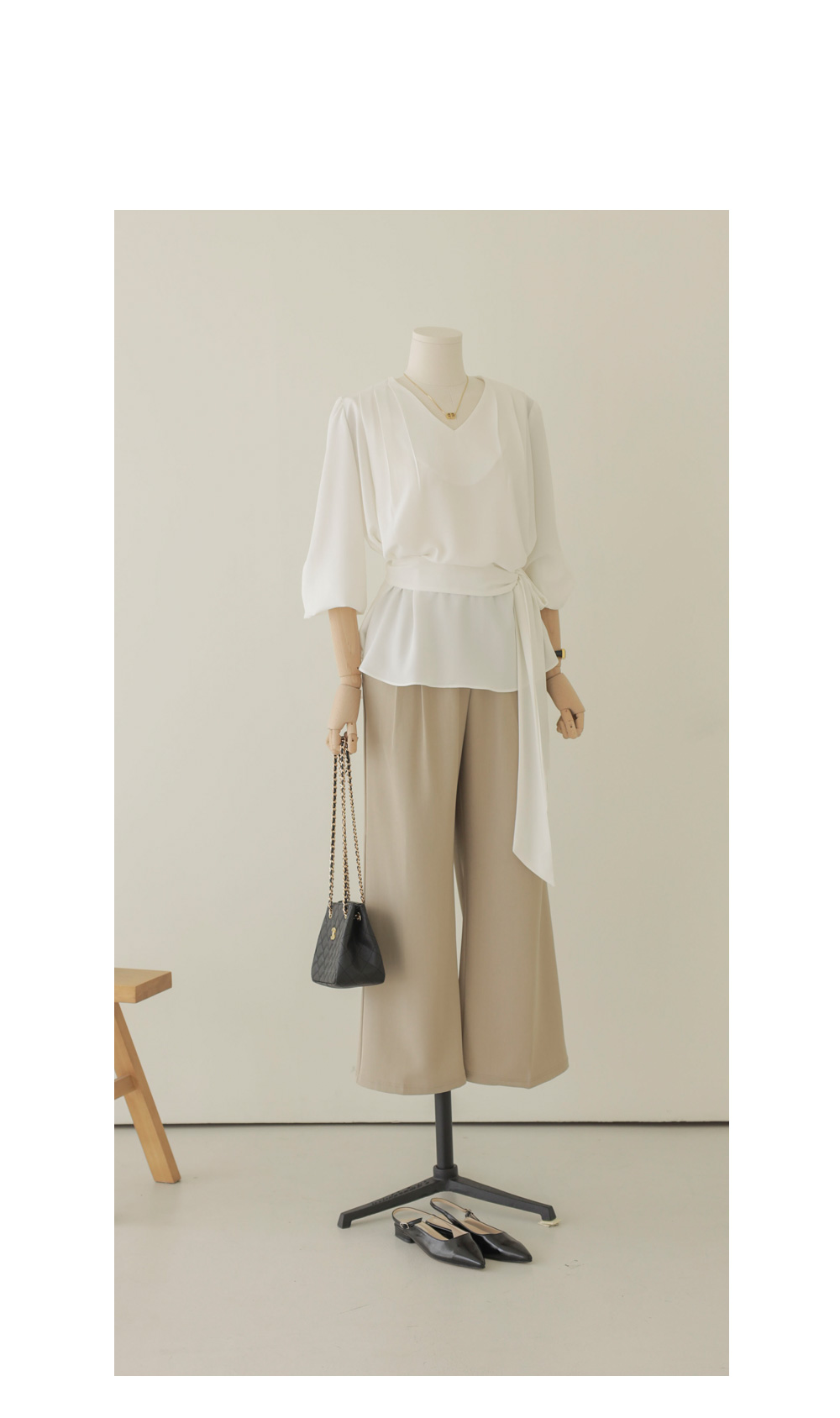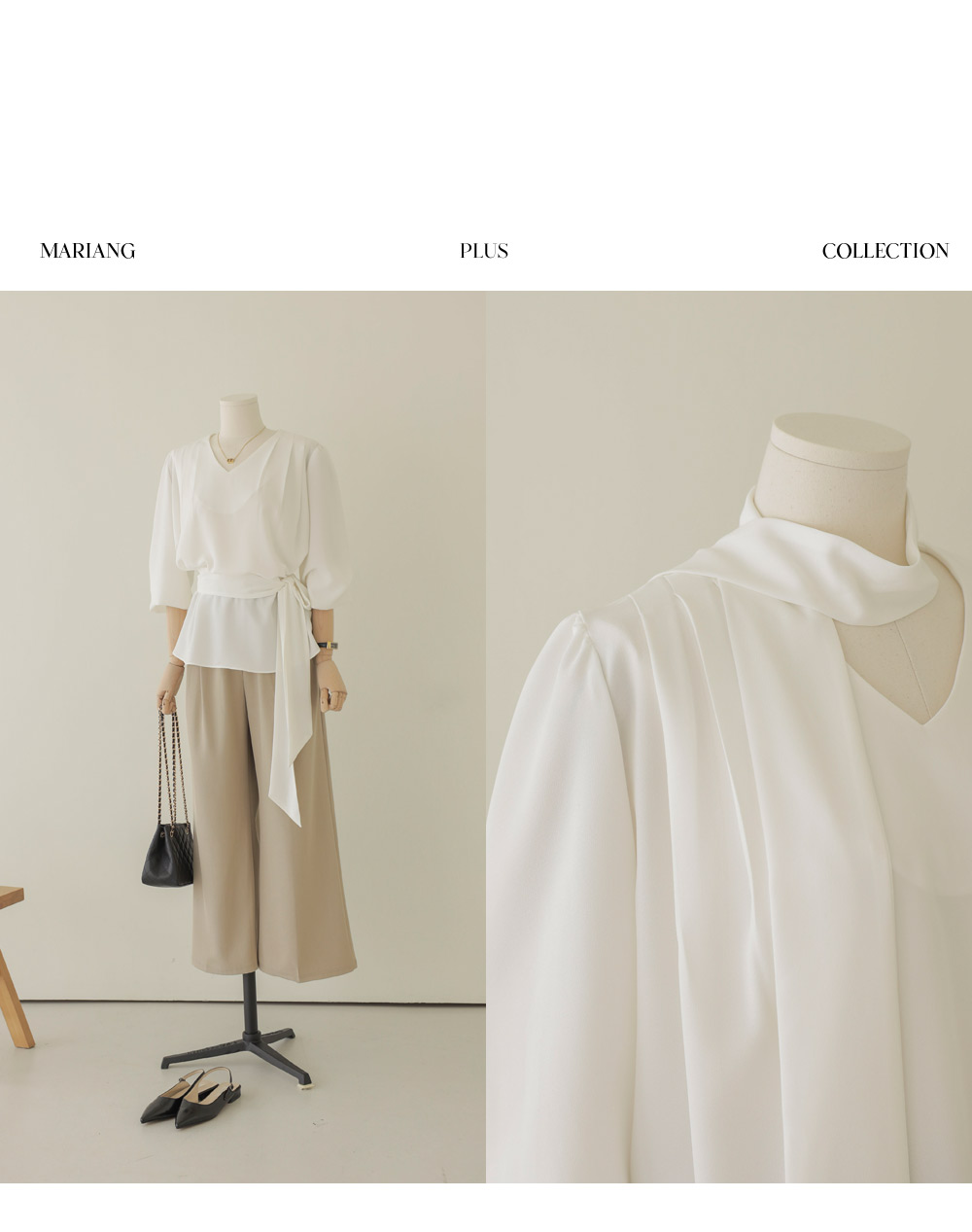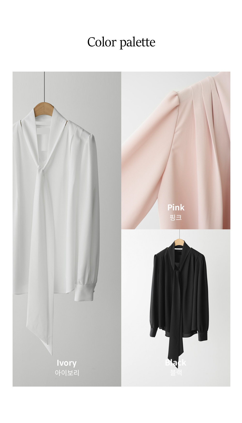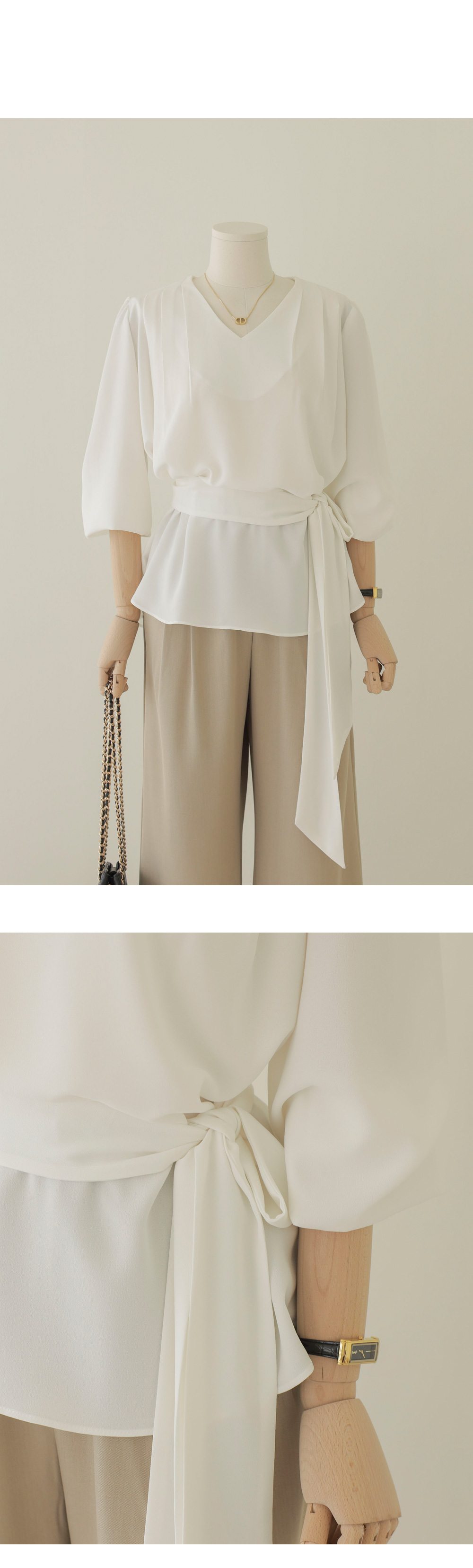 코디가 어려운 날, 이 블라우스 하나면 고민 끝이에요. 이번 아이템은 깊지 않은 브이넥 라인에 탈착 가능한 스카프가 세트로 구성되어 있어 활용도가 정말 높답니다.