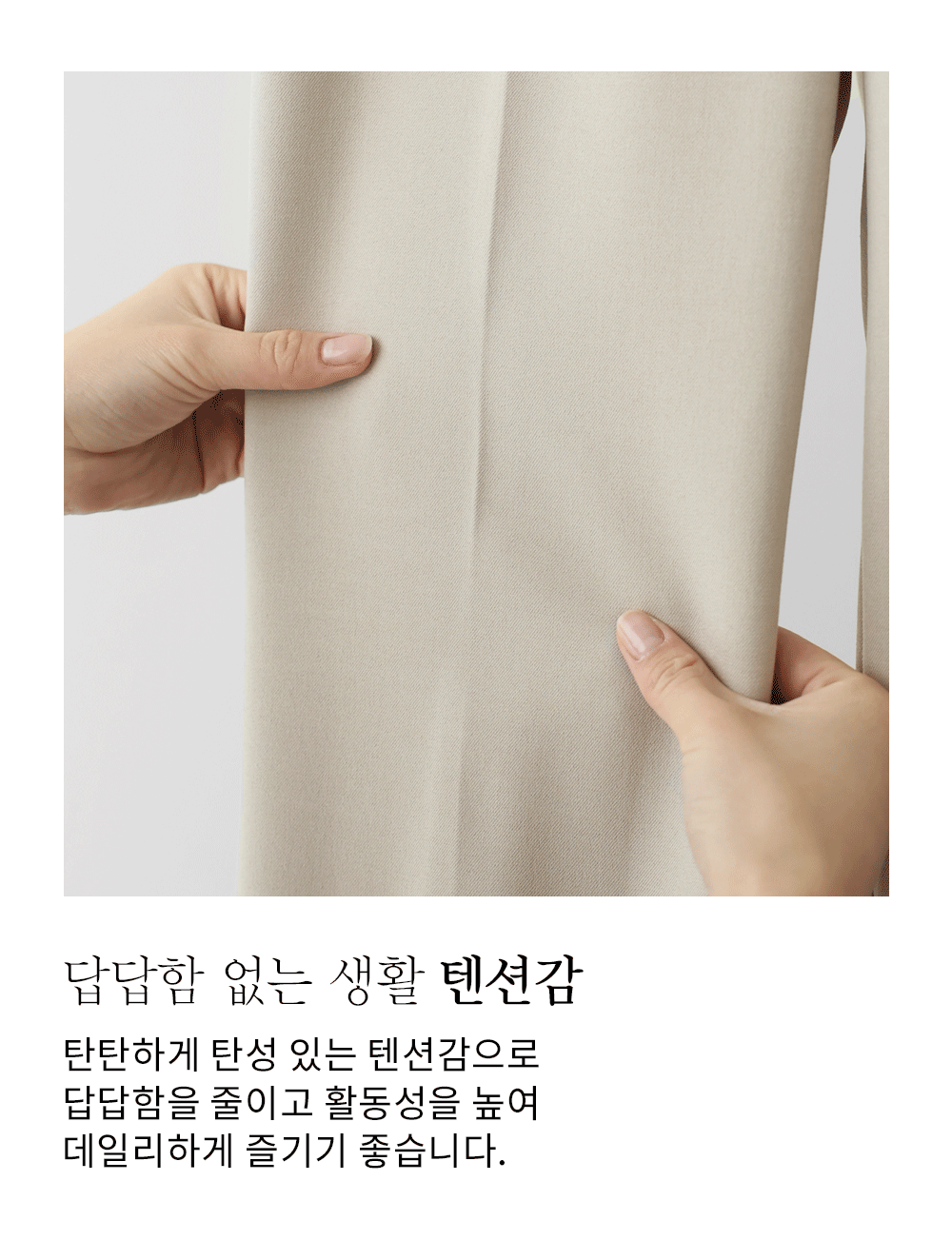 매끄러운 촉감의 **폴리 95%**에 고탄성 **스판 5%**를 혼합하여 제작한 고퀄리티 원단이에요. 소재 특유의 찰랑거리는 드레이프성 덕분에 다리에 감기지 않고 쾌적하며, 5%의 높은 스판 함유량으로 신축성이 매우 좋아 활동량이 많은 날에도 피로감이 현저히 적답니다. 구김에 강한 소재라 장시간 의자에 앉아 있어도 무릎이나 힙 부분에 미운 주름이 잘 생기지 않아 관리가 정말 쉬운 소재예요. ![]() 밴딩 가이드 보러가기→ ![]() MD가 답하는 안심 Q&A