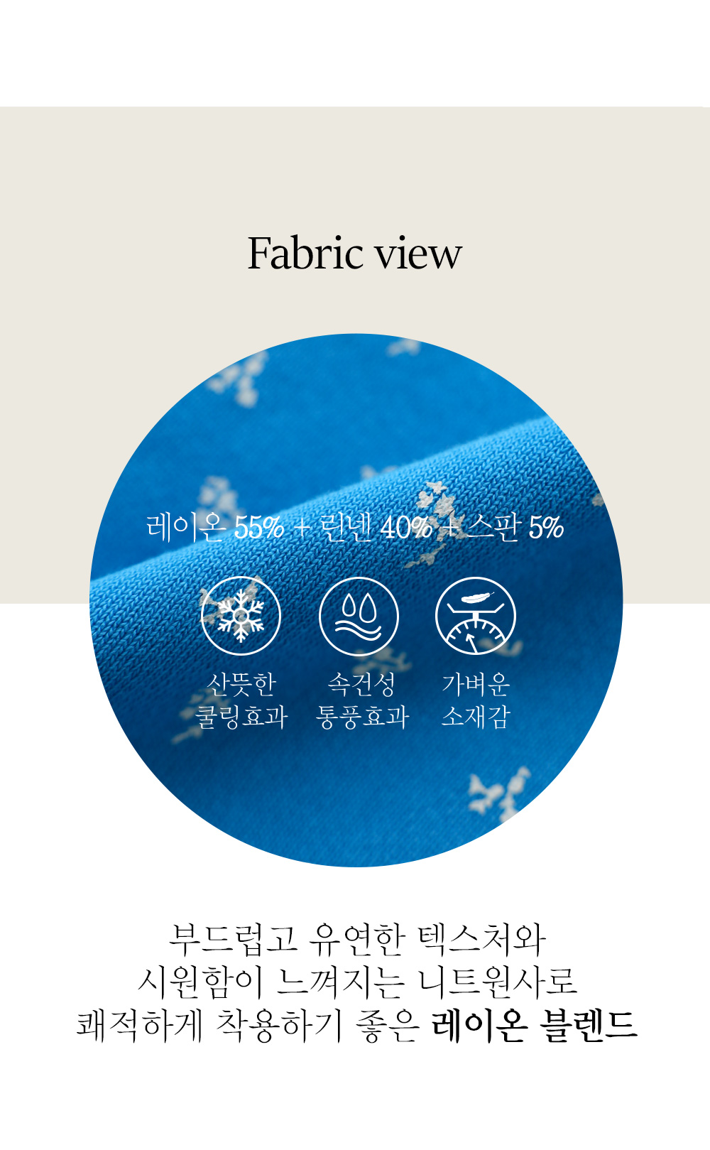 수분 흡수와 발산이 빠른 린넨에 부드러운 레이온을 혼합해 피부 자극을 최소화했어요. 린넨 특유의 쾌적함 덕분에 습도가 높은 날에도 피부에 끈적하게 붙지 않으며, 비침 걱정 없는 적당한 두께감으로 안감 없이도 단독 착용이 가능하답니다. 스판 함유로 쫀쫀한 탄성력이 느껴지며, 세탁 후에도 형태 변형이 적어 관리가 수월한 고퀄리티 원사예요. ![]() MD가 답하는 안심 Q&A
