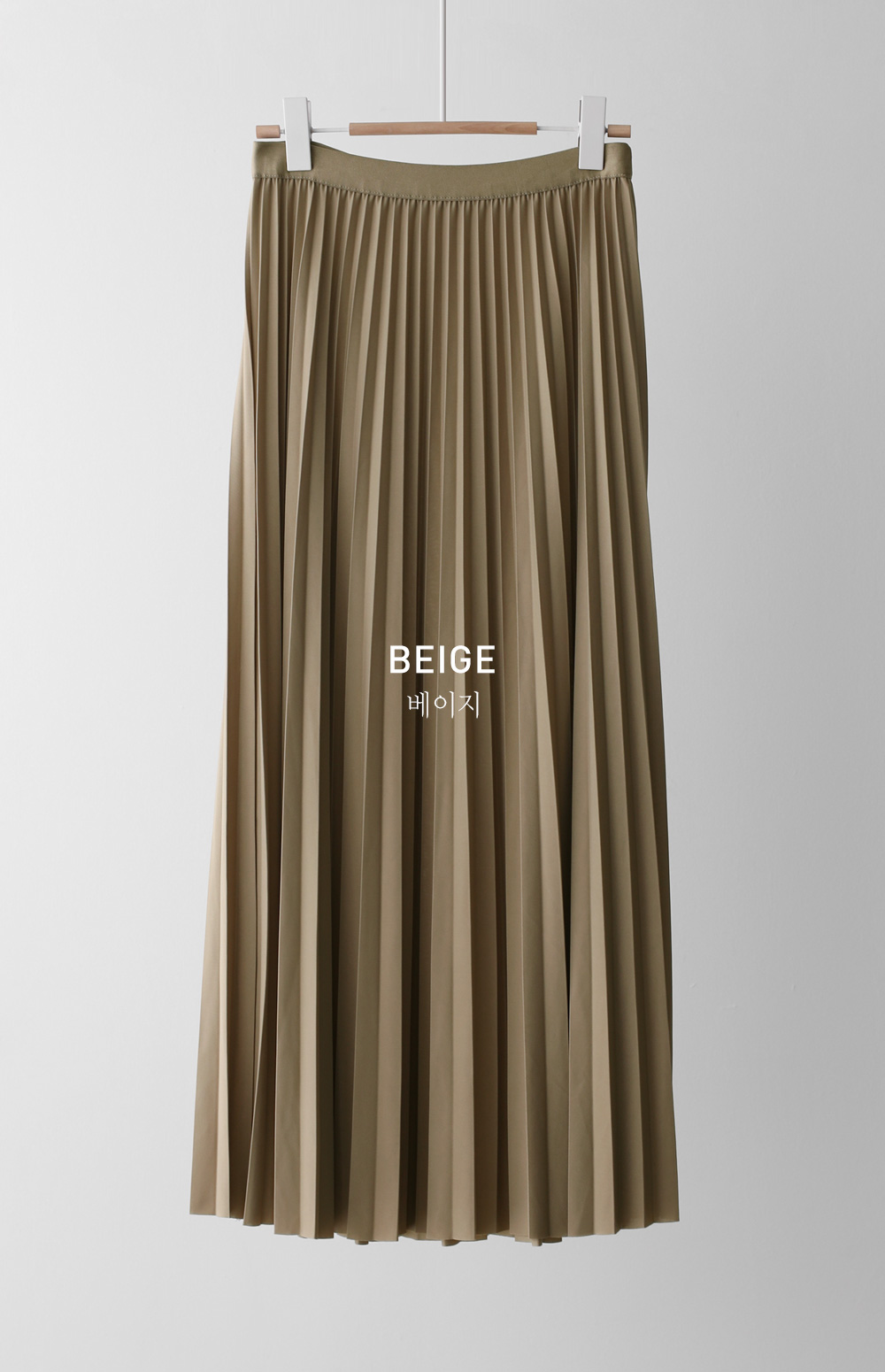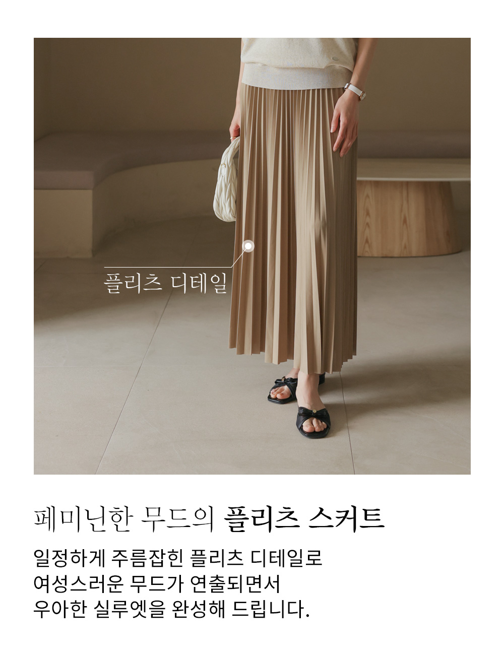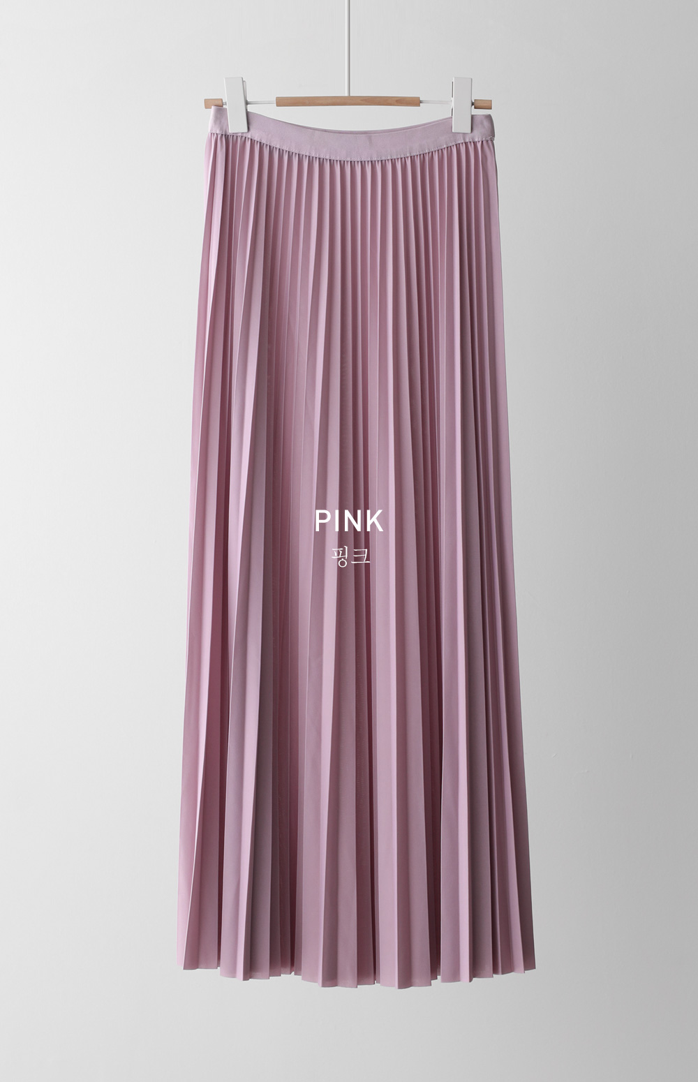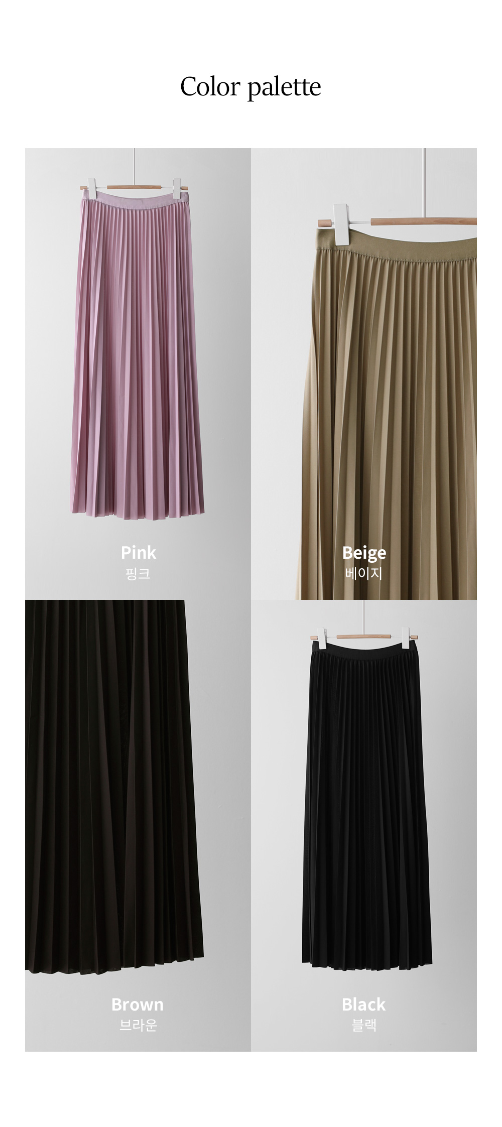 섬세하게 잡힌 플리츠 디자인에 고급스러운 광택감이 더해진 스커트예요. 화사하게 포인트 주기 좋은 핑크, 차분하고 이지적인 브라운, 어디에나 매치하기 쉬운 기본 블랙, 그리고 부드러운 감성의 베이지까지 총 4가지 컬러로 구성되어 취향에 맞게 선택하기 좋구요.