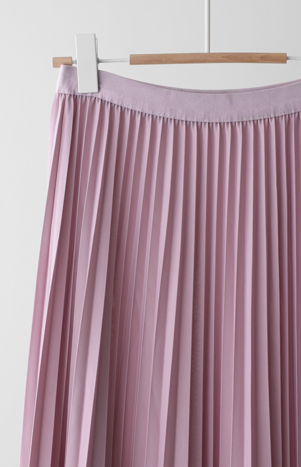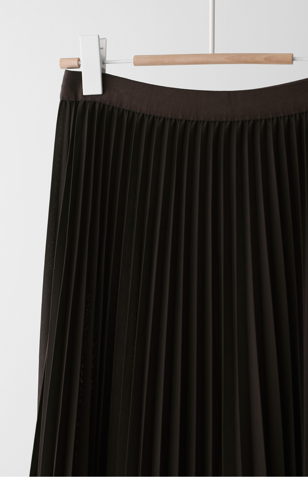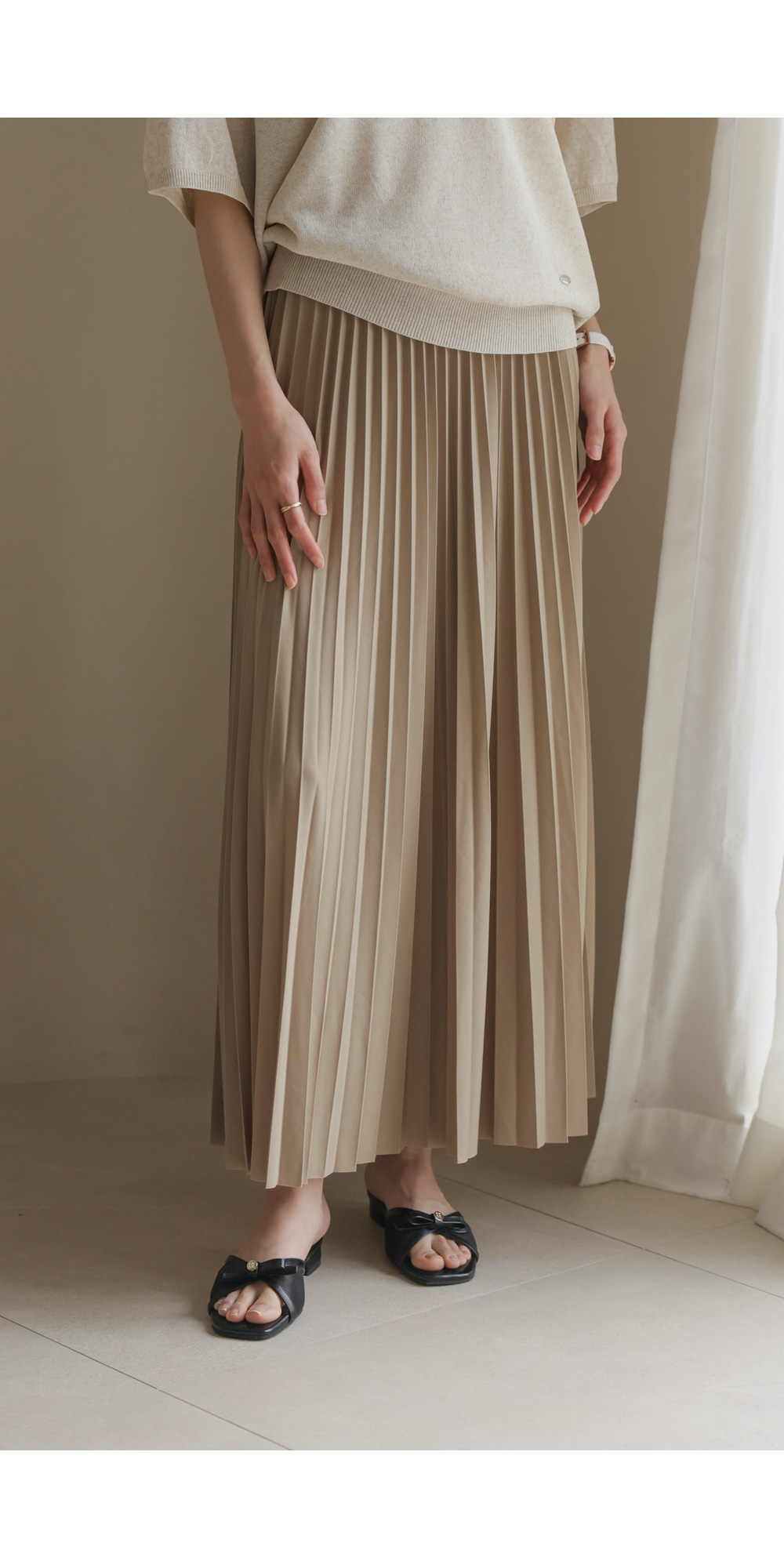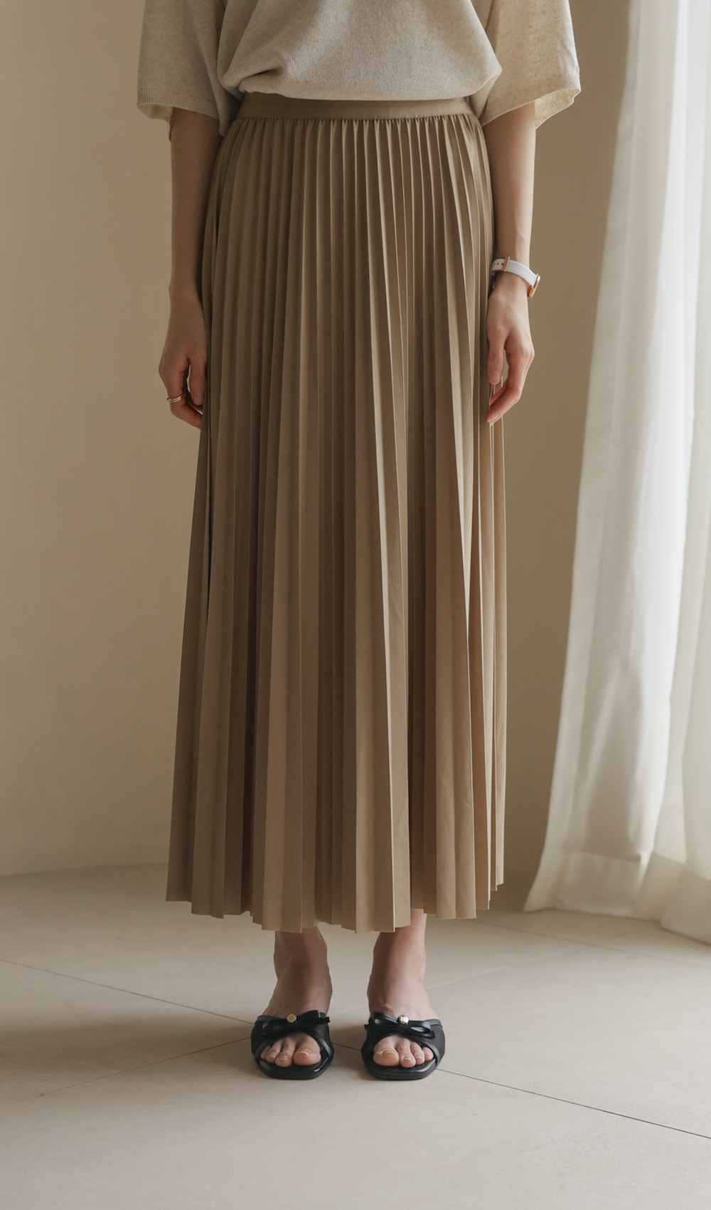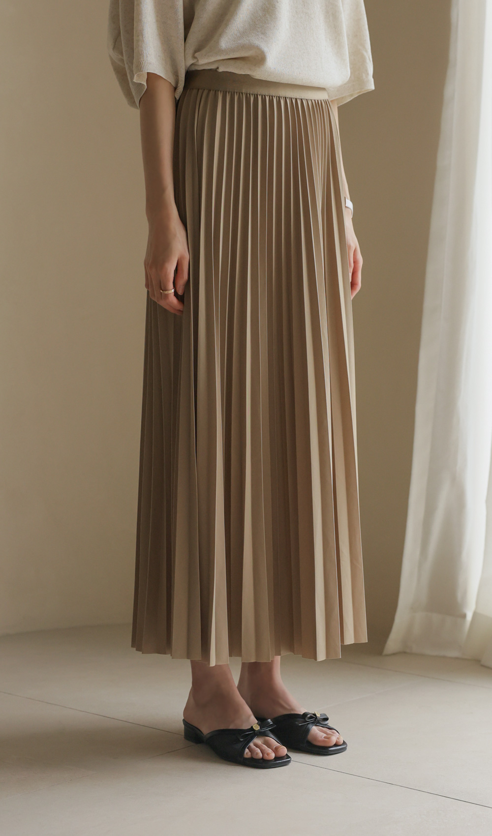 섬세하게 잡힌 플리츠 디자인에 고급스러운 광택감이 더해진 스커트예요. 화사하게 포인트 주기 좋은 핑크, 차분하고 이지적인 브라운, 어디에나 매치하기 쉬운 기본 블랙, 그리고 부드러운 감성의 베이지까지 총 4가지 컬러로 구성되어 취향에 맞게 선택하기 좋구요.