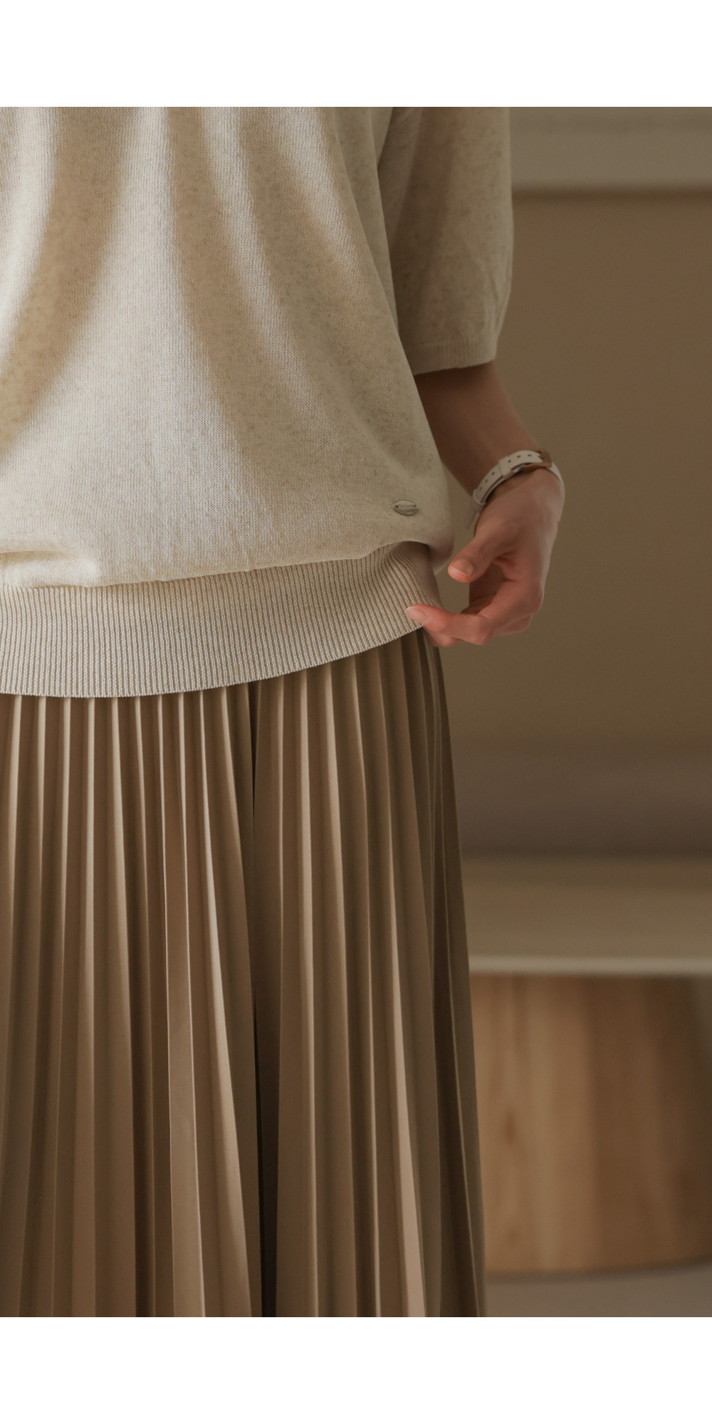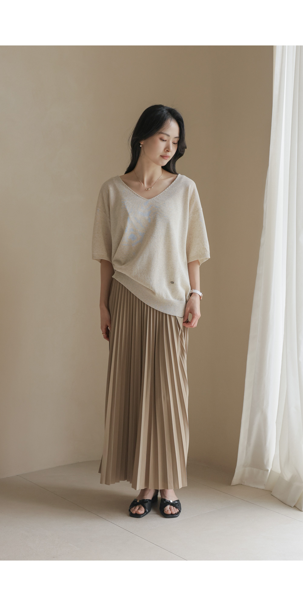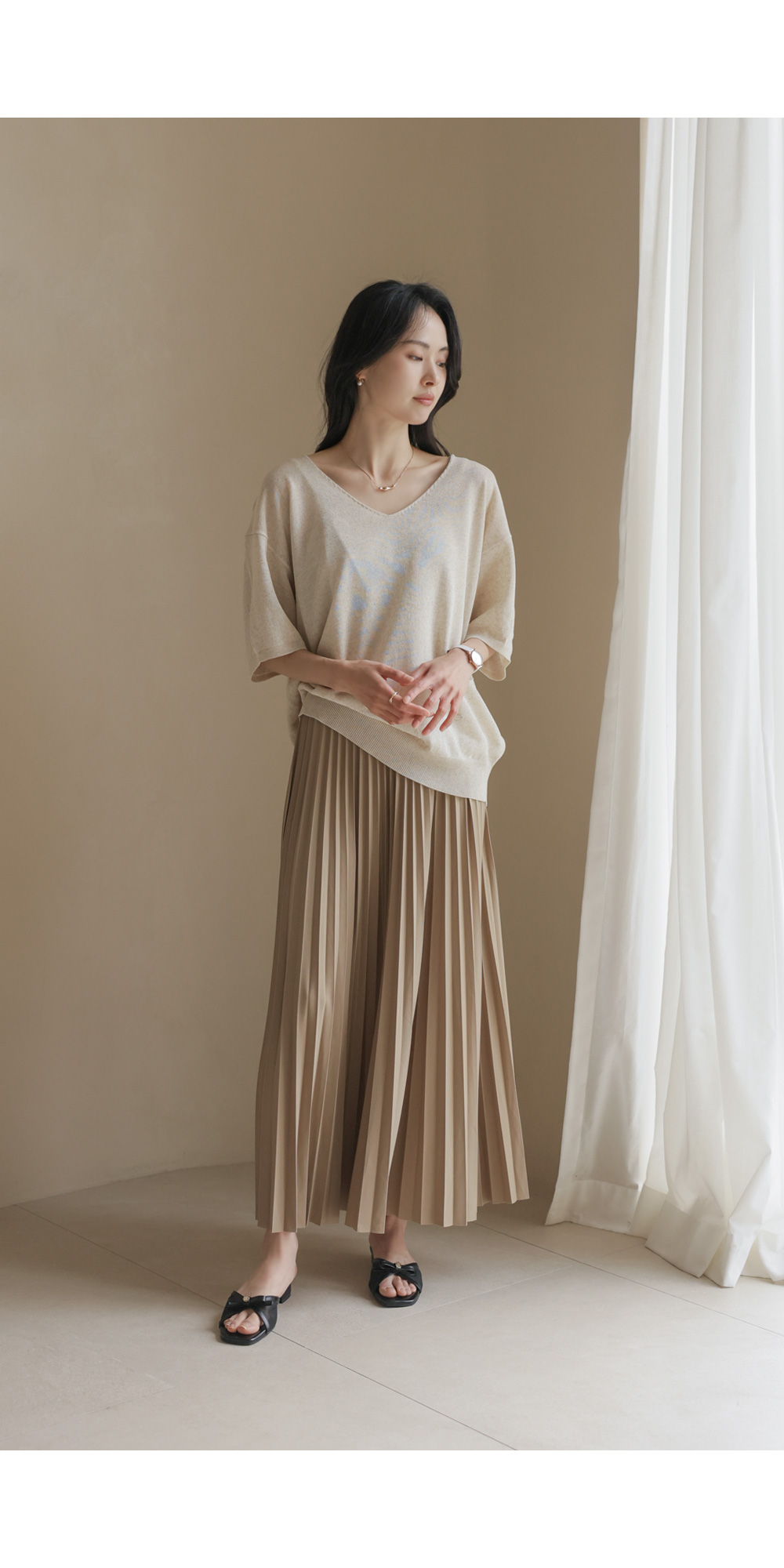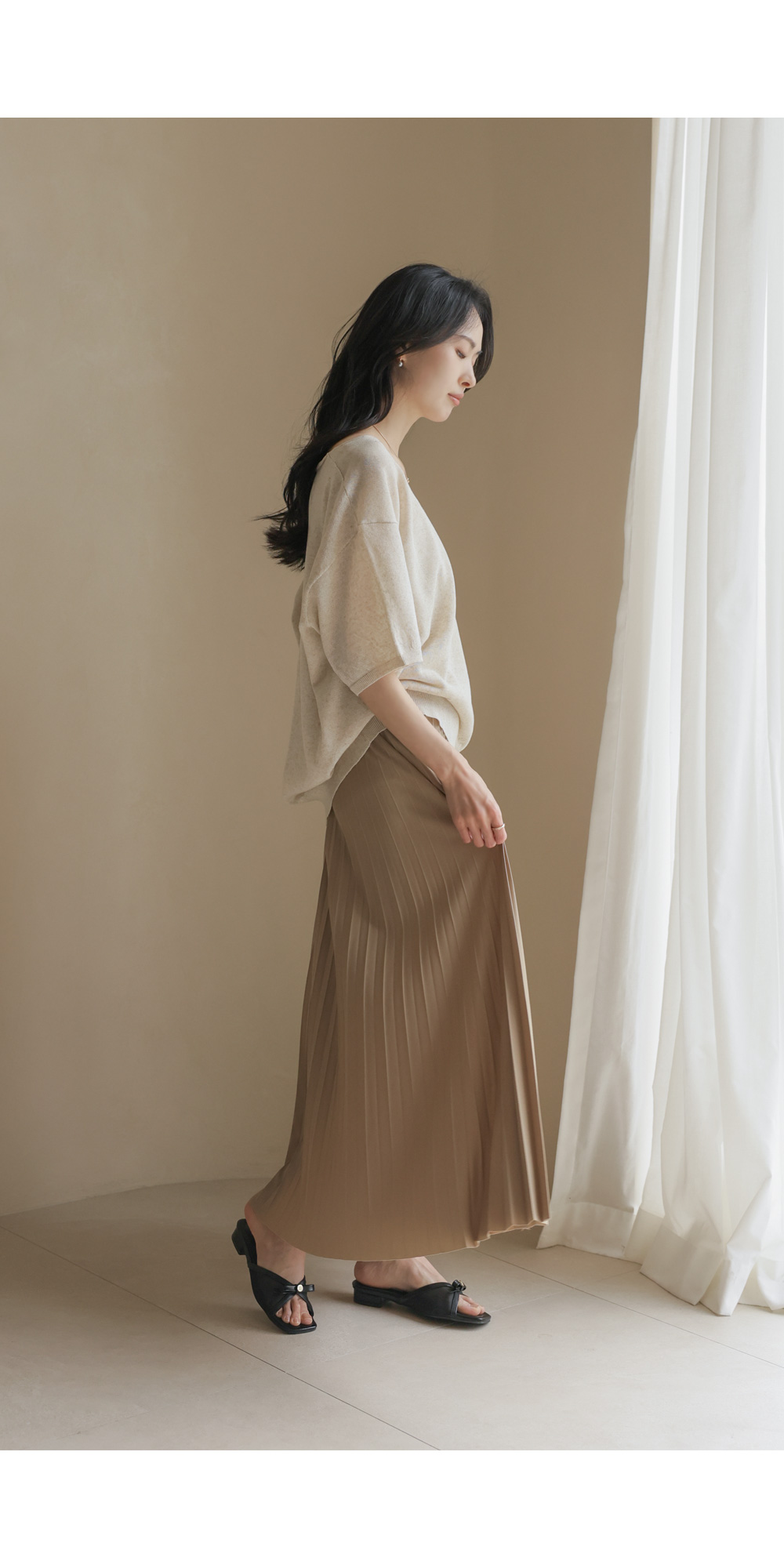 섬세하게 잡힌 플리츠 디자인에 고급스러운 광택감이 더해진 스커트예요. 화사하게 포인트 주기 좋은 핑크, 차분하고 이지적인 브라운, 어디에나 매치하기 쉬운 기본 블랙, 그리고 부드러운 감성의 베이지까지 총 4가지 컬러로 구성되어 취향에 맞게 선택하기 좋구요.