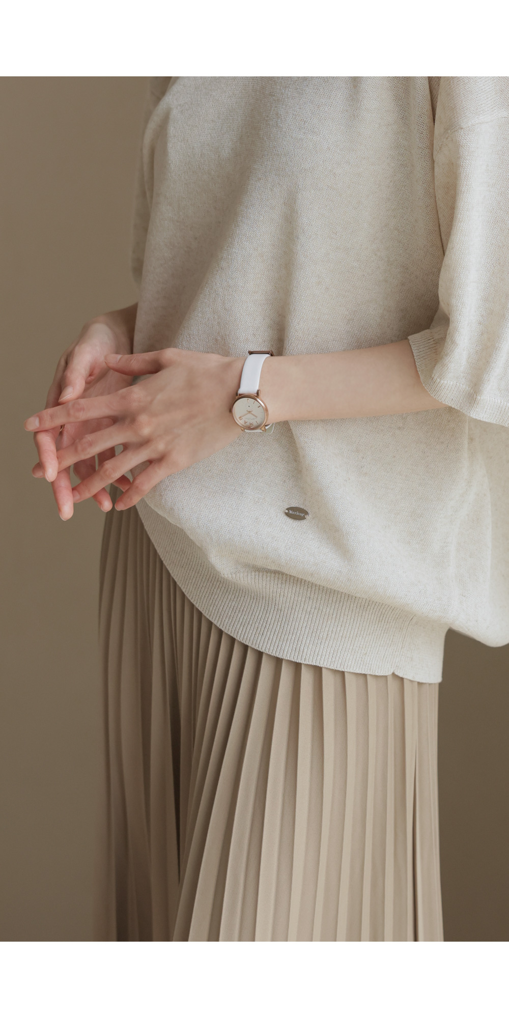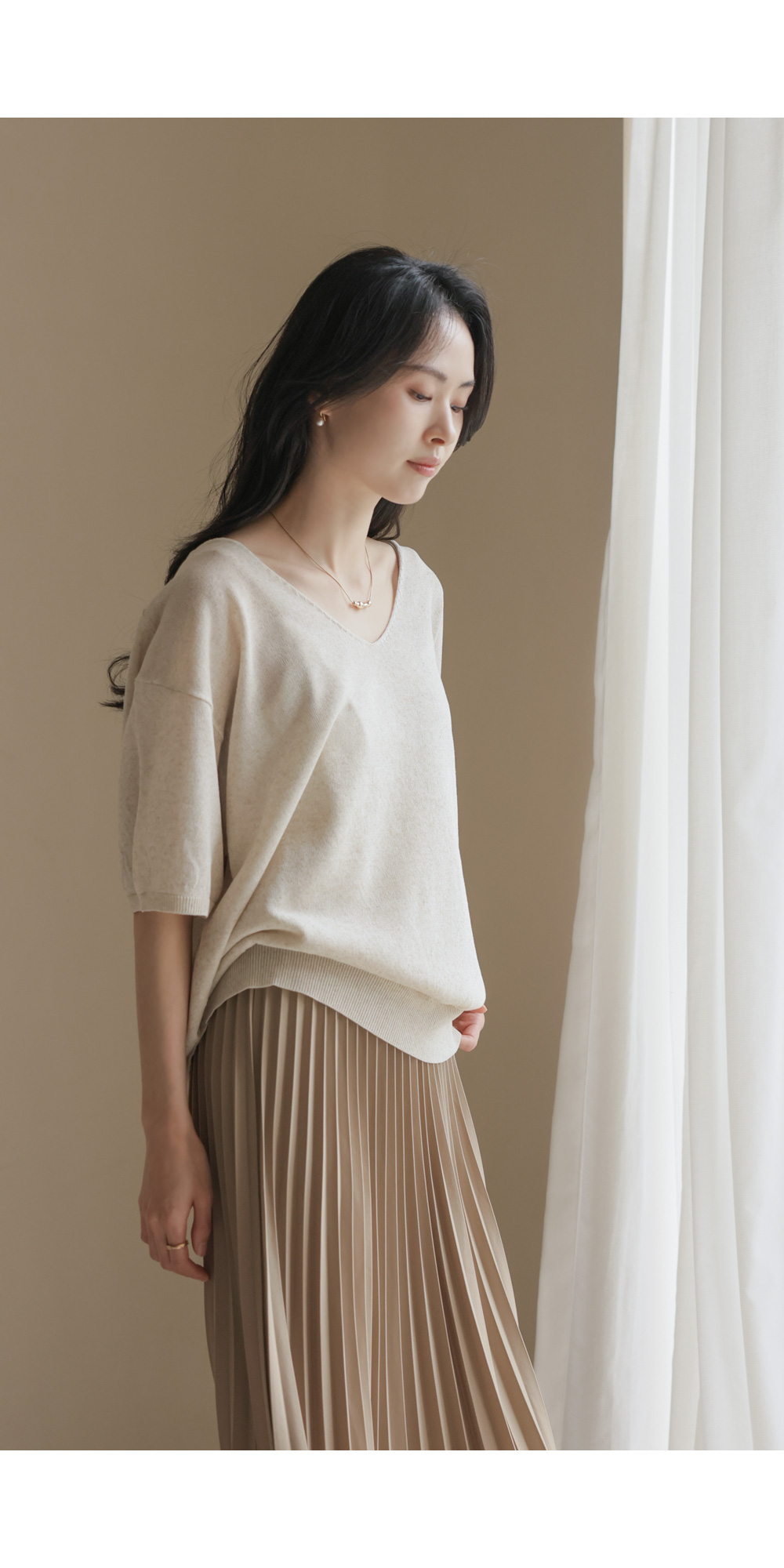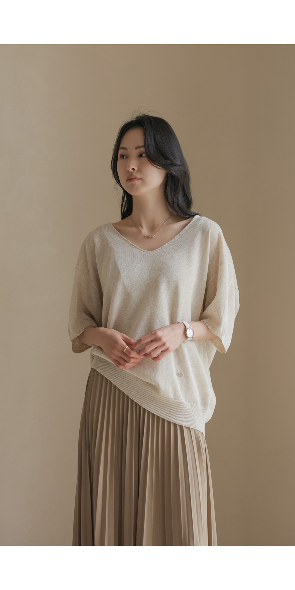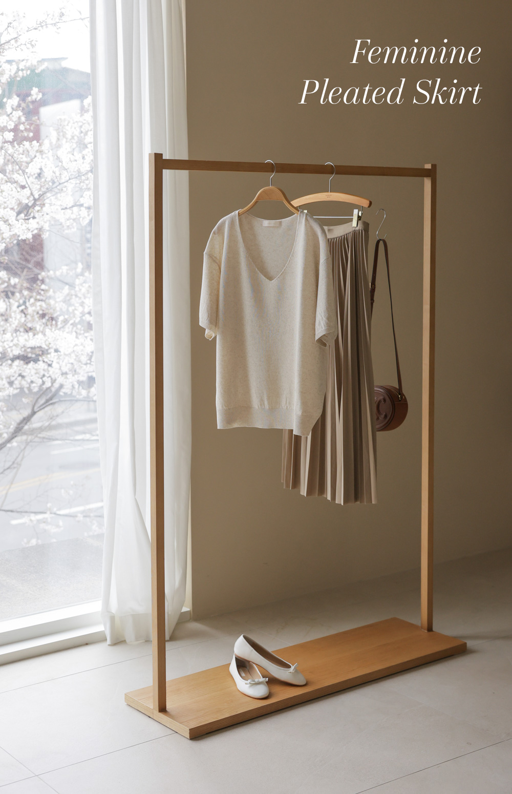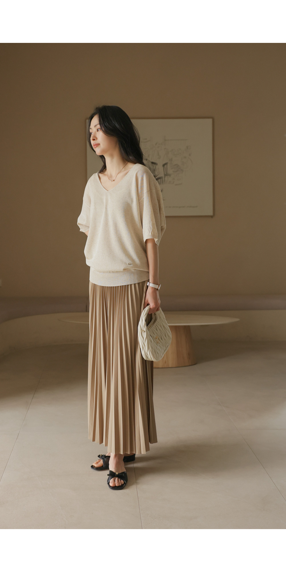 섬세하게 잡힌 플리츠 디자인에 고급스러운 광택감이 더해진 스커트예요. 화사하게 포인트 주기 좋은 핑크, 차분하고 이지적인 브라운, 어디에나 매치하기 쉬운 기본 블랙, 그리고 부드러운 감성의 베이지까지 총 4가지 컬러로 구성되어 취향에 맞게 선택하기 좋구요.