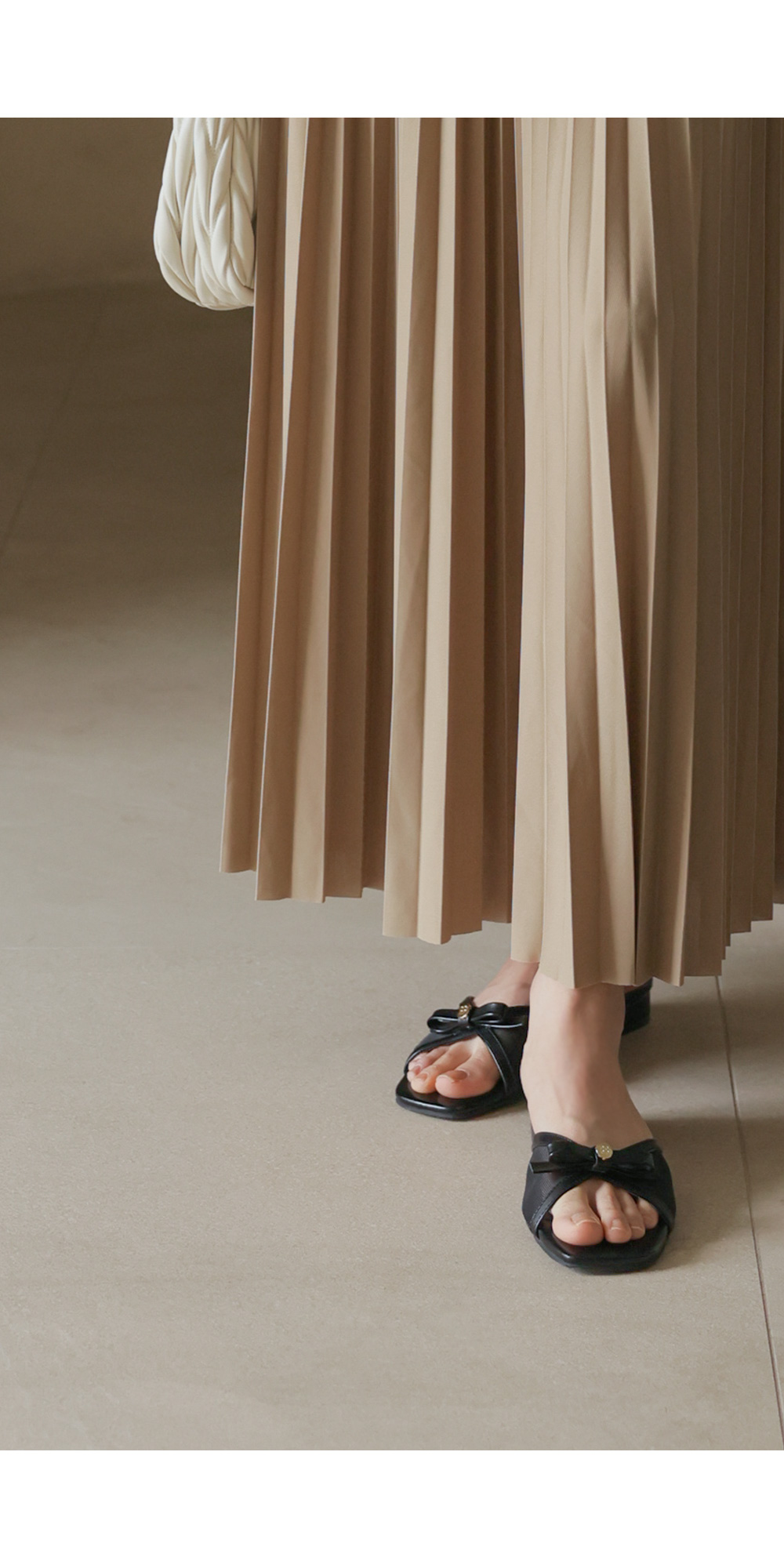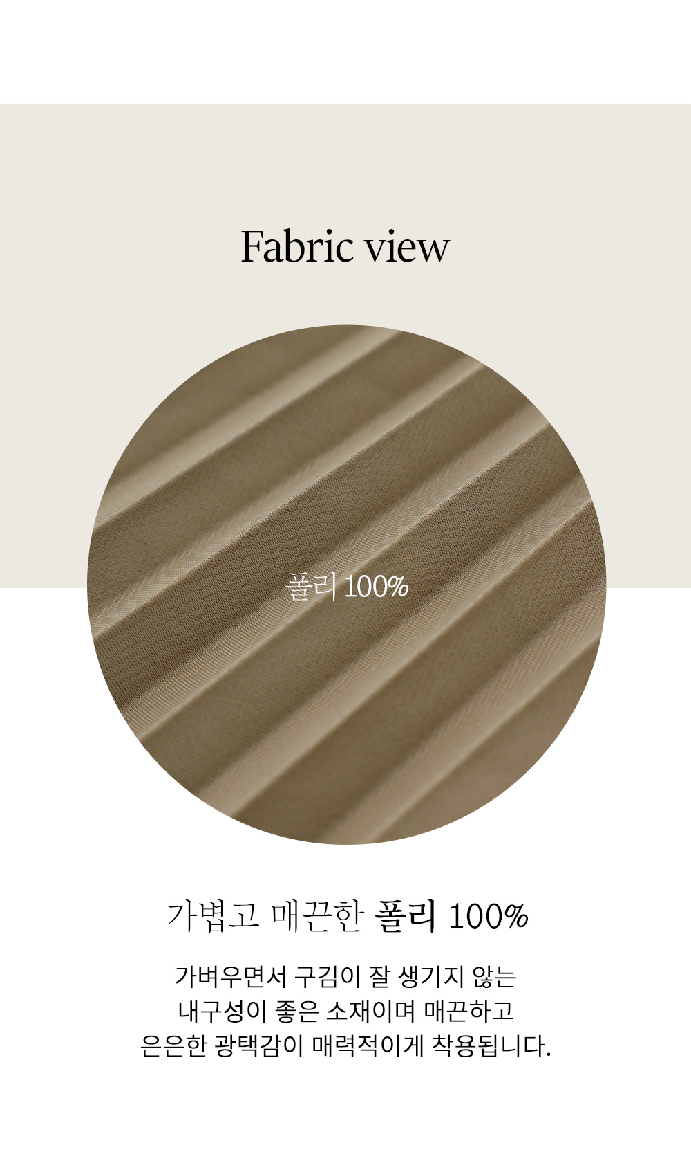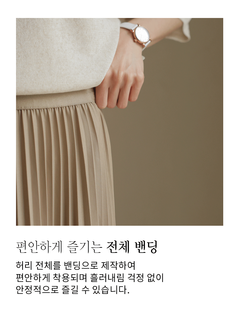 매끈한 터칭감을 가진 고퀄리티 폴리 원단을 사용했어요. 원단 표면에 감도는 은은한 광택감이 플리츠 주름 사이사이로 빛과 그림자의 대비를 선명하게 만들어주어, 평면적인 느낌 없이 풍성하고 생동감 있는 실루엣을 완성해 준답니다. 구김이 잘 가지 않는 소재 특성상 장시간 앉아 있다가 일어나도 플리츠 주름이 변함없이 탄탄하게 유지되구요. 피부에 들러붙지 않고 부드럽게 흐르는 듯한 감촉 덕분에 쾌적하고 기분 좋은 착용감을 하루 종일 느끼실 수 있어요. ![]() 밴딩 가이드 보러가기→ ![]() MD가 답하는 안심 Q&A
