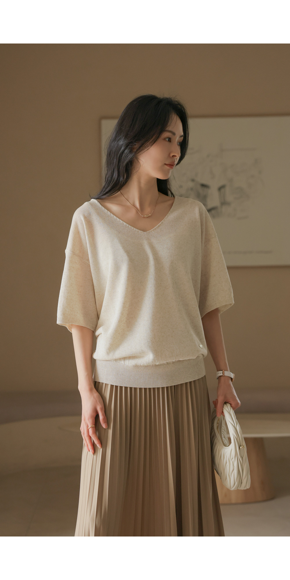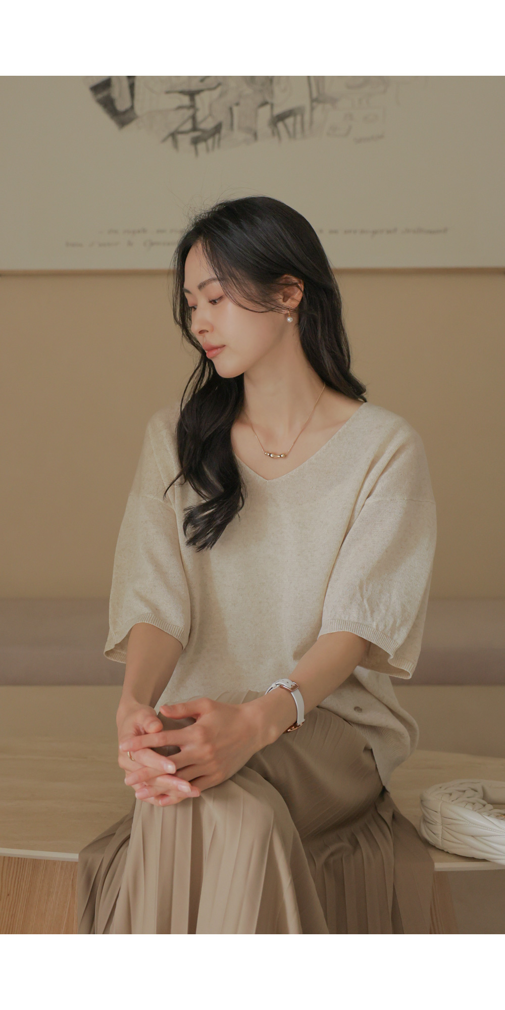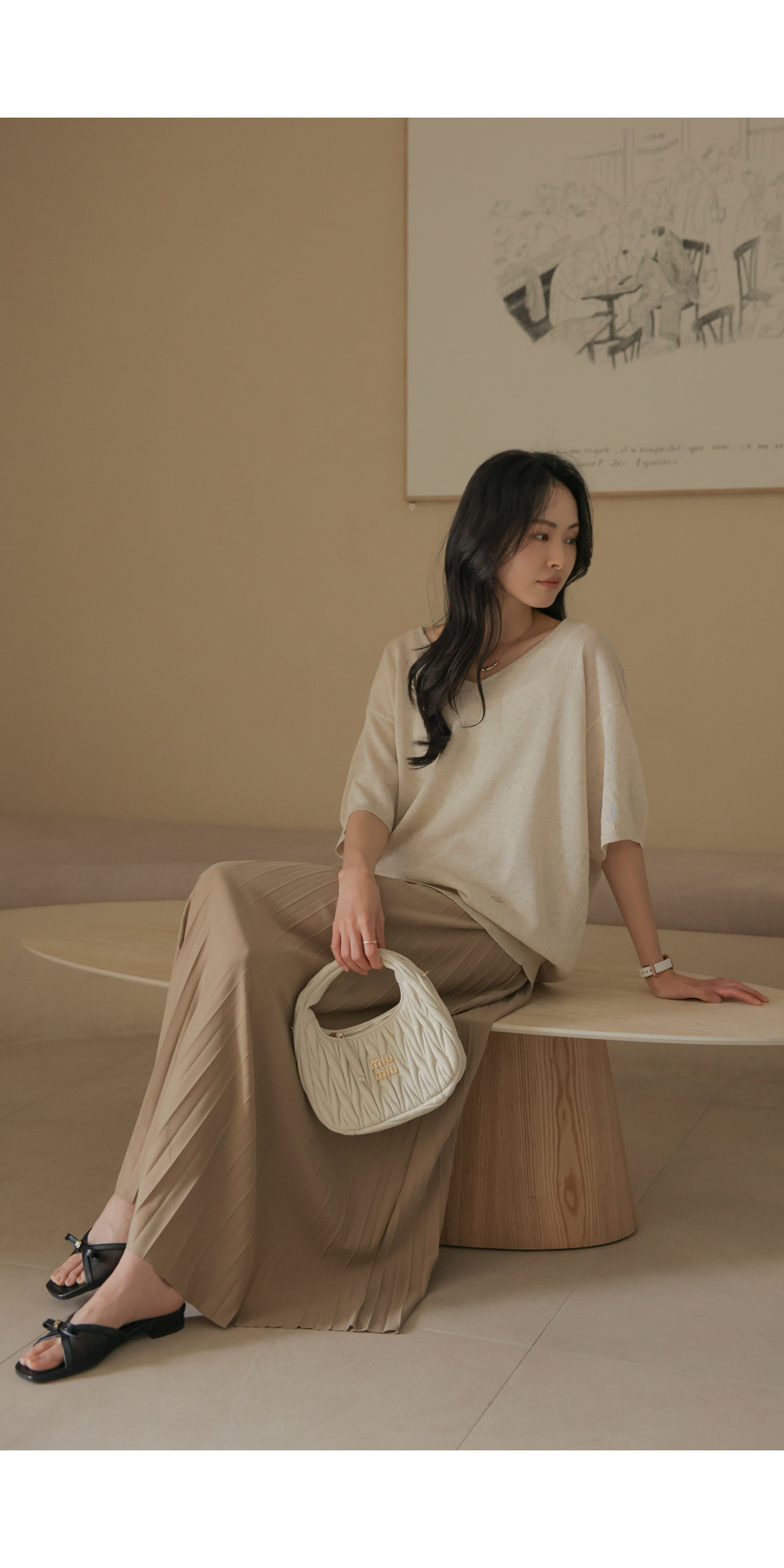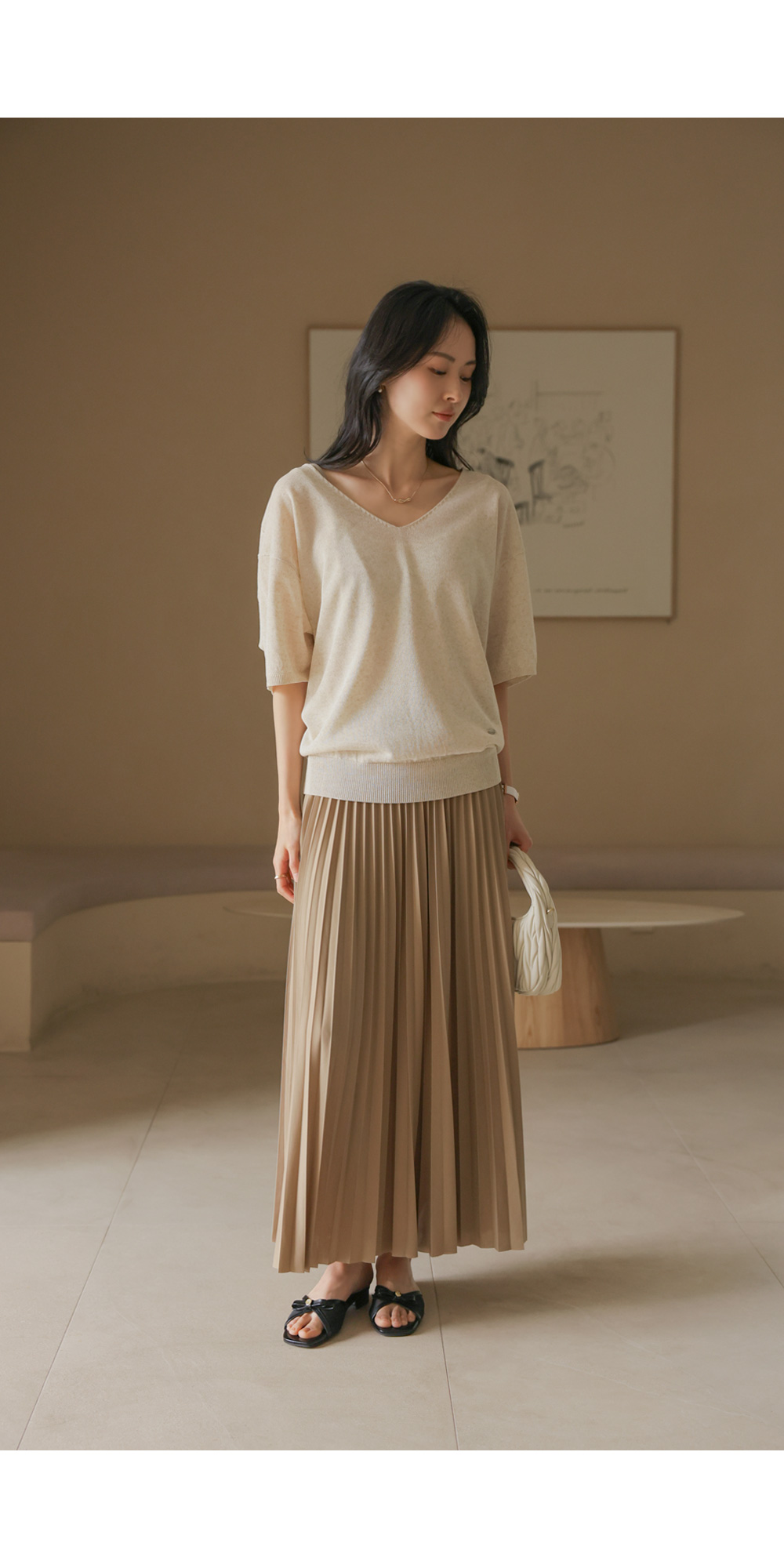 매끈한 터칭감을 가진 고퀄리티 폴리 원단을 사용했어요. 원단 표면에 감도는 은은한 광택감이 플리츠 주름 사이사이로 빛과 그림자의 대비를 선명하게 만들어주어, 평면적인 느낌 없이 풍성하고 생동감 있는 실루엣을 완성해 준답니다. 구김이 잘 가지 않는 소재 특성상 장시간 앉아 있다가 일어나도 플리츠 주름이 변함없이 탄탄하게 유지되구요. 피부에 들러붙지 않고 부드럽게 흐르는 듯한 감촉 덕분에 쾌적하고 기분 좋은 착용감을 하루 종일 느끼실 수 있어요. ![]() 밴딩 가이드 보러가기→ ![]() MD가 답하는 안심 Q&A
