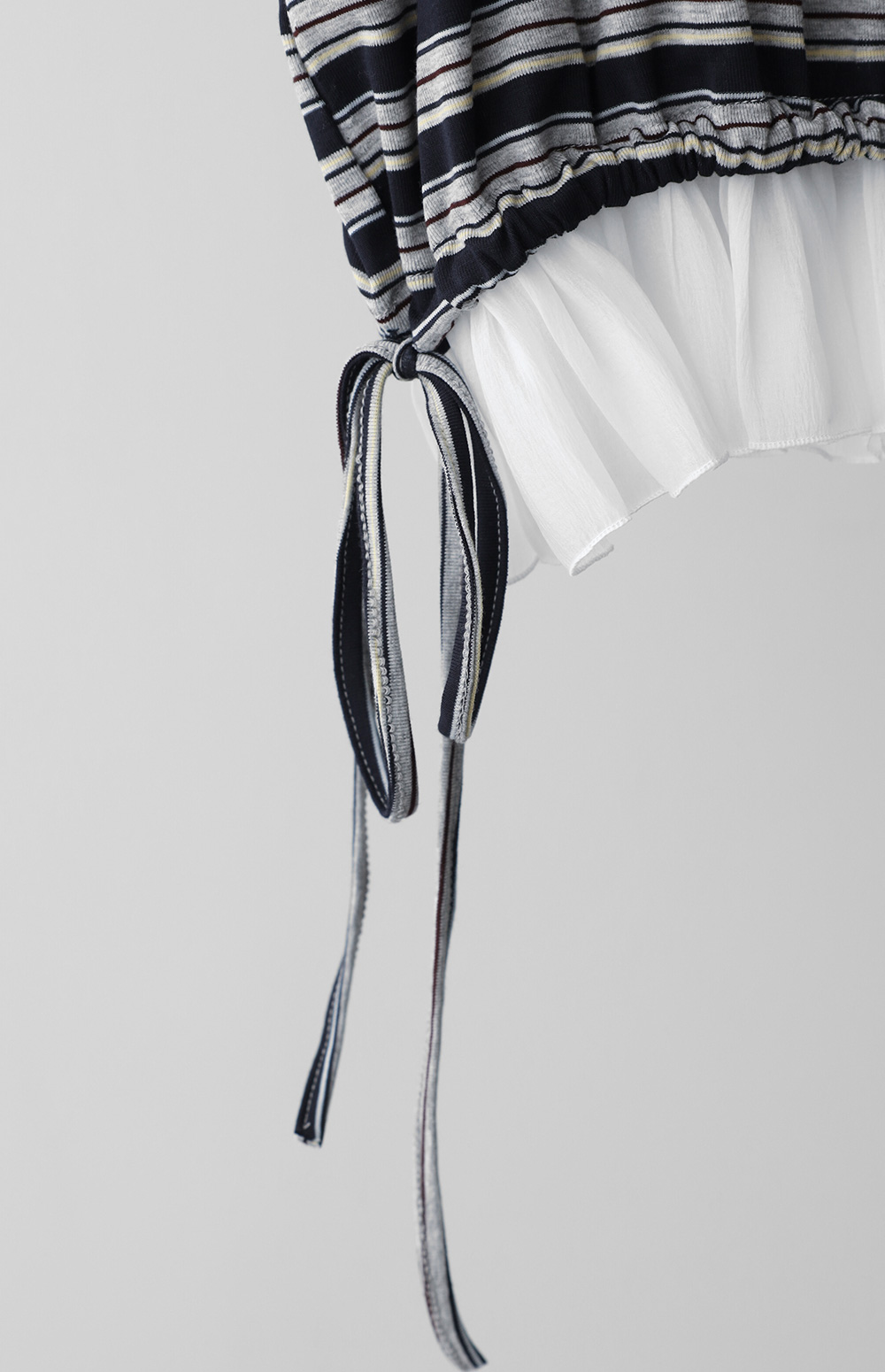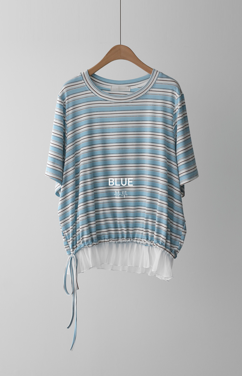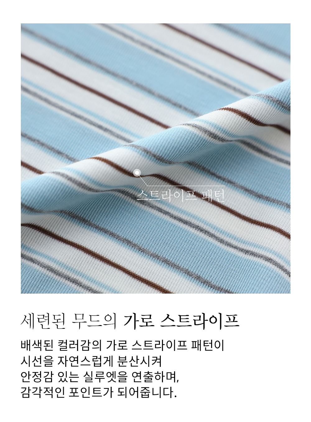 얼굴을 화사하게 밝혀주는 블루와 군더더기 없이 깔끔한 블랙 컬러로 준비했구요. 일반적인 스트라이프 티셔츠 밑단에 가벼운 소재를 레이어드해 멋스럽게 룩을 완성해 준답니다. 억지로 꾸민 느낌보다는 일상에서 슥 입어도 센스 있어 보이는 그런 편안한 스타일이에요.