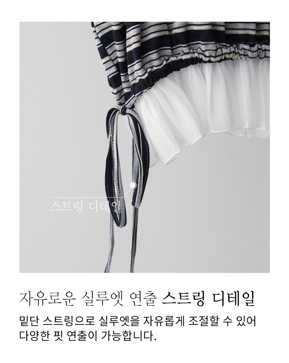 가장 큰 특징은 밑단의 셔링 디테일이에요. 밑단에 달린 스트랩을 가볍게 당겨 리본으로 묶어주면, 벙벙하게 남는 밑단이 내 몸에 맞게 입체적으로 잡히면서 복부의 미운 살들을 자연스럽게 가려준답니다.