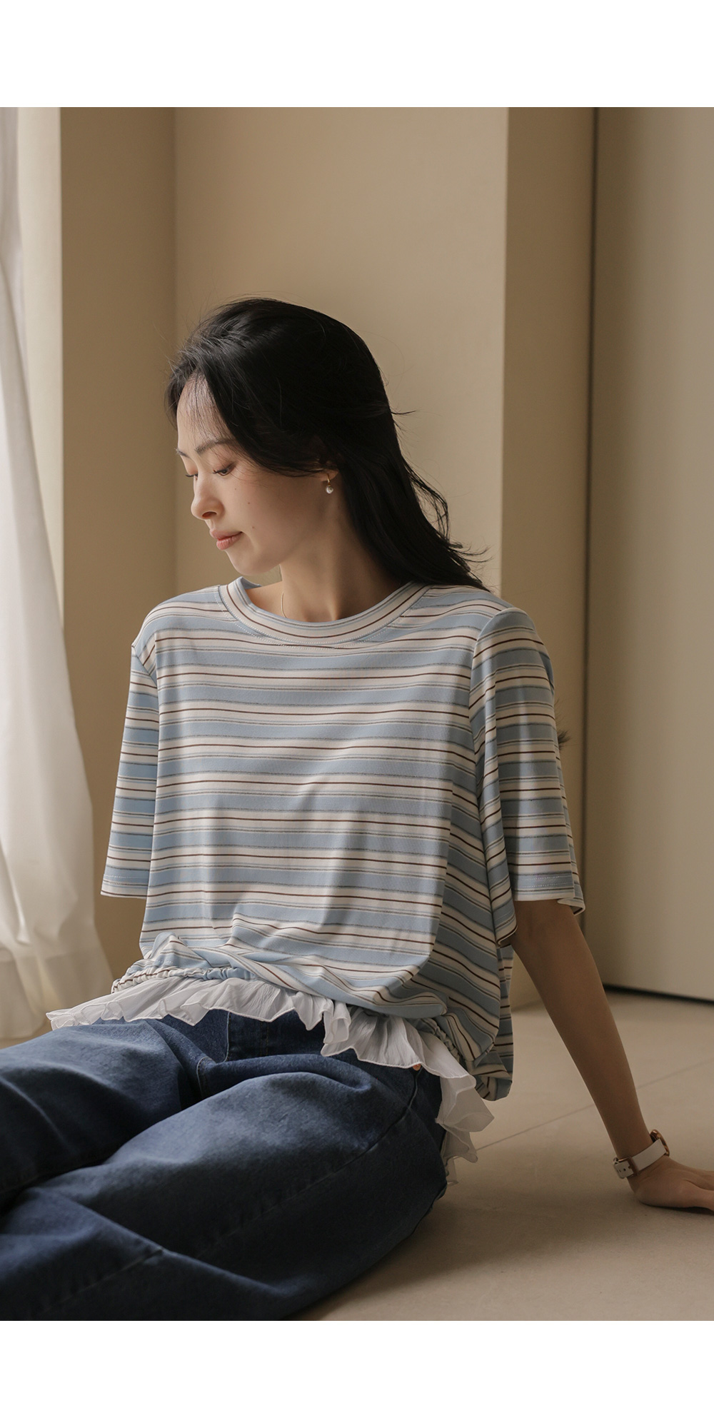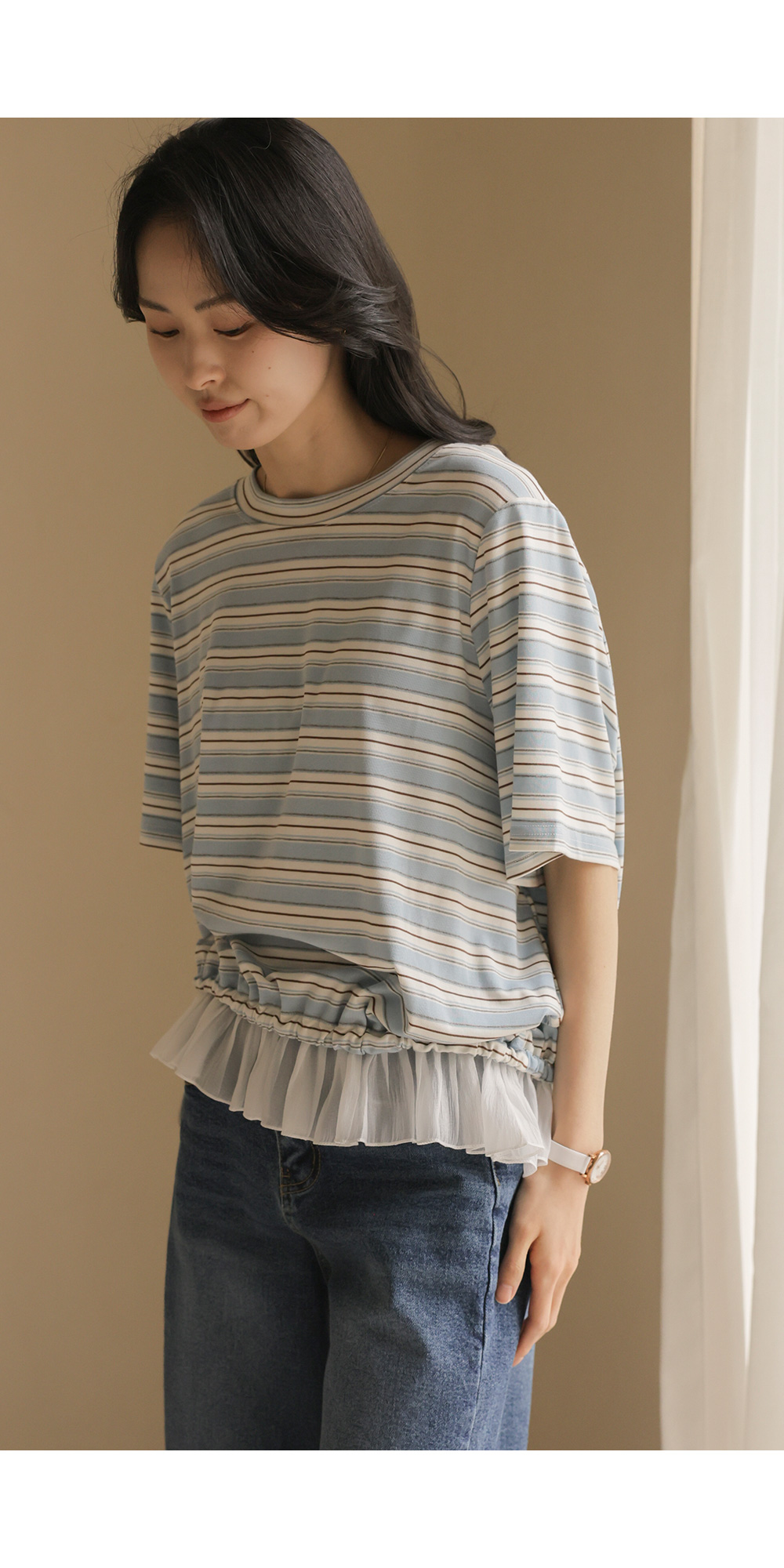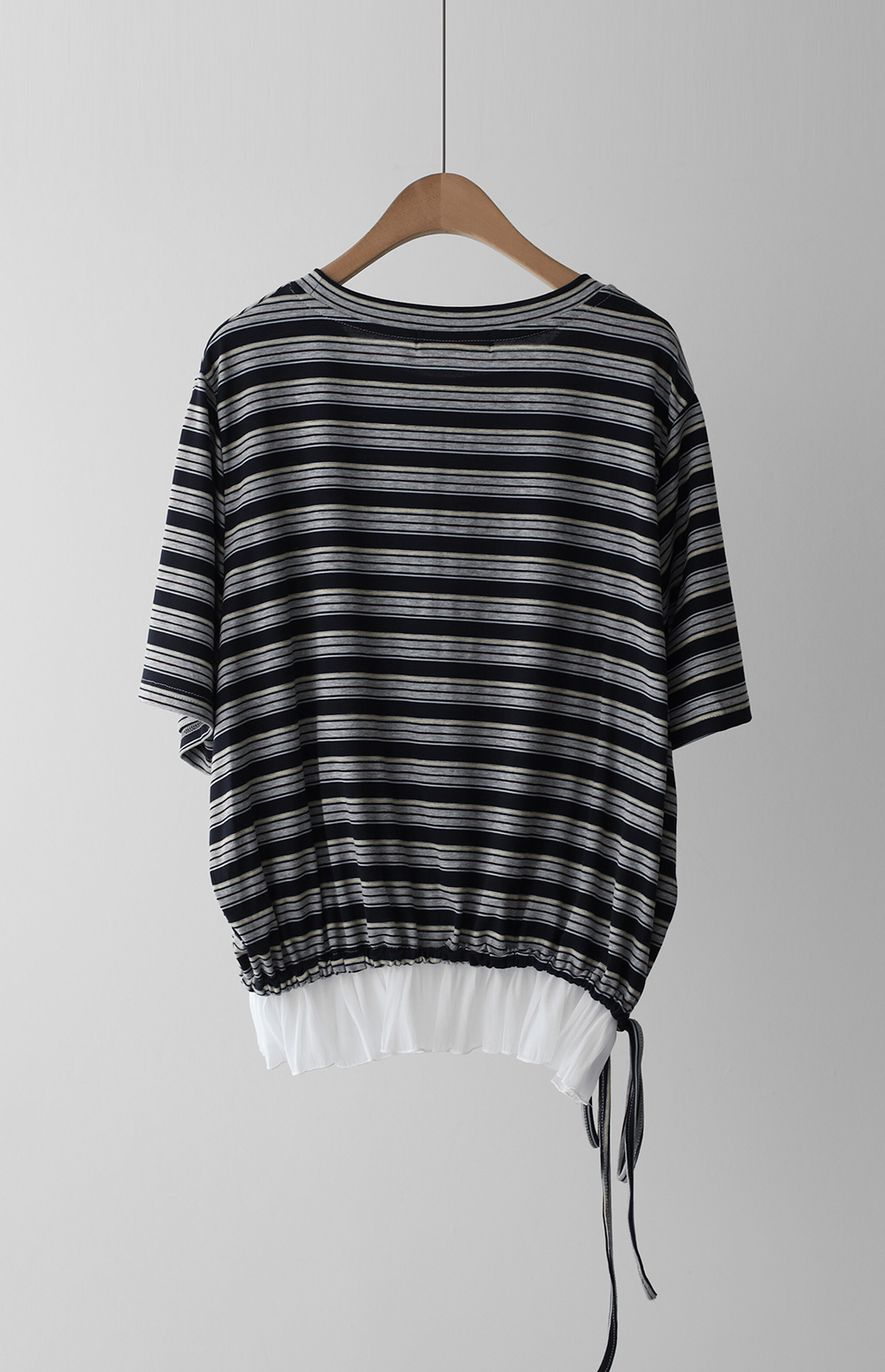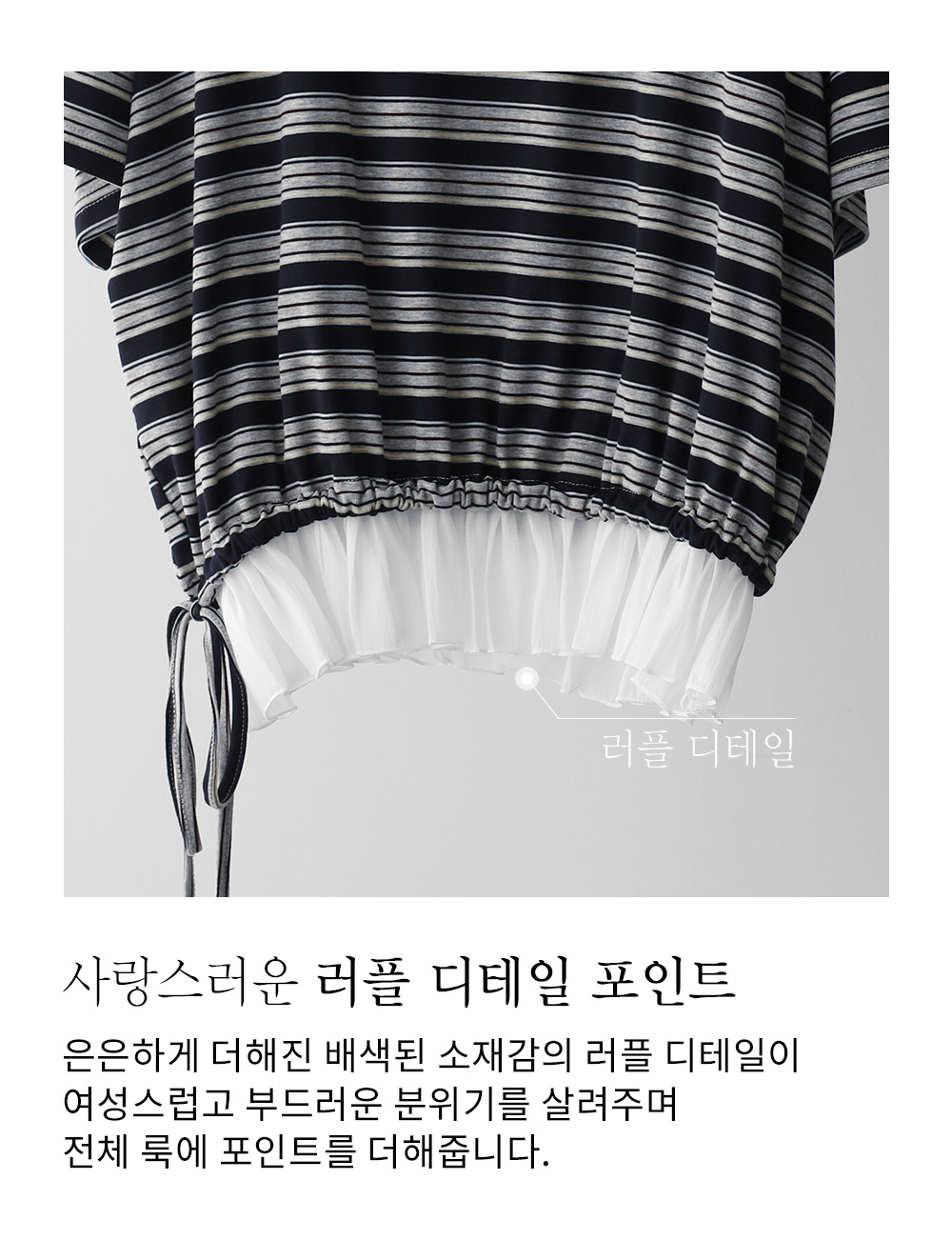 일상에서 가장 손이 많이 가는 스트라이프 패턴에 밑단 셔링 배색을 더해 차별화된 감성을 담았어요. 편하게 입는 티셔츠지만 너무 후줄근해 보이는 건 싫을 때, 딱 요 아이템이 정답이에요.