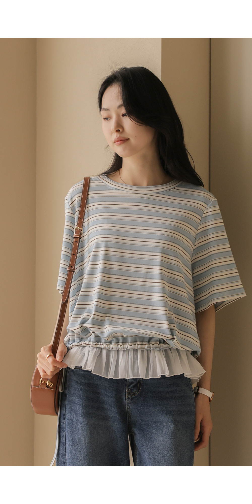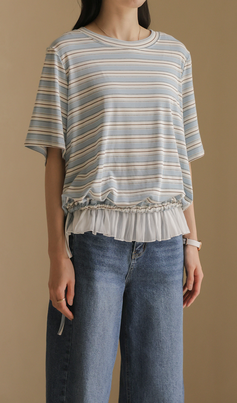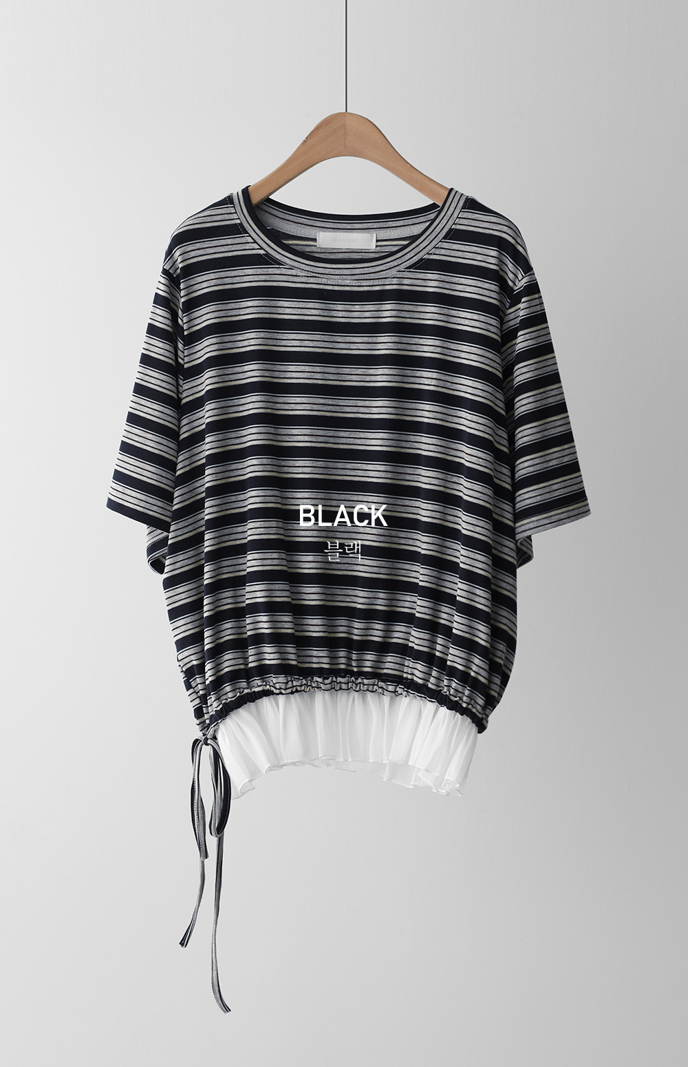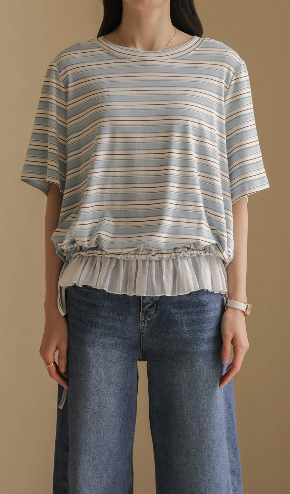 일상에서 가장 손이 많이 가는 스트라이프 패턴에 밑단 셔링 배색을 더해 차별화된 감성을 담았어요. 편하게 입는 티셔츠지만 너무 후줄근해 보이는 건 싫을 때, 딱 요 아이템이 정답이에요.