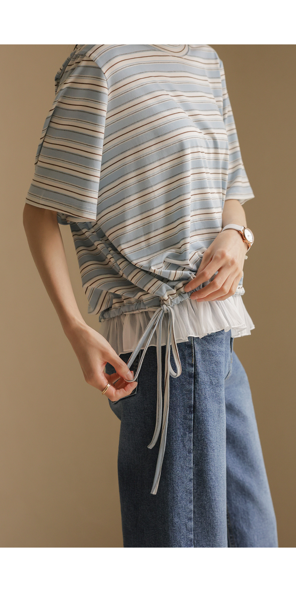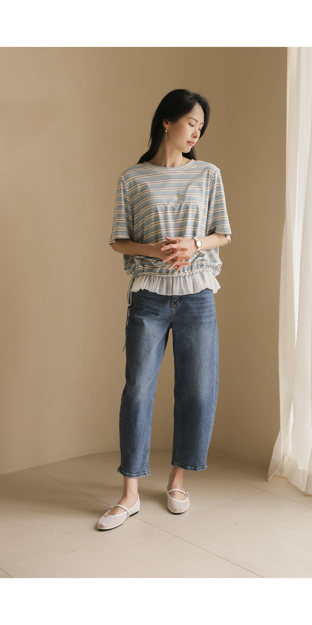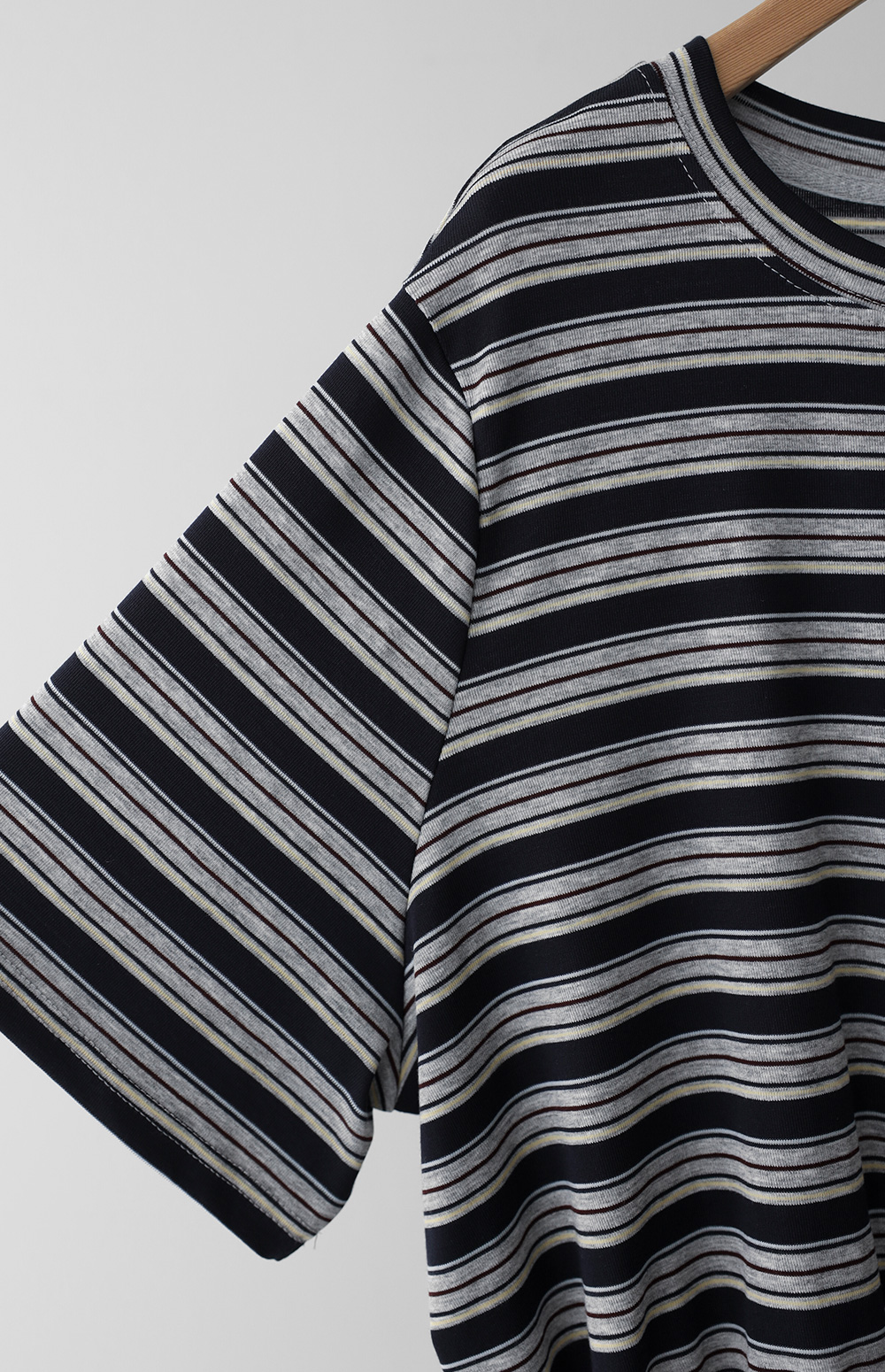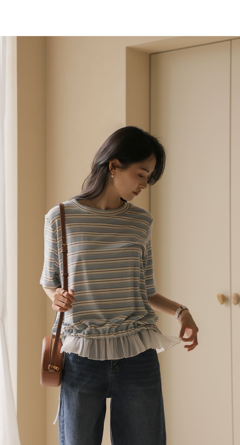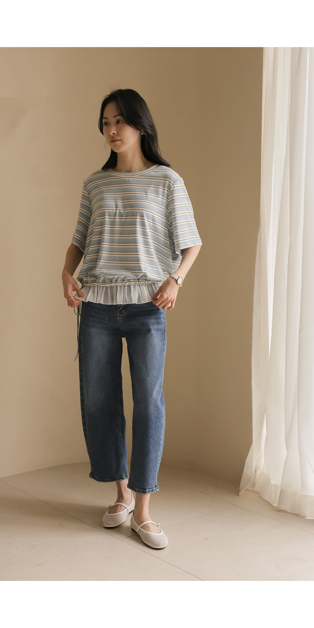 일상에서 가장 손이 많이 가는 스트라이프 패턴에 밑단 셔링 배색을 더해 차별화된 감성을 담았어요. 편하게 입는 티셔츠지만 너무 후줄근해 보이는 건 싫을 때, 딱 요 아이템이 정답이에요.
