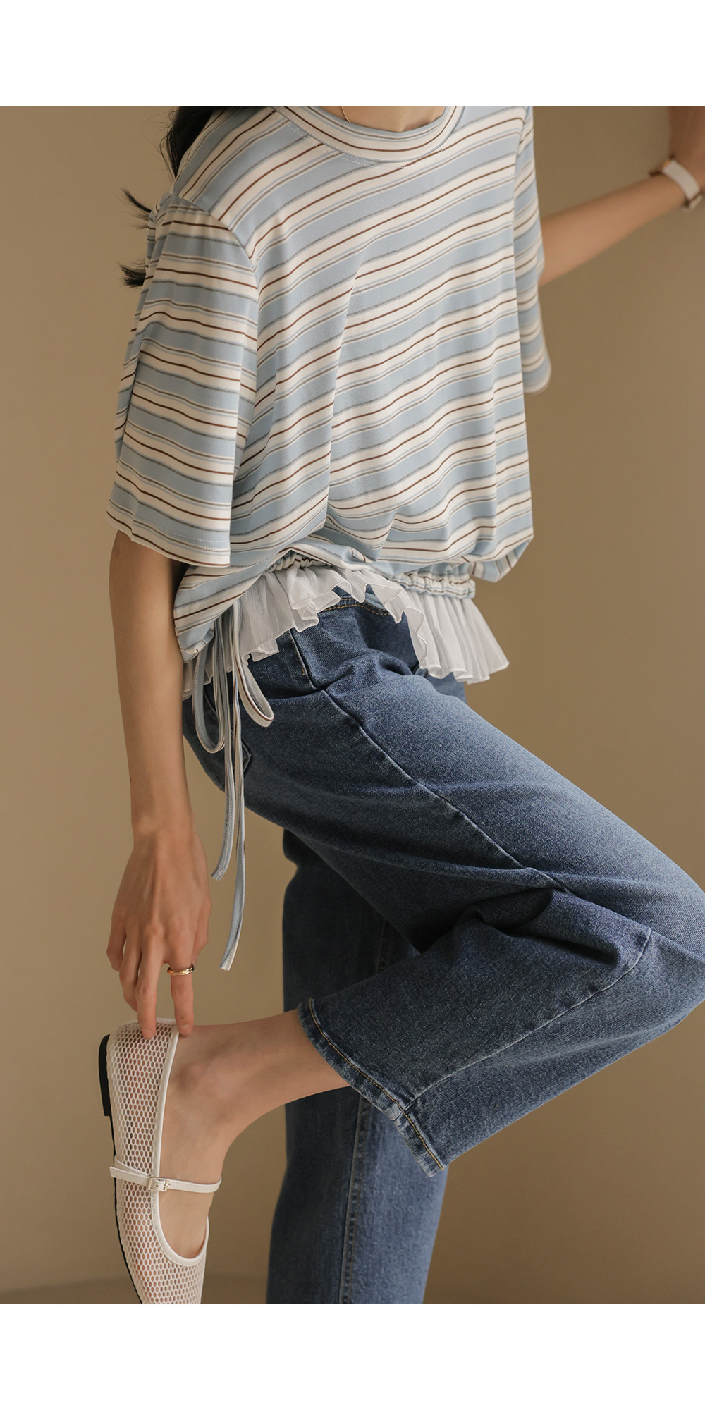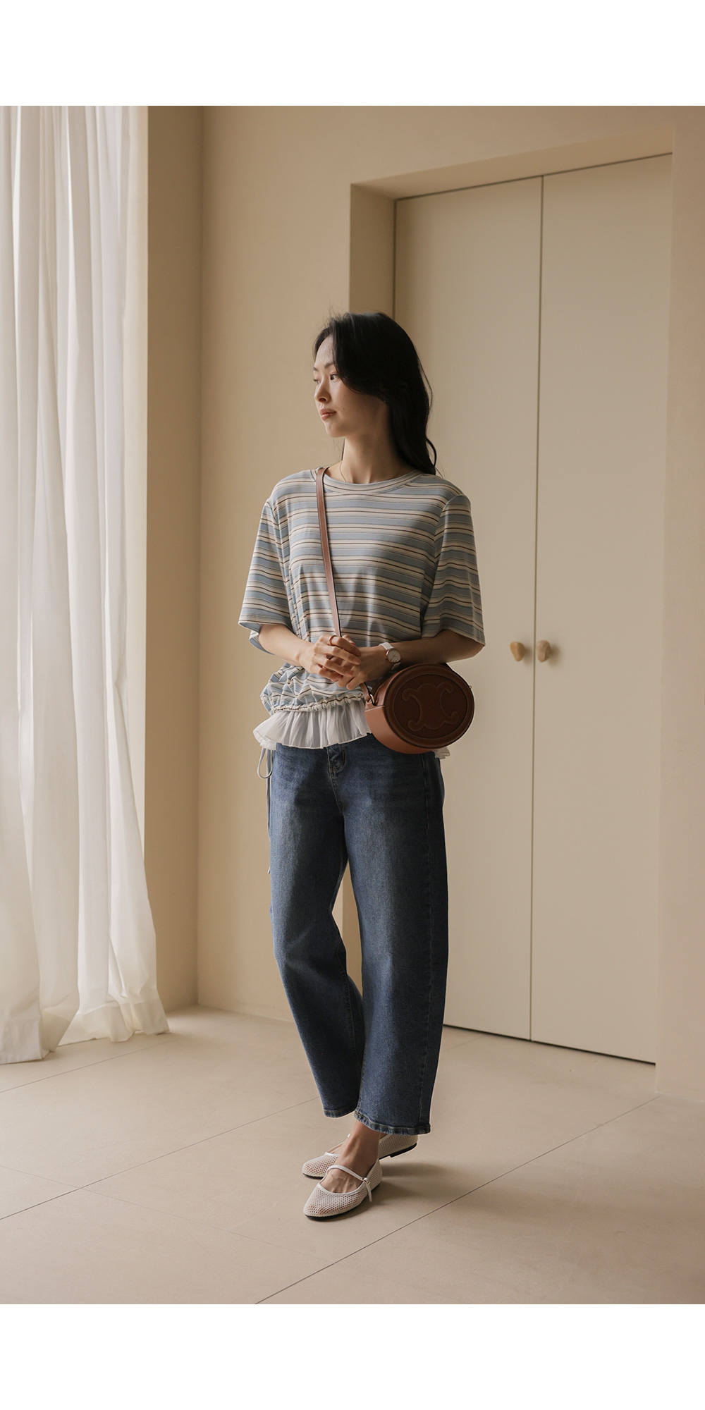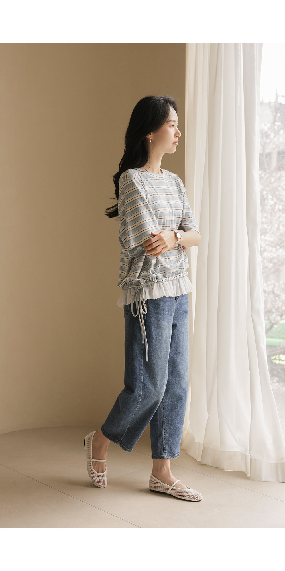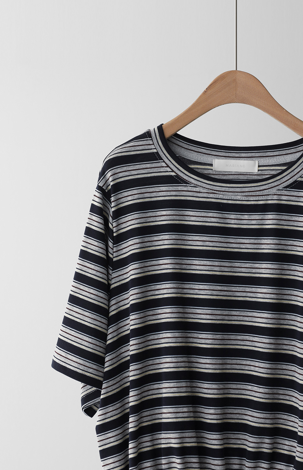일상에서 가장 손이 많이 가는 스트라이프 패턴에 밑단 셔링 배색을 더해 차별화된 감성을 담았어요. 편하게 입는 티셔츠지만 너무 후줄근해 보이는 건 싫을 때, 딱 요 아이템이 정답이에요.