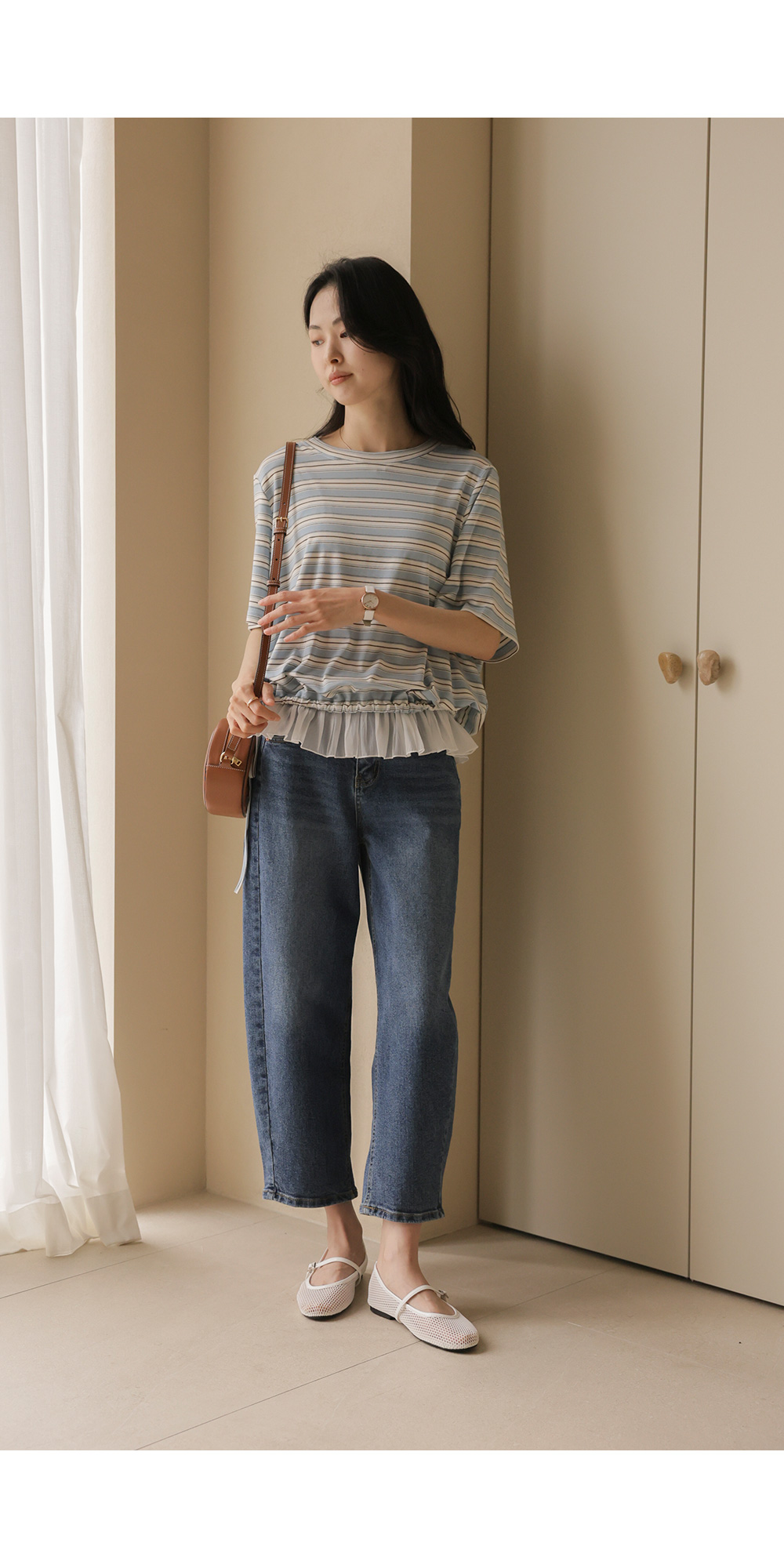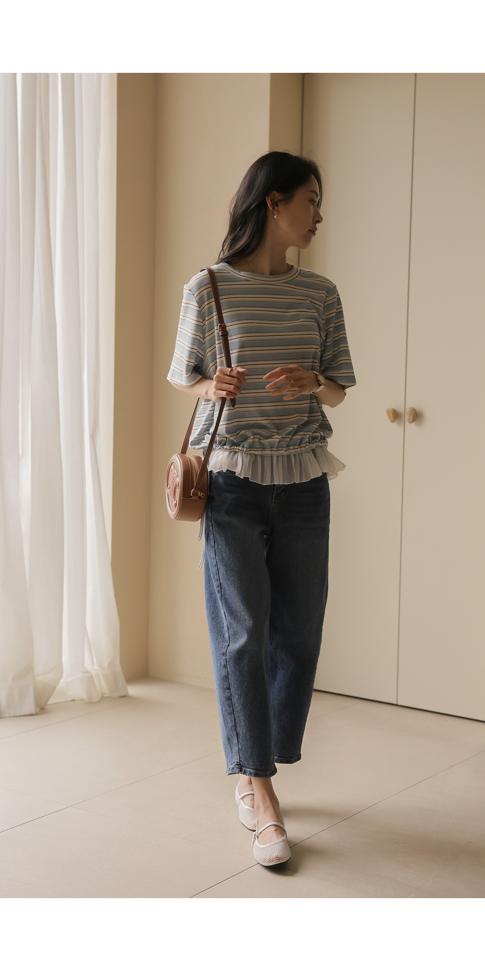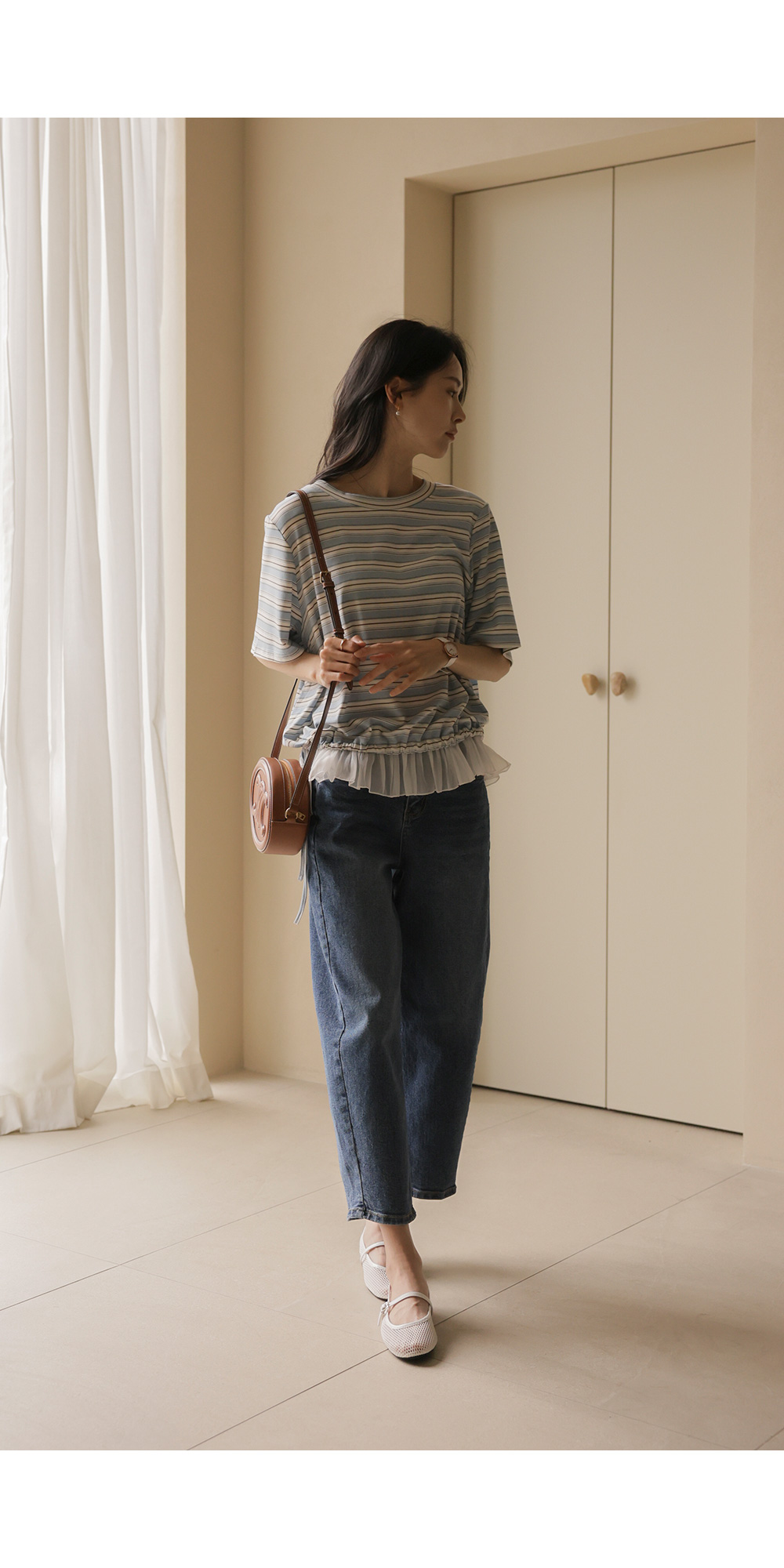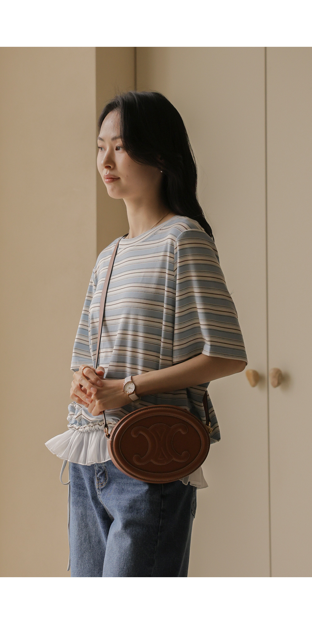 일상에서 가장 손이 많이 가는 스트라이프 패턴에 밑단 셔링 배색을 더해 차별화된 감성을 담았어요. 편하게 입는 티셔츠지만 너무 후줄근해 보이는 건 싫을 때, 딱 요 아이템이 정답이에요.