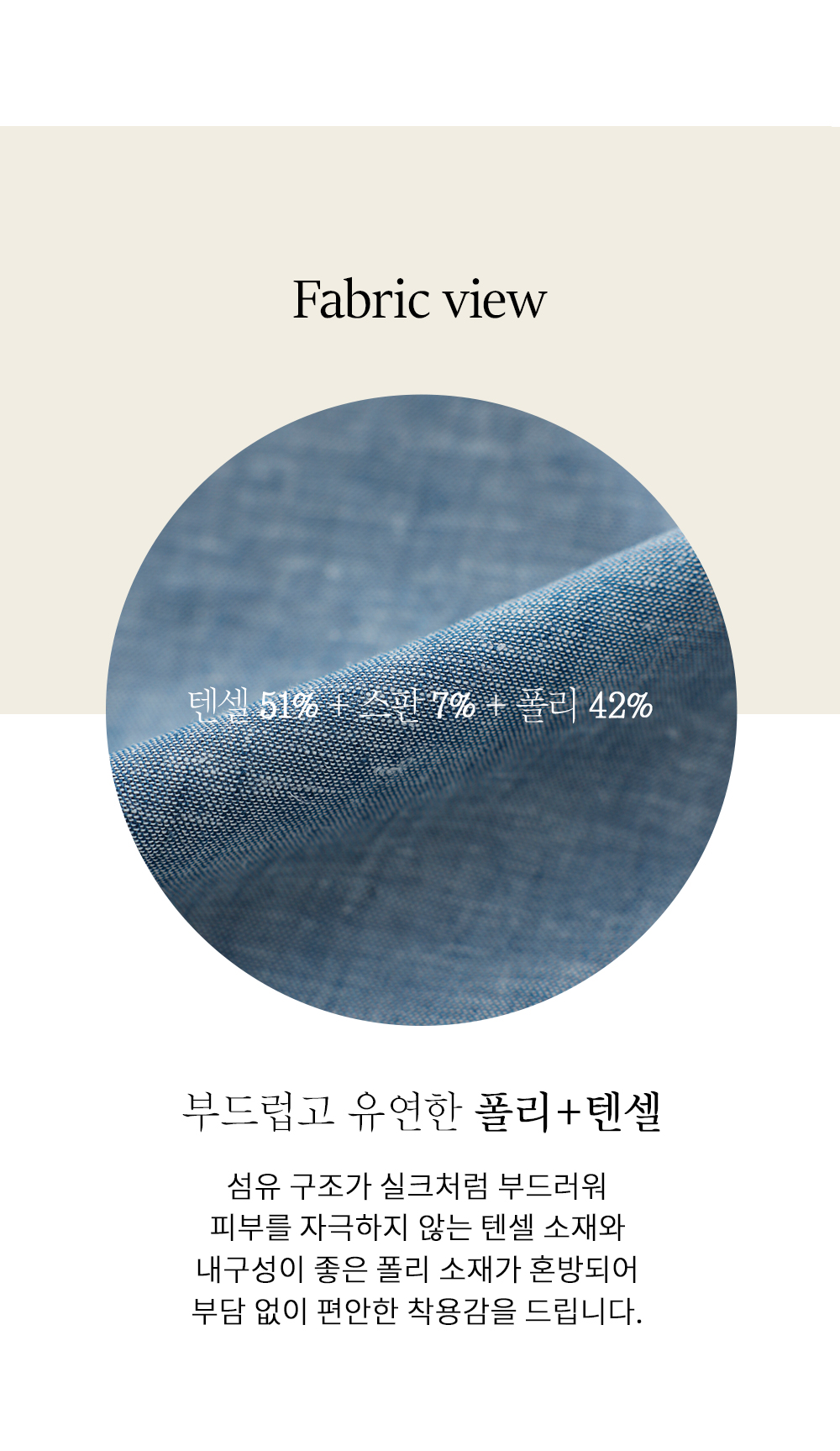 바디라인을 탄탄하게 지탱해 주는 조직감 있는 텐셀과 폴리 혼방 소재를 사용하여 아래로 툭 떨어지는 실루엣이 무척 깔끔해요. 원단 자체에 적당한 힘이 있어 실루엣이 쉽게 흐트러지지 않으며, 매끄러운 촉감 덕분에 이너 아이템과의 마찰 없이 기분 좋게 착용된답니다. 세탁 후에도 변형이 적은 견고한 소재라 오랫동안 예쁜 핏 그대로 즐기실 수 있어요. ![]() ![]() MD가 답하는 안심 Q&A