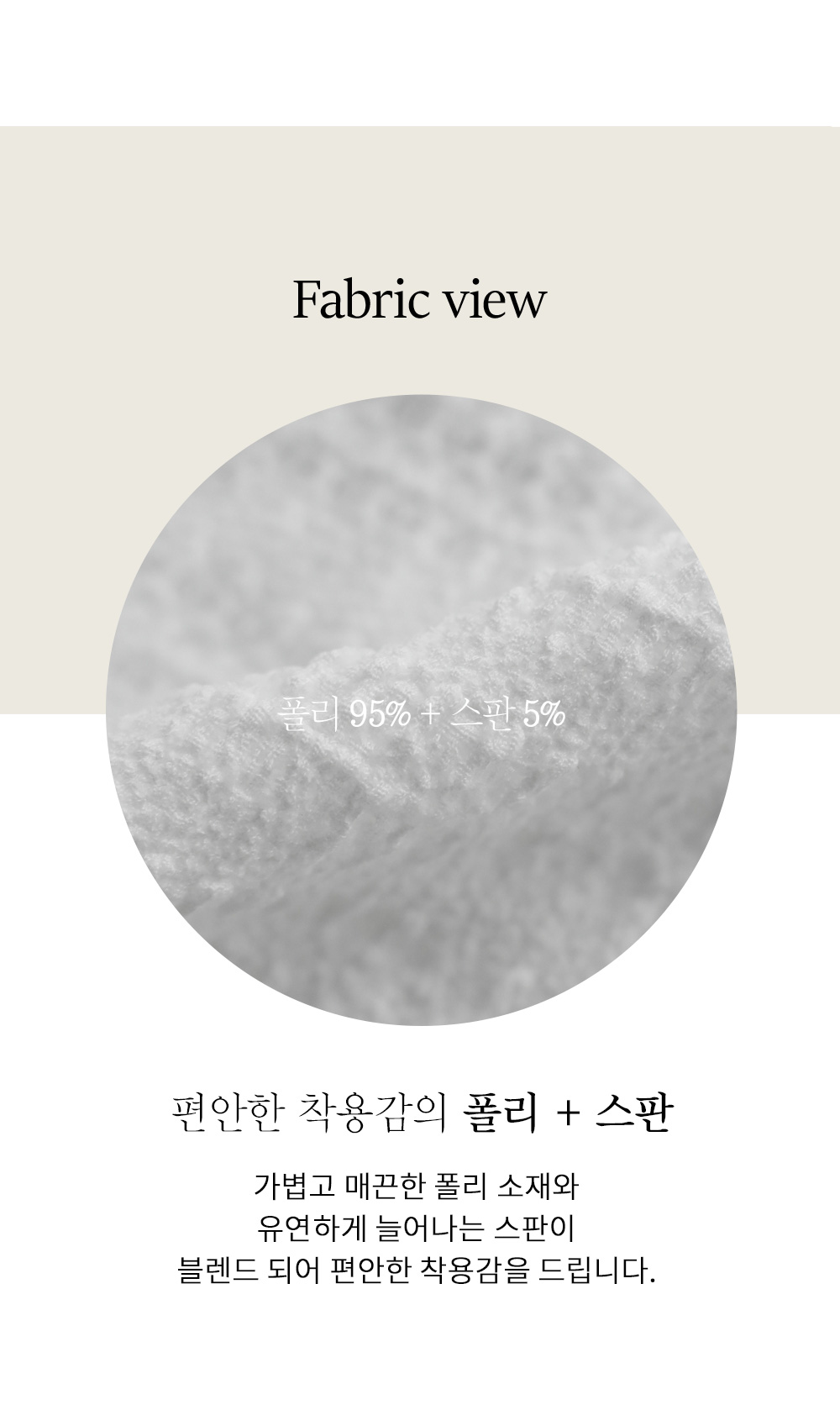 부드럽고 매끄러운 촉감에 탄탄한 텐션감을 갖춘 폴리와 스판 혼용 소재를 사용했어요. 신축성이 좋아서 하루 종일 착용하고 활동해도 불편함 없이 몸을 유연하게 감싸주구요. 입체적인 조직감 덕분에 원단이 피부에 달라붙지 않고 쾌적한 피팅감을 선사하며, 구김 걱정도 덜어주어 관리하기에도 아주 수월하답니다. ![]() MD가 답하는 안심 Q&A