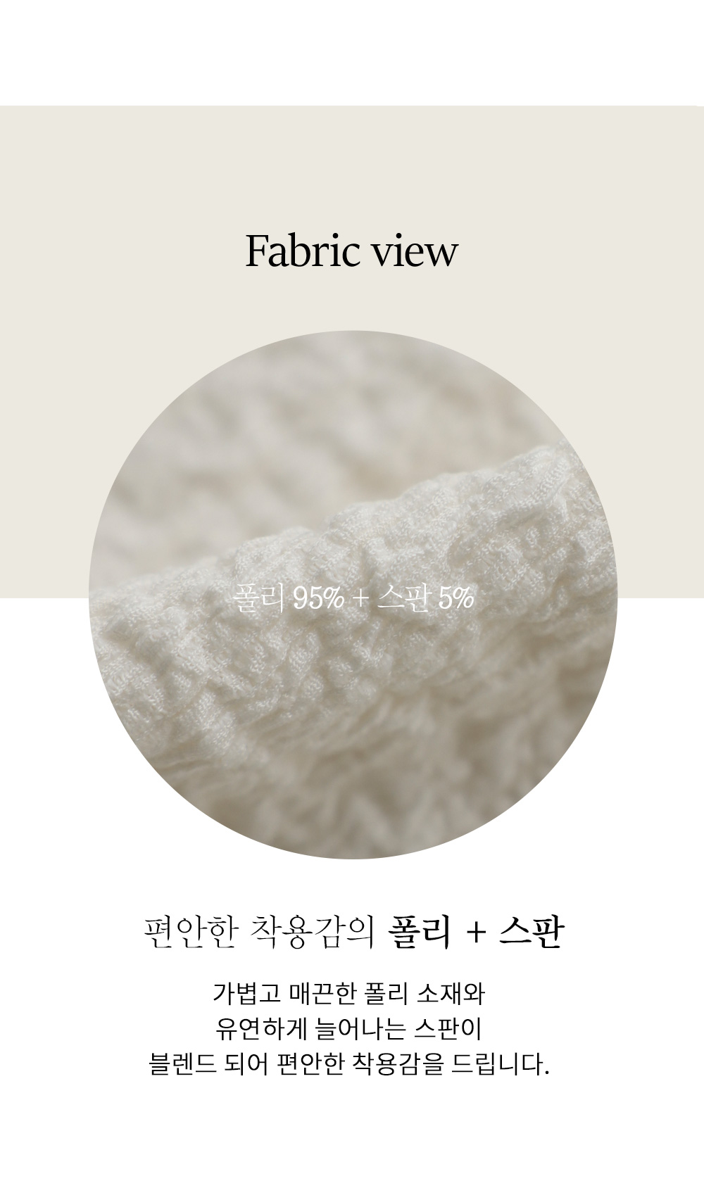 피부에 닿는 느낌이 매우 부드럽고 유연한 폴리와 스판 혼방 소재로 제작되어 착용감이 뛰어나요. 입체적인 텍스처가 살아있어 고급스러운 무드를 연출하며, 신축성이 좋아 장시간 착용해도 편안함을 유지해 준답니다. 소재 특성상 자연스러운 핏을 선사하며, 유연한 소재감으로 활동성까지 갖추고 있어요. 입체적인 텍스처로 인해 쉽게 구겨지지 않아 관리하기에도 용이하답니다.
