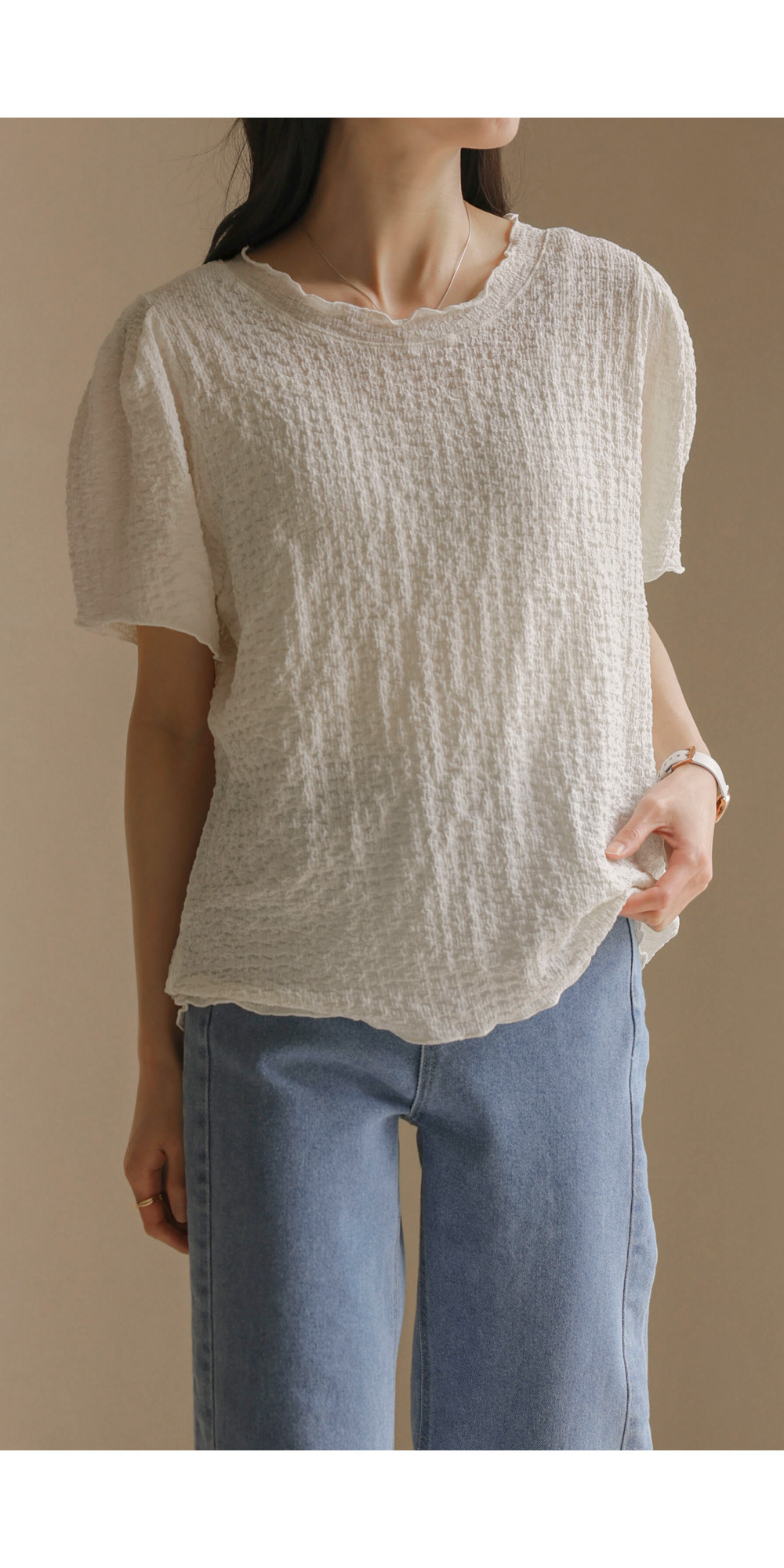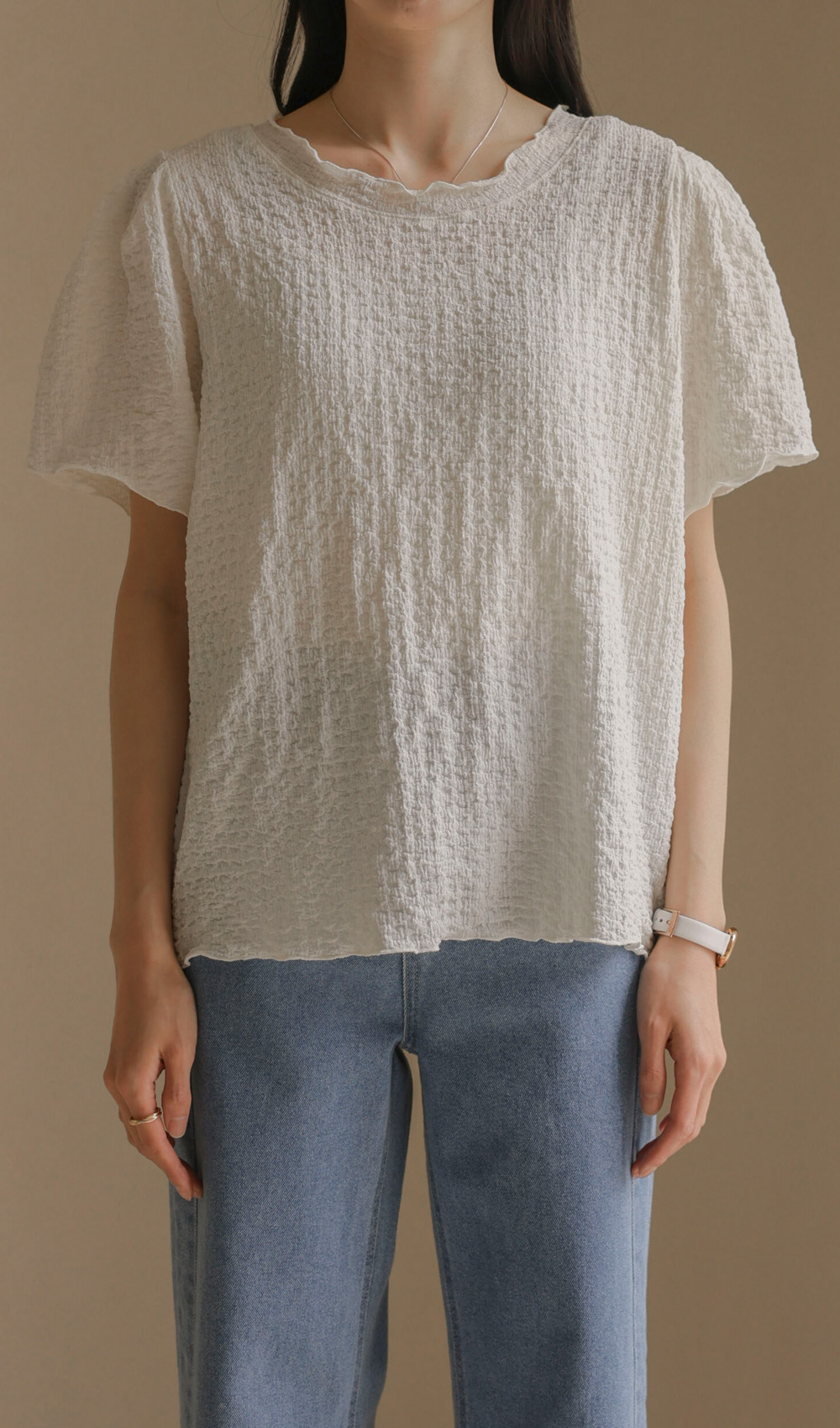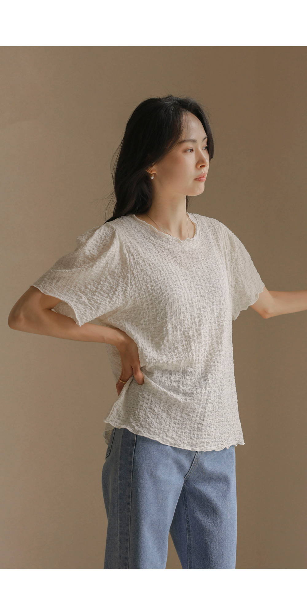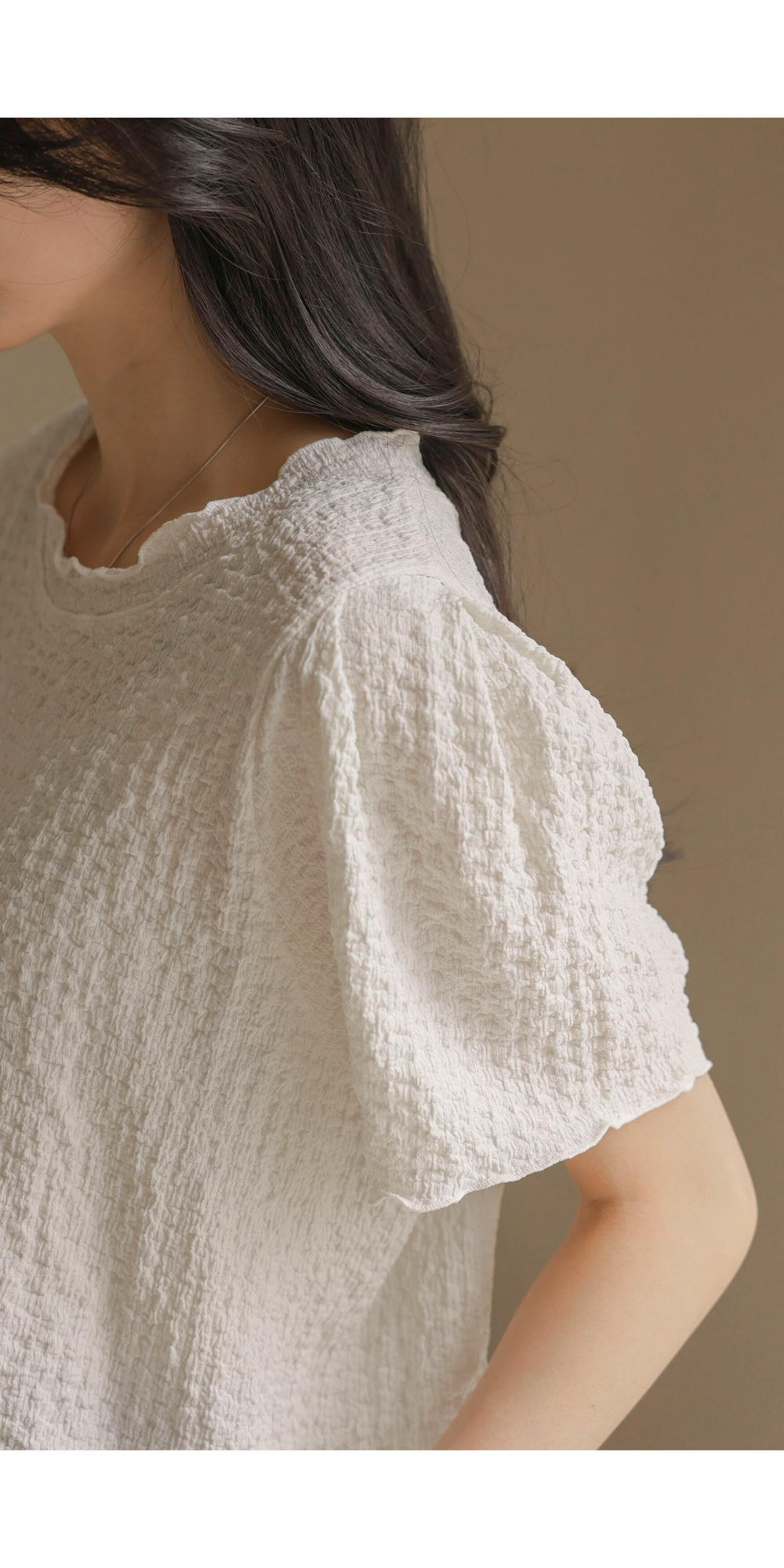 부드럽고 유니크한 소재감에 과하지 않은 퍼프 소매와 물결 디테일이 더해져, 입는 순간 특별해지는 기분을 느낄 수 있답니다.