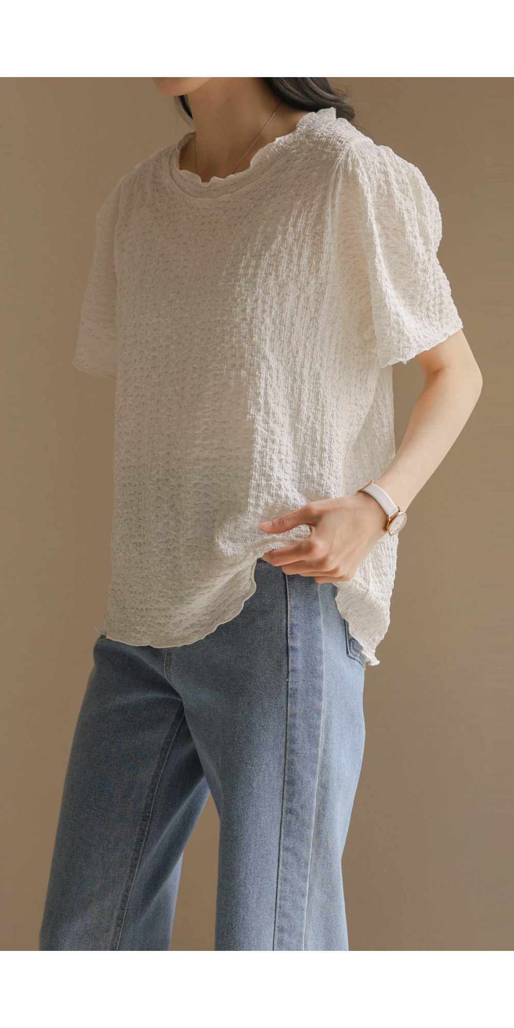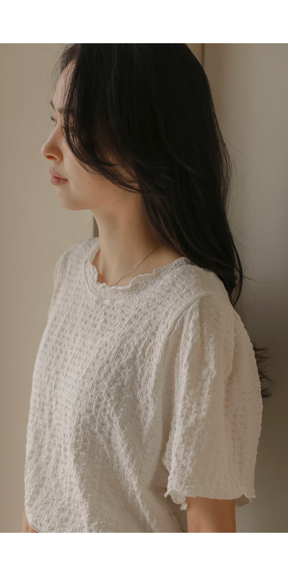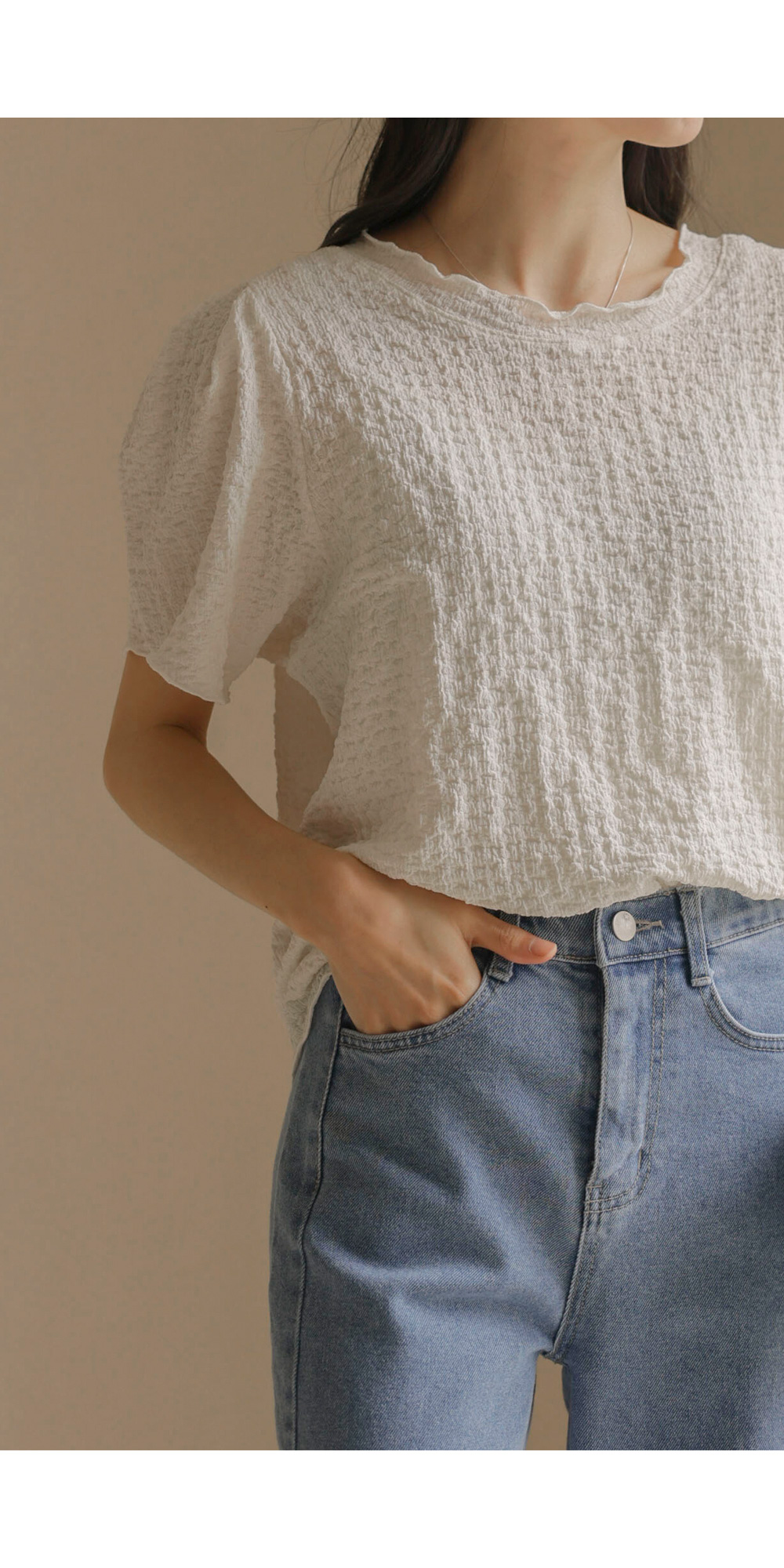 부드럽고 유니크한 소재감에 과하지 않은 퍼프 소매와 물결 디테일이 더해져, 입는 순간 특별해지는 기분을 느낄 수 있답니다.