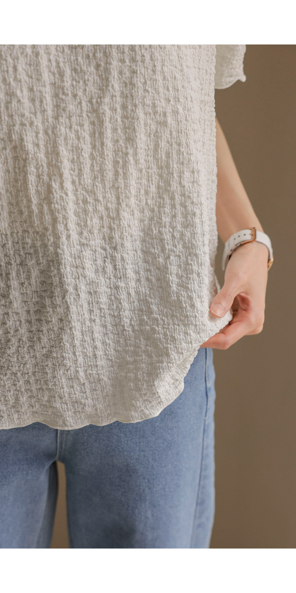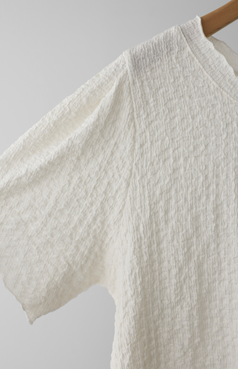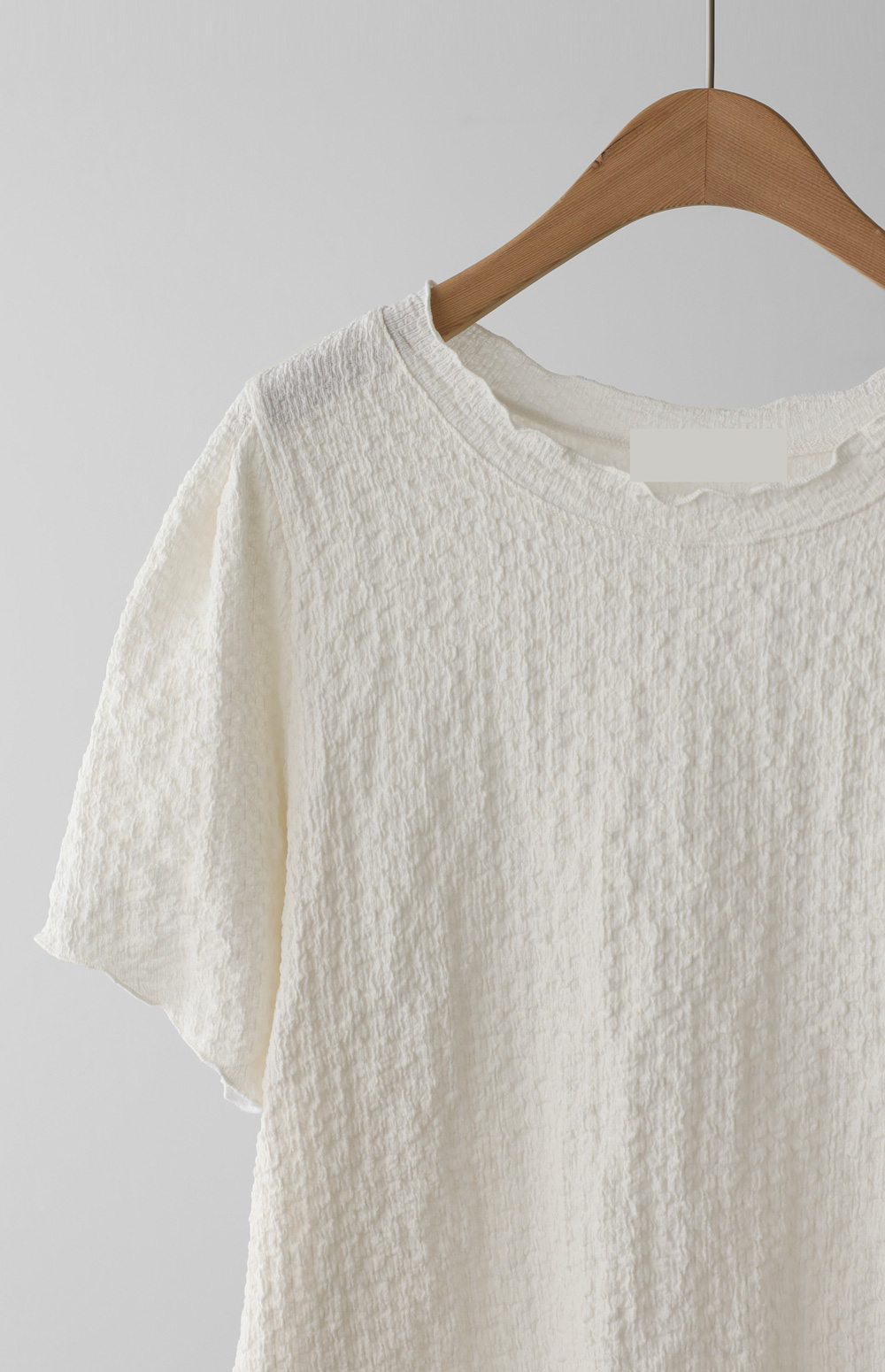이 티셔츠의 가장 큰 매력은 바로 입체적인 텍스처가 살아있는 소재예요. 올록볼록한 표면감이 밋밋함을 덜어주고 세련된 무드를 연출해 준답니다.