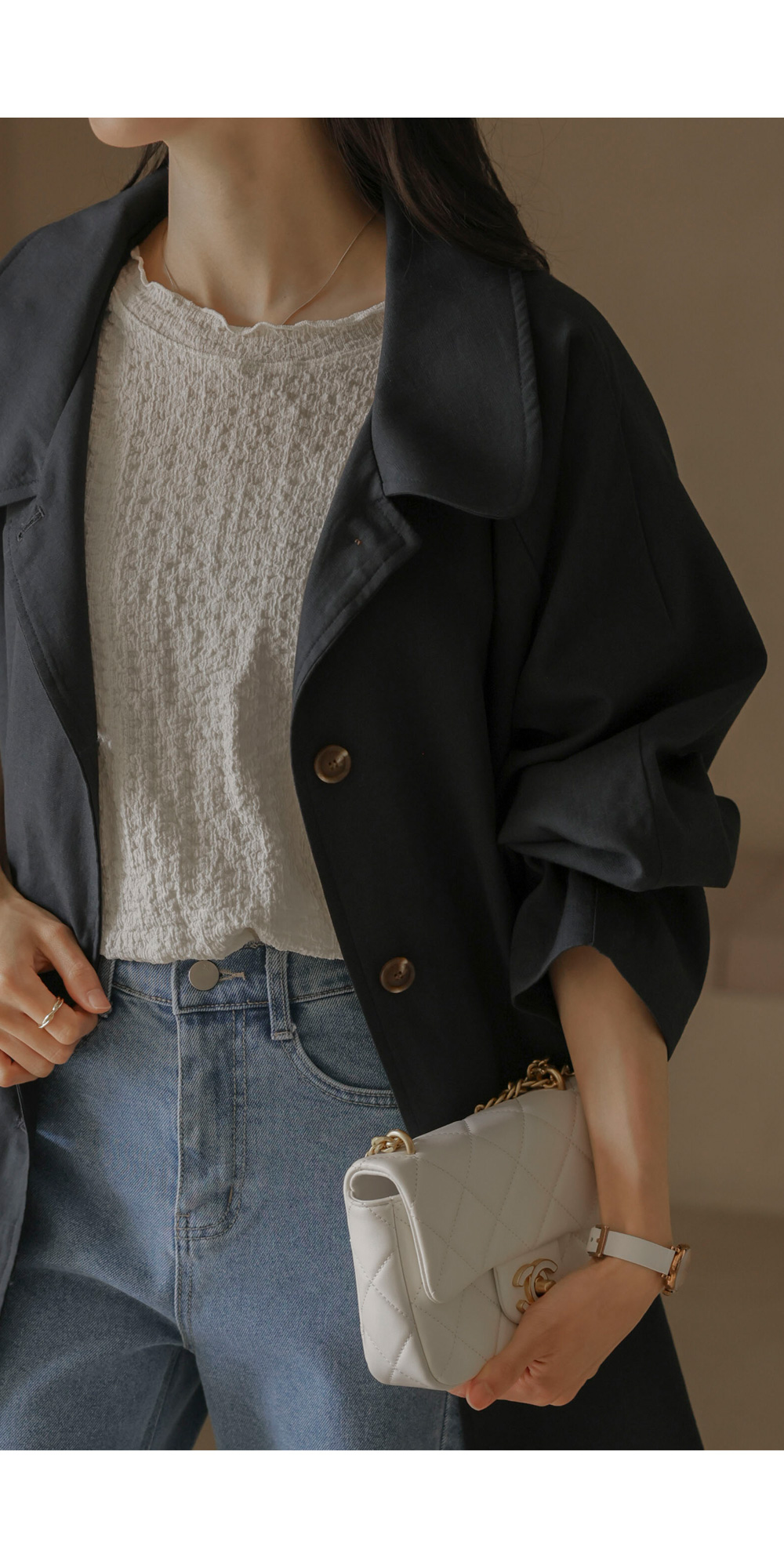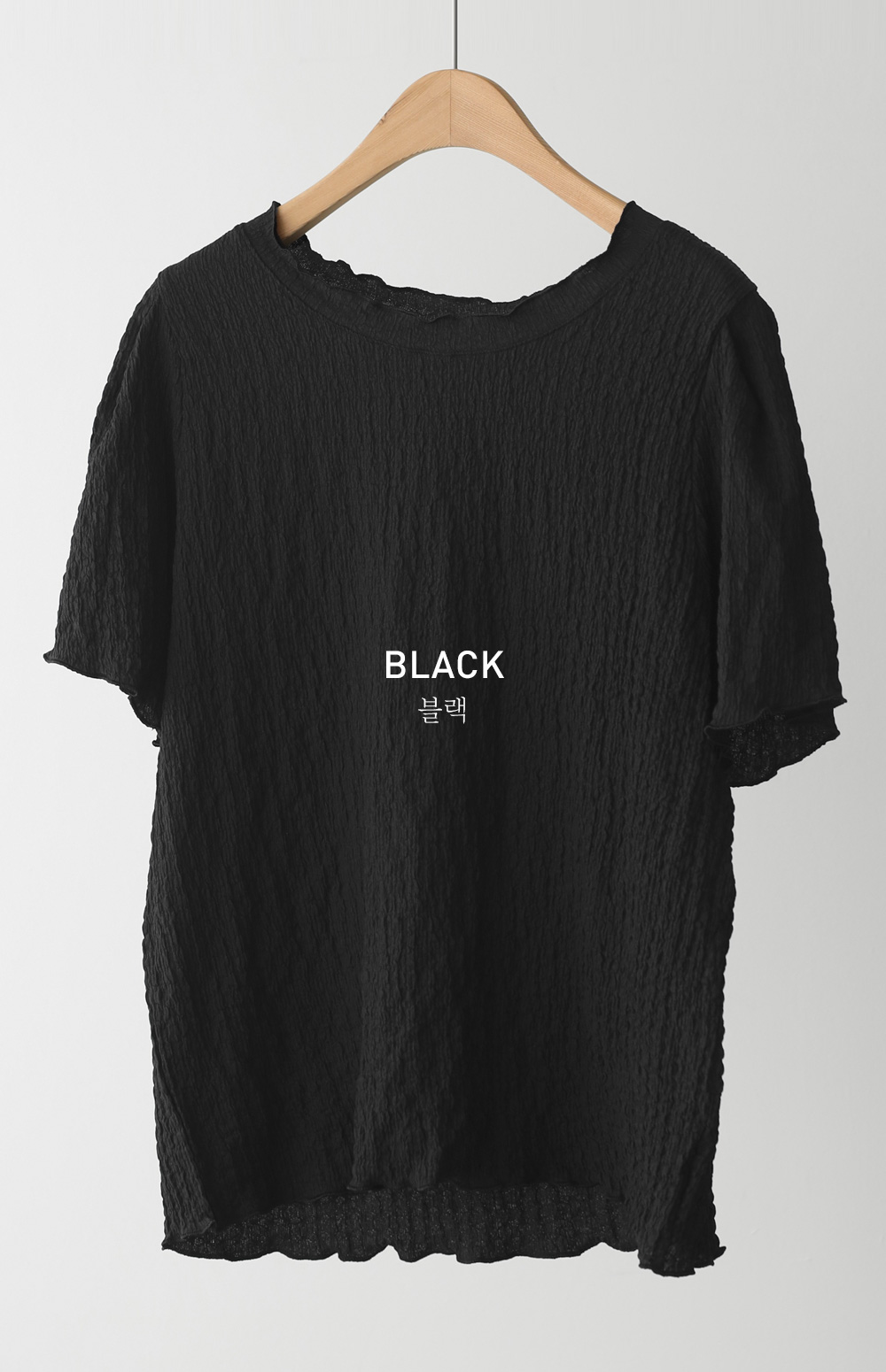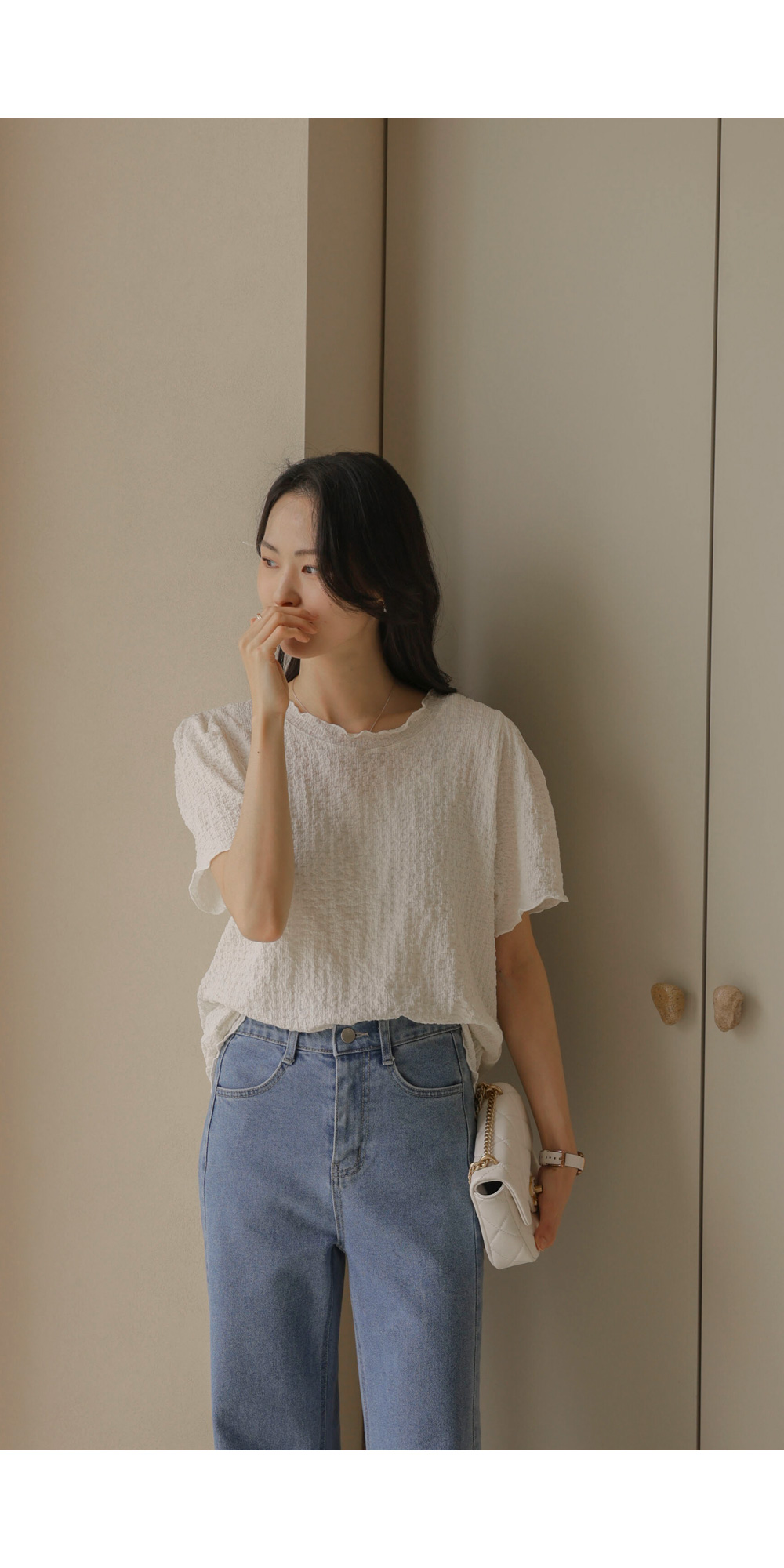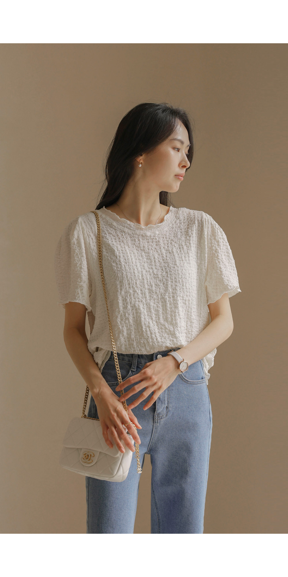 이 티셔츠의 가장 큰 매력은 바로 입체적인 텍스처가 살아있는 소재예요. 올록볼록한 표면감이 밋밋함을 덜어주고 세련된 무드를 연출해 준답니다.