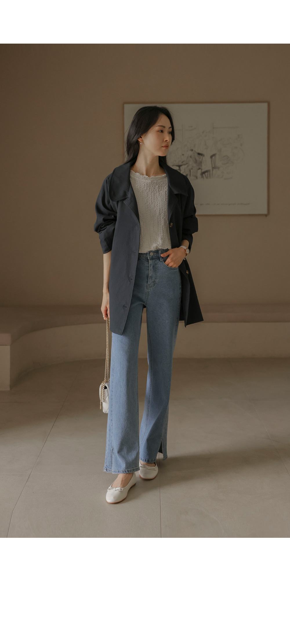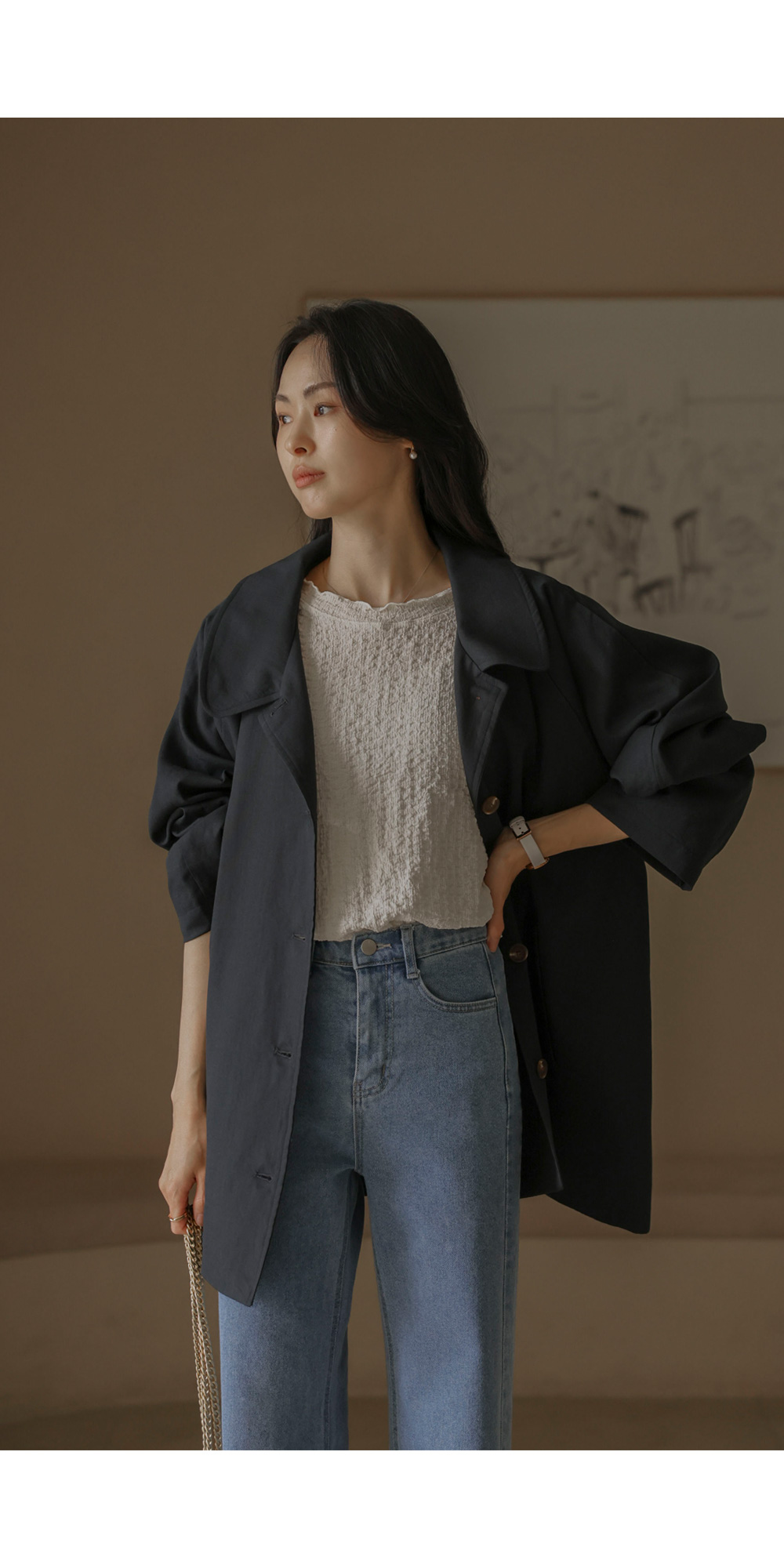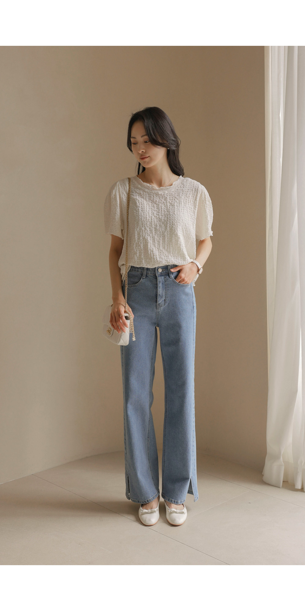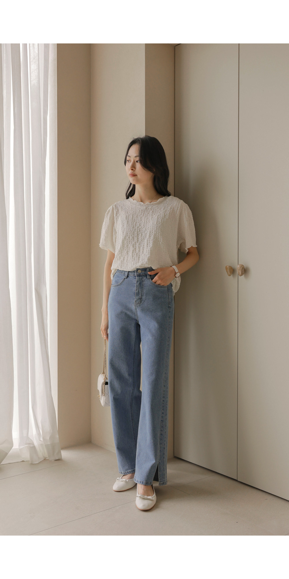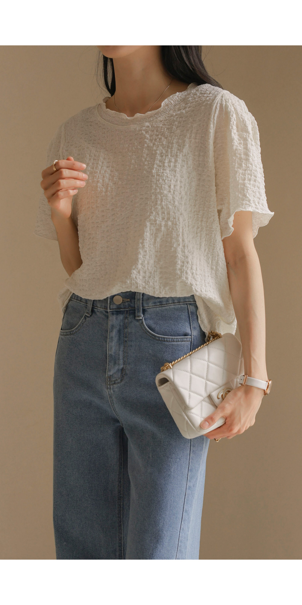 넥라인과 소매 끝, 밑단에 더해진 물결 모양의 디테일은 러블리하고 페미닌한 포인트를 완성해 줘요. 과하지 않으면서도 어깨 라인을 예쁘게 잡아주는 퍼프 소매는 팔뚝살을 자연스럽게 커버해 주고, 여리여리한 실루엣을 만들어 드린답니다.