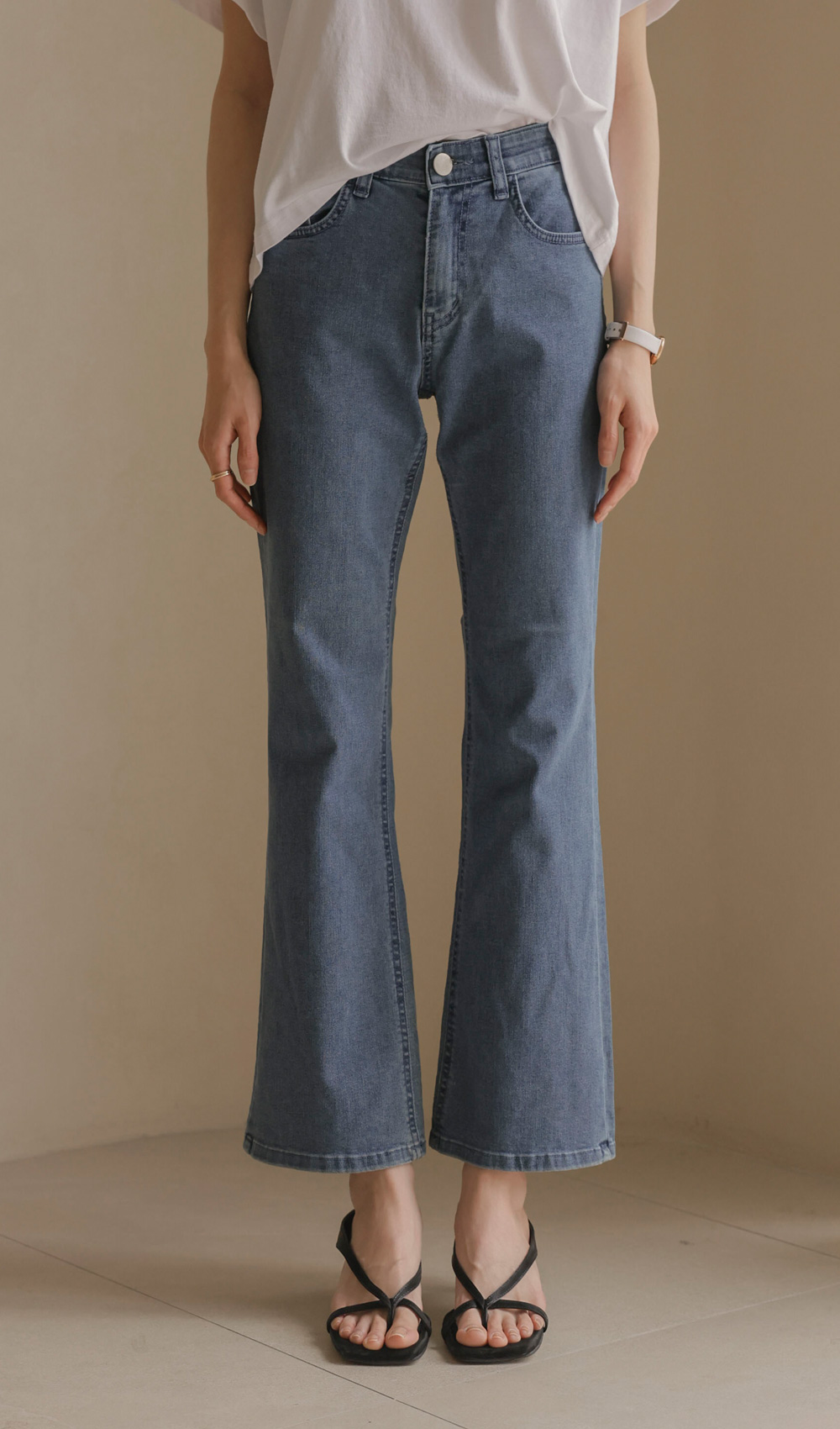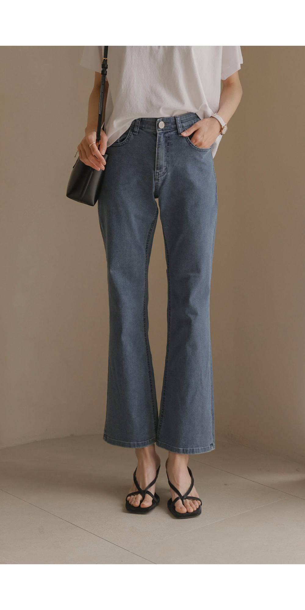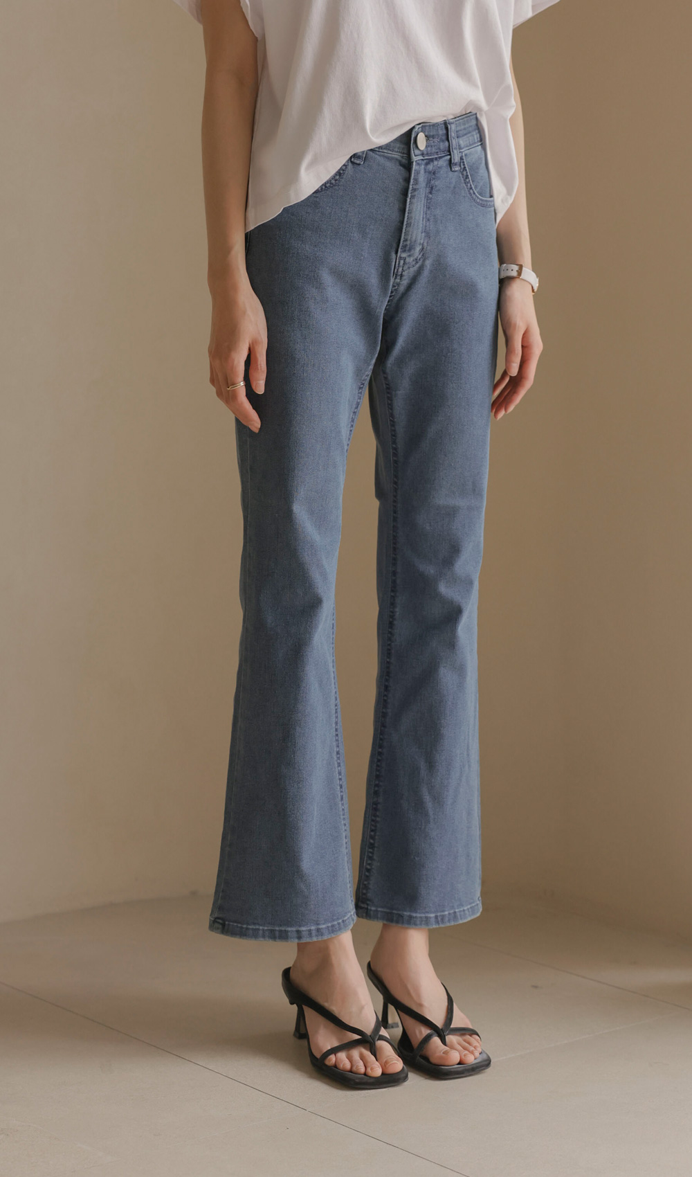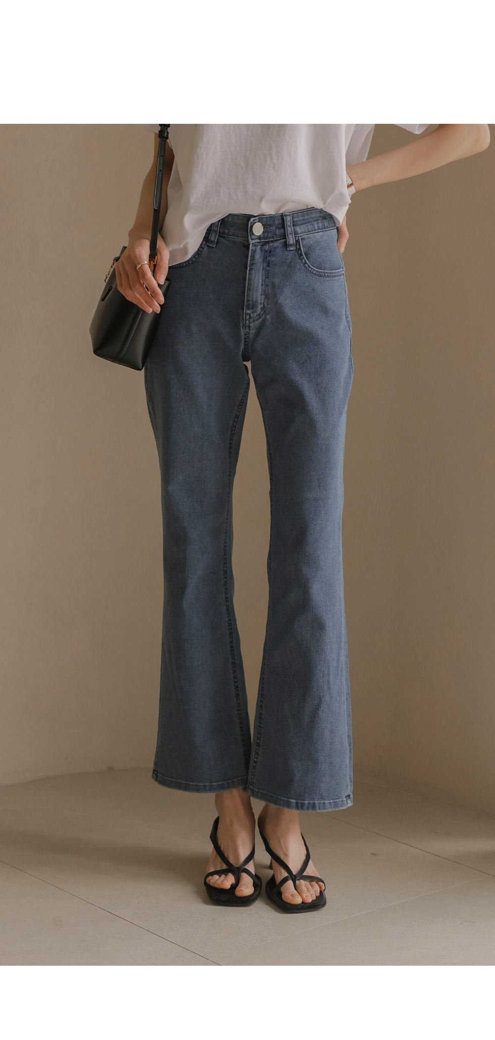 데님 팬츠 카테고리에서 가장 세련된 라인을 자랑하는 아이템 소개해 드려요. 무릎 아래로 자연스럽게 퍼지는 부츠컷 실루엣이 다리 라인을 훨씬 길고 슬림해 보이게 만들어 주구요.