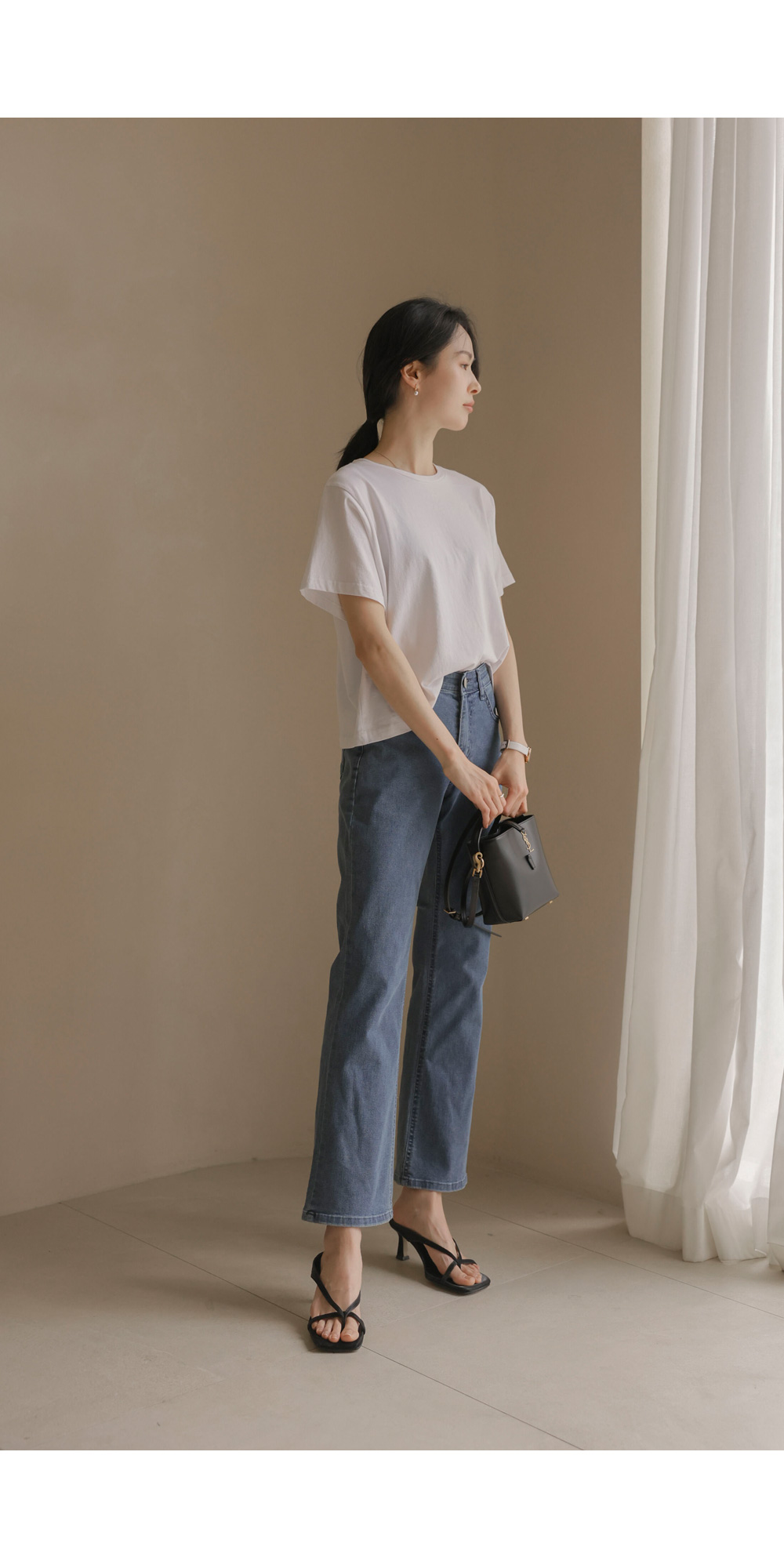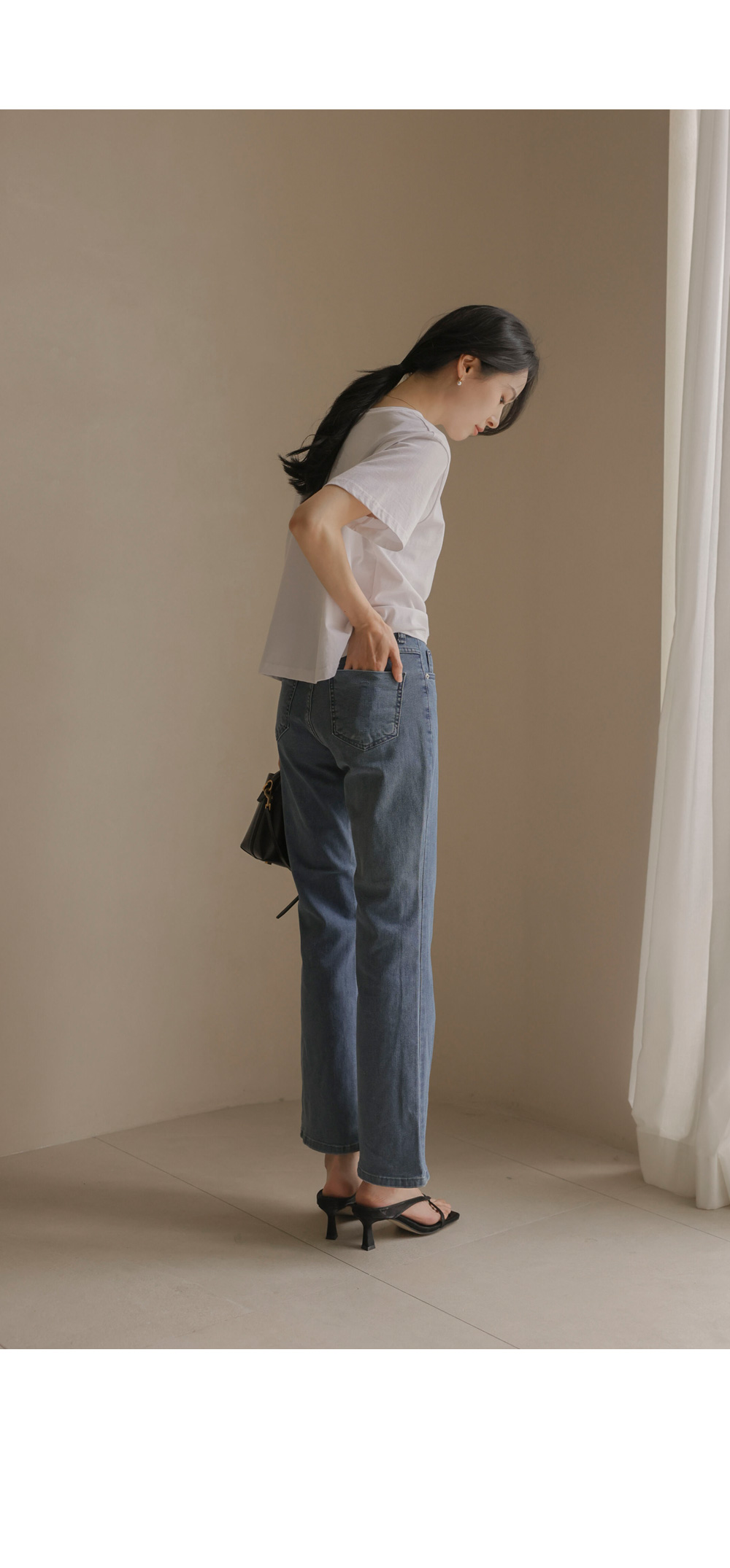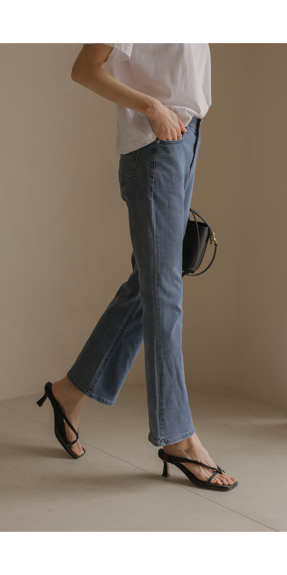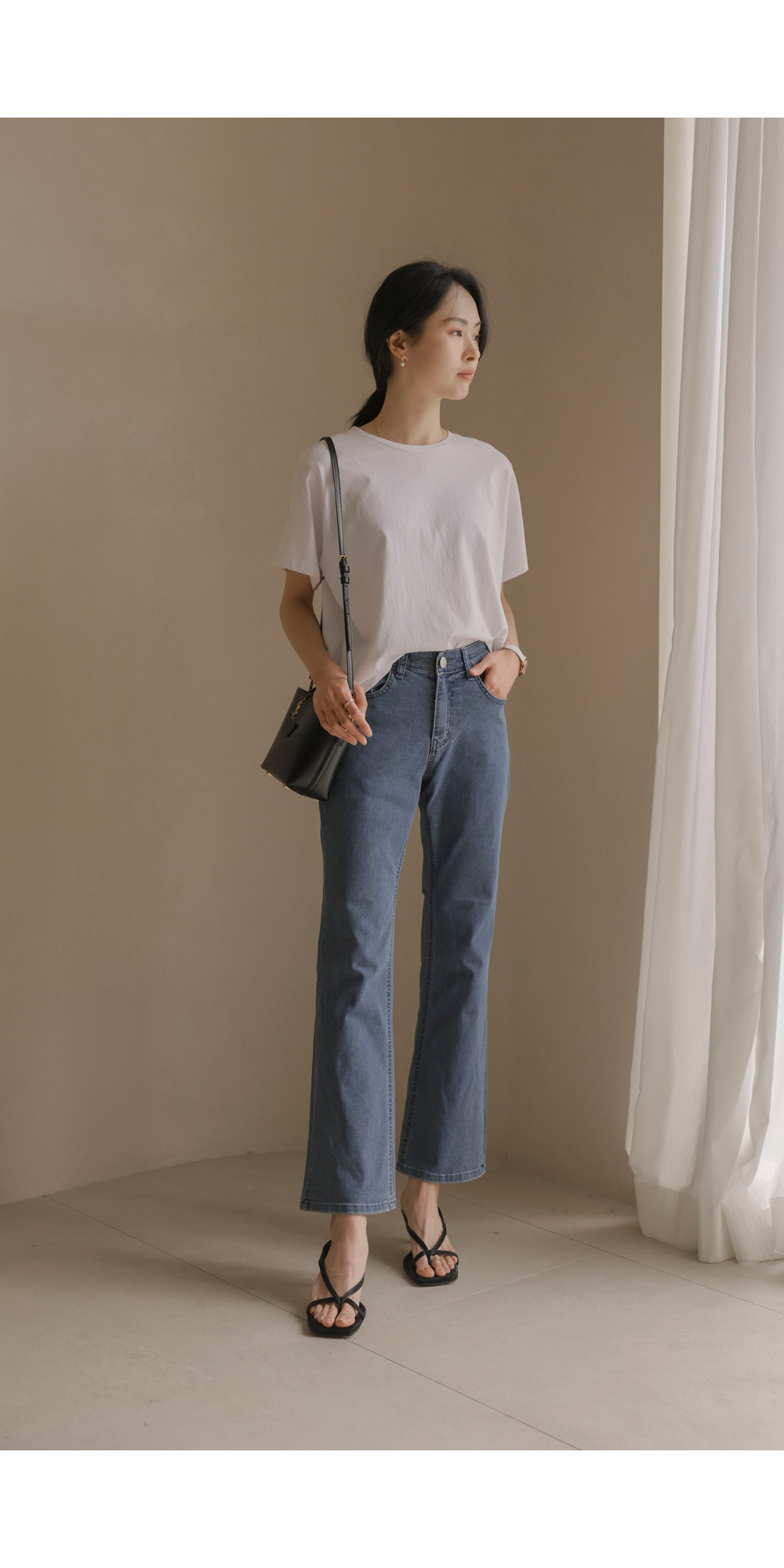 데님 팬츠 카테고리에서 가장 세련된 라인을 자랑하는 아이템 소개해 드려요. 무릎 아래로 자연스럽게 퍼지는 부츠컷 실루엣이 다리 라인을 훨씬 길고 슬림해 보이게 만들어 주구요.