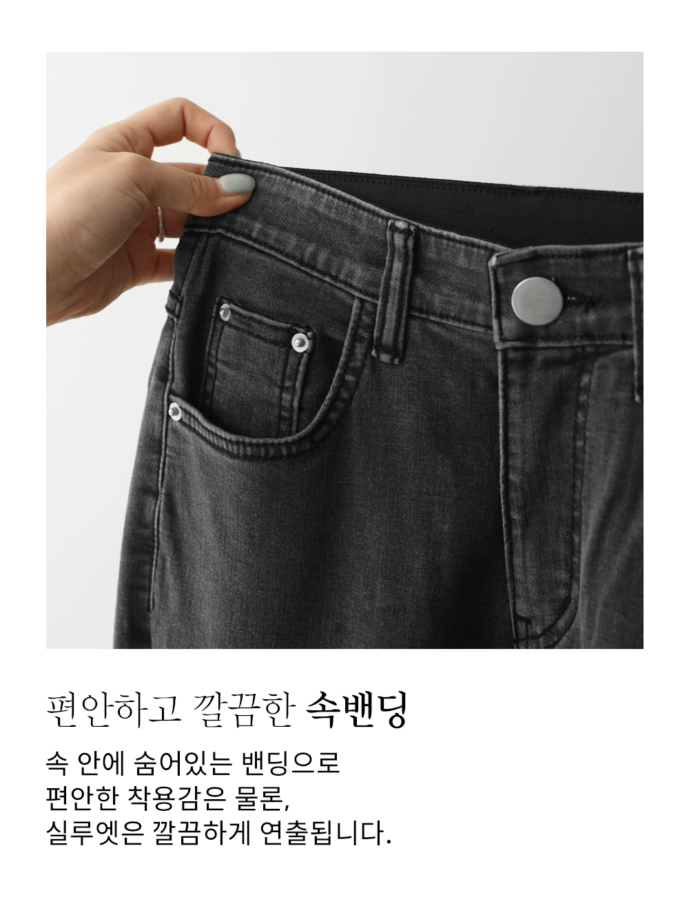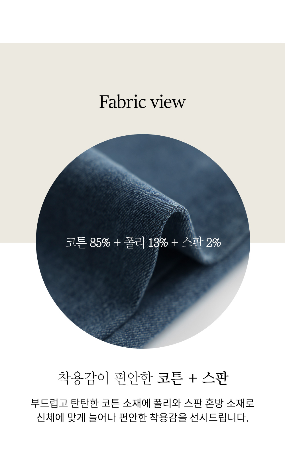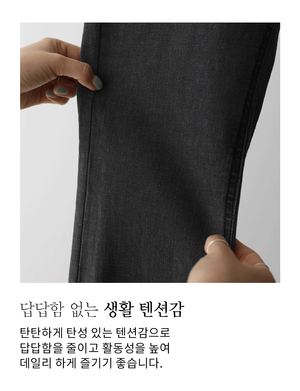 스판이 혼방된 탄탄한 코튼 베이스 소재를 사용하여 쫀쫀한 텐션감이 편안해요. 데님 특유의 뻣뻣함 대신 몸의 곡선에 따라 유연하게 늘어나는 성질을 가지고 있어 활동량이 많은 날에도 피로감이 적구요. 적당한 두께감으로 계절 구애 없이 즐기기 좋으며, 세련된 워싱 기법으로 세탁 후에도 컬러 변형이 적어 오랫동안 처음 느낌 그대로 착용하실 수 있답니다. ![]() 밴딩 가이드 보러가기→ ![]() MD가 답하는 안심 Q&A