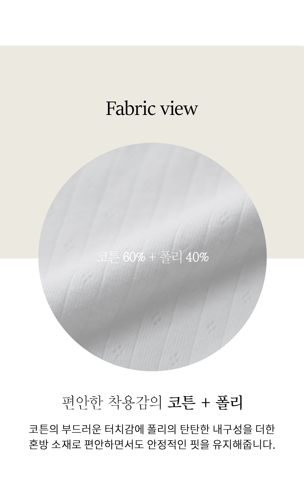 코튼과 폴리가 혼방된 소재를 사용하여 코튼의 부드러운 촉감과 폴리의 탄탄한 복원력을 동시에 느끼실 수 있습니다. 피부에 닿는 느낌이 까슬거림 없이 매끄러워 예민하신 분들도 부담 없이 착용 가능하며, 생활 신축성이 있어 움직임이 큰 활동 시에도 불편함이 전혀 없습니다. 얇고 가벼운 두께감으로 제작되어 한여름에도 시원하게 즐기실 수 있는 소재입니다. ![]() MD가 답하는 안심 Q&A