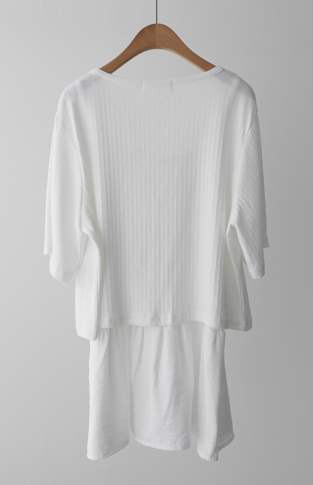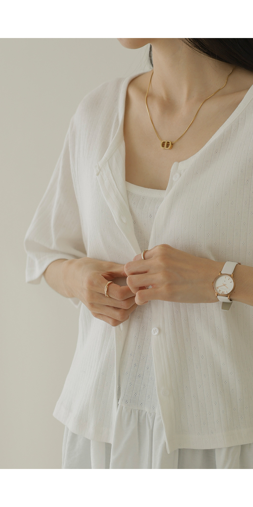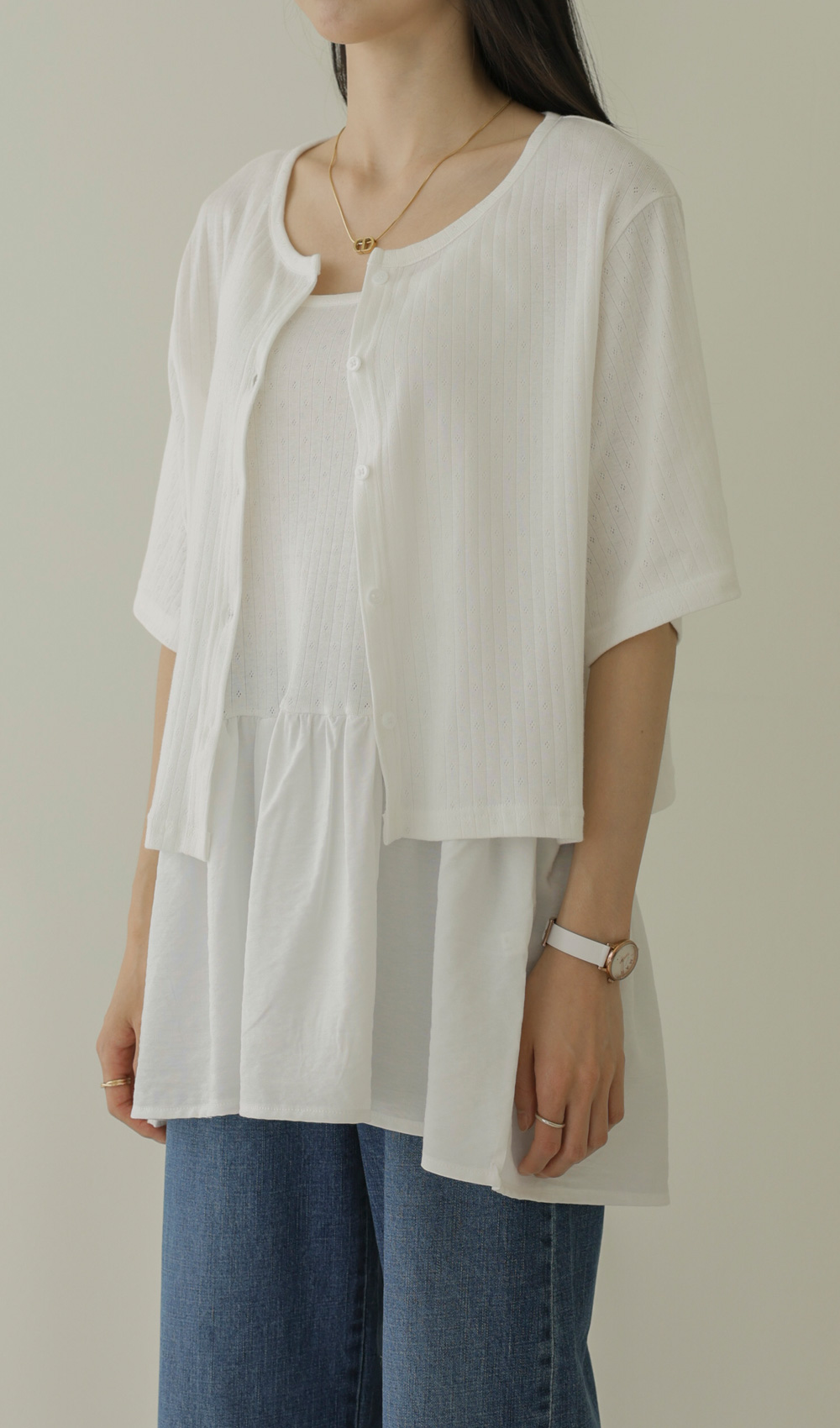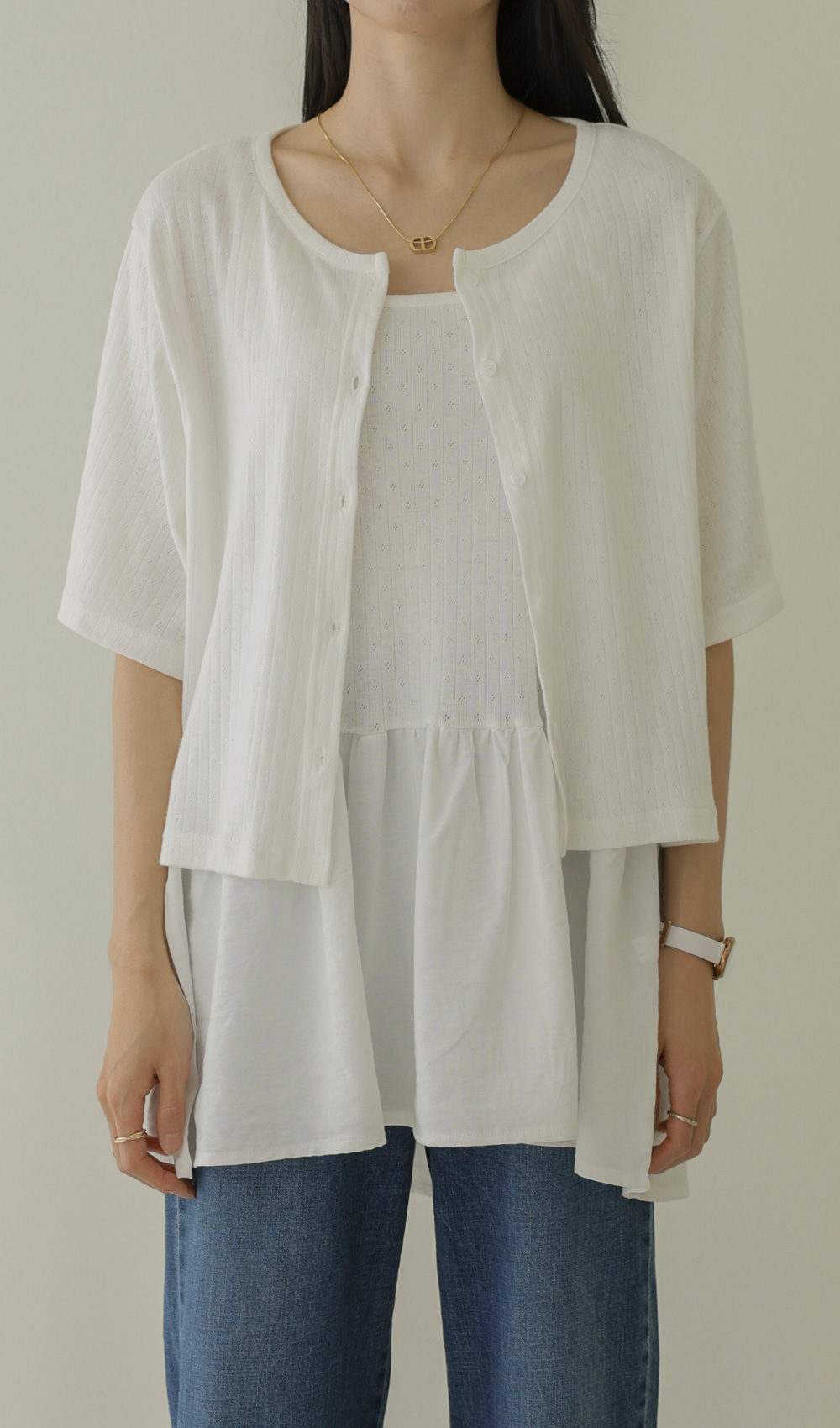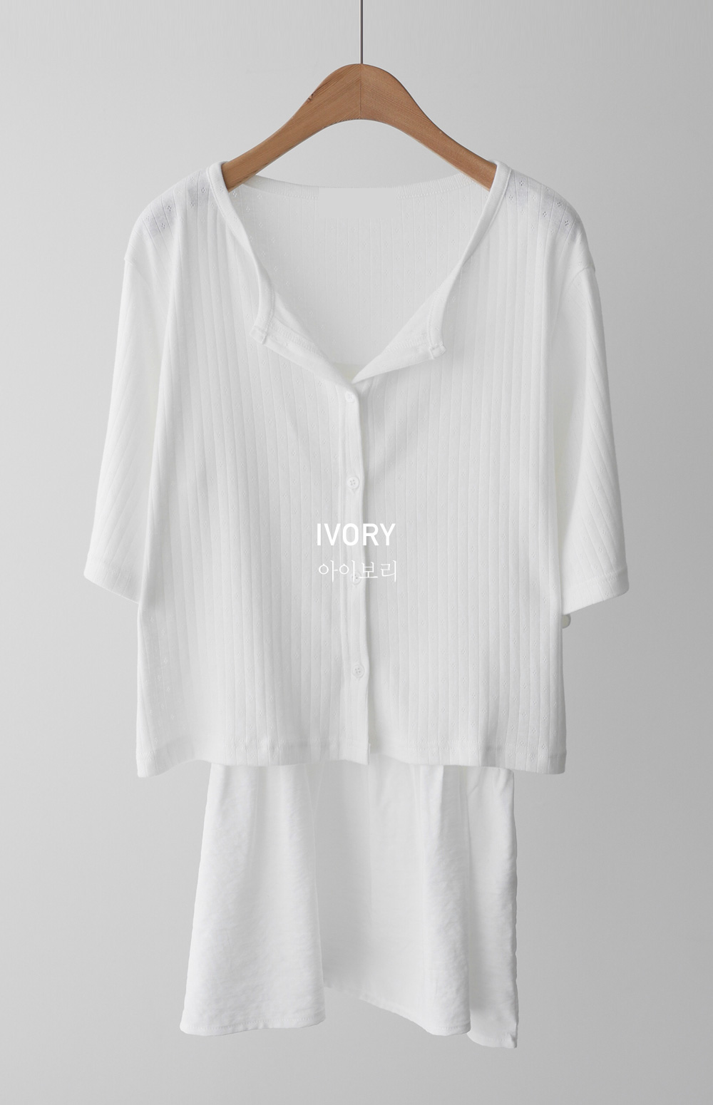 가벼운 외출부터 데이트룩까지 책임져 줄 활용도 만점의 나시와 가디건 세트 아이템이에요. 이번 세트는 은은한 펀칭 짜임이 들어간 라운드 네크라인의 반팔 가디건과 허리 셔링 디테일로 볼륨감을 살린 슬리브리스 나시로 구성되어 있답니다.