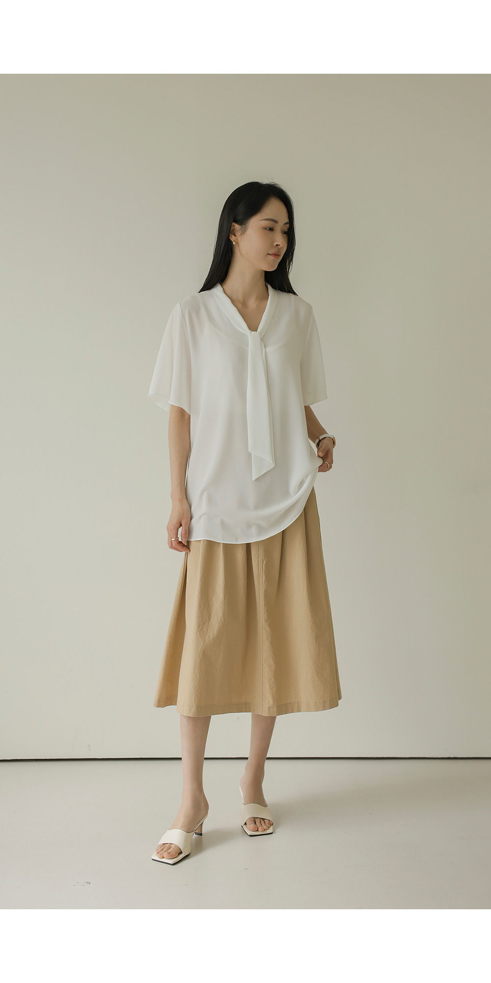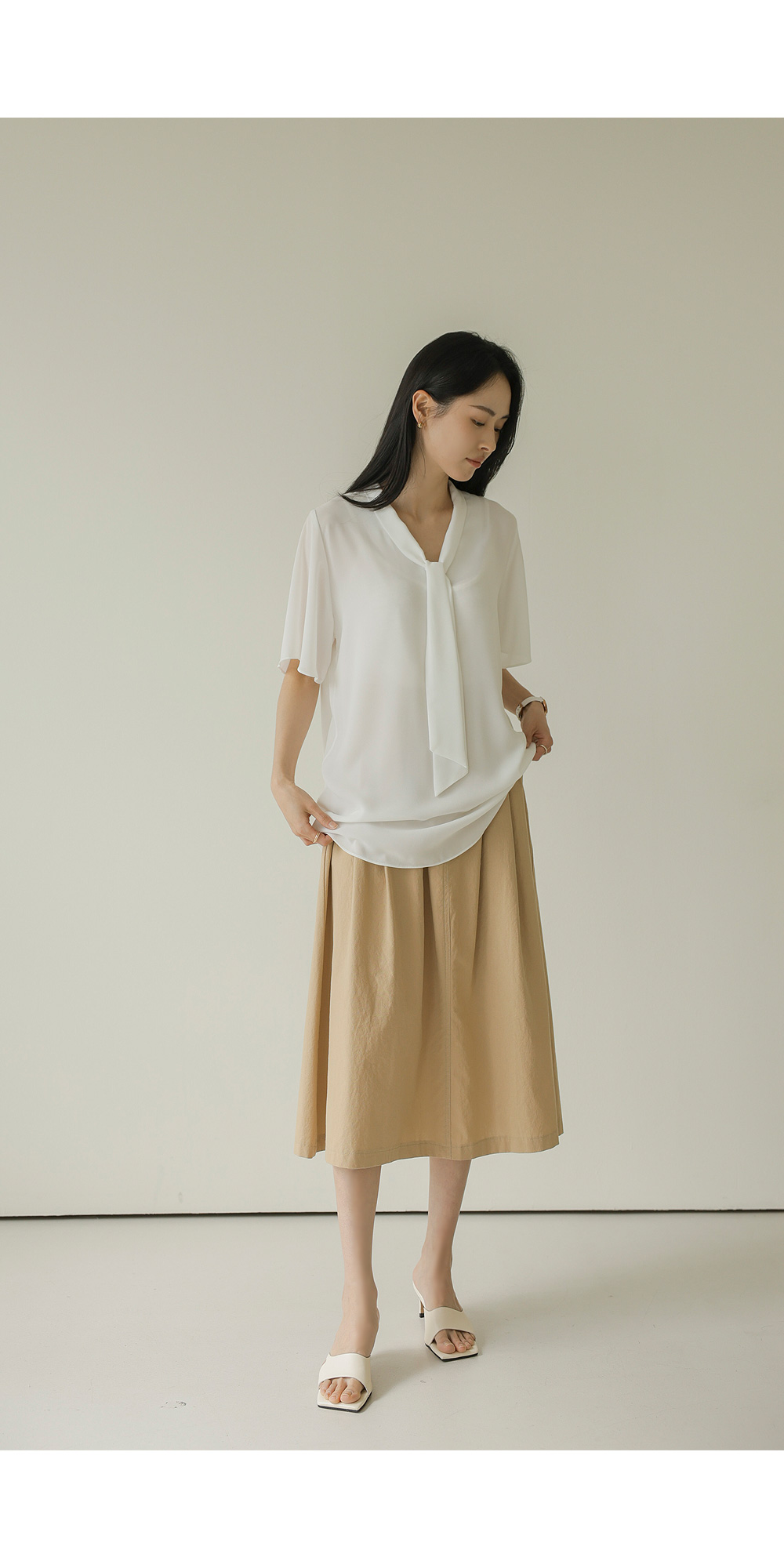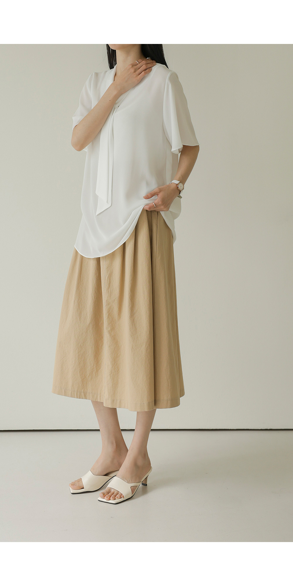 매끈하고 가벼운 폴리 소재를 사용하여 피부에 닿는 촉감이 매우 유연하고 시원합니다. 탄탄한 밀도감 덕분에 얇지만 비침이 과하지 않고, 장시간 착용하거나 활동해도 쉽게 구겨지지 않아 깔끔한 외관을 오래도록 유지해 줍니다. 몸에 달라붙지 않고 찰랑거리는 드레이프성이 우수해 고급스러운 실루엣을 완성해 주는 소재입니다. ![]() MD가 답하는 안심 Q&A