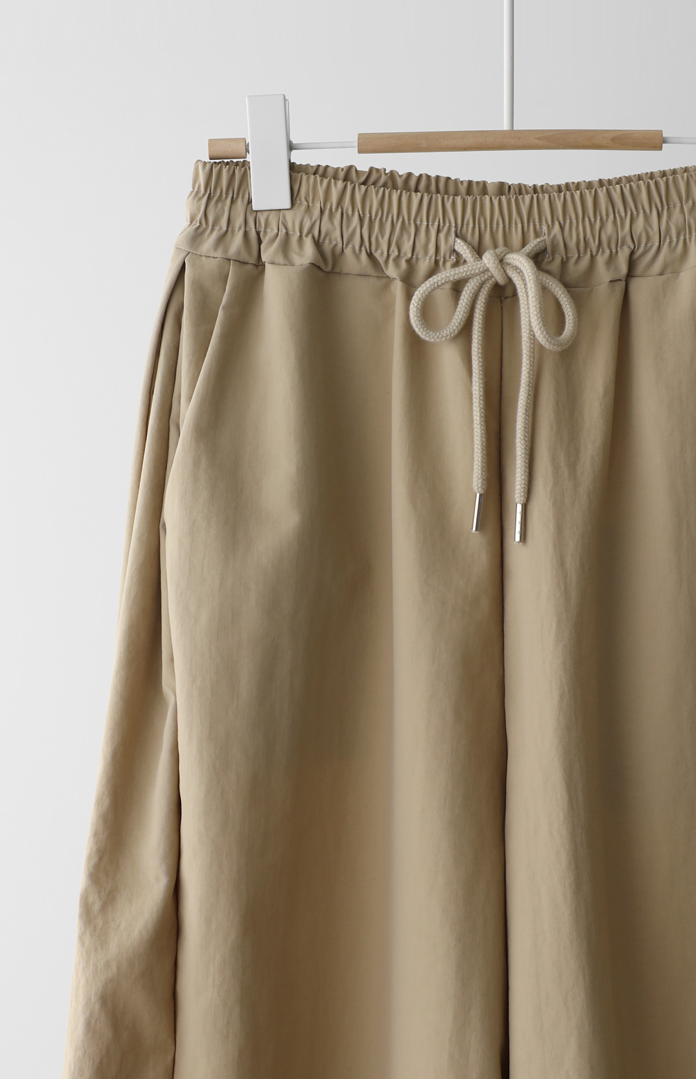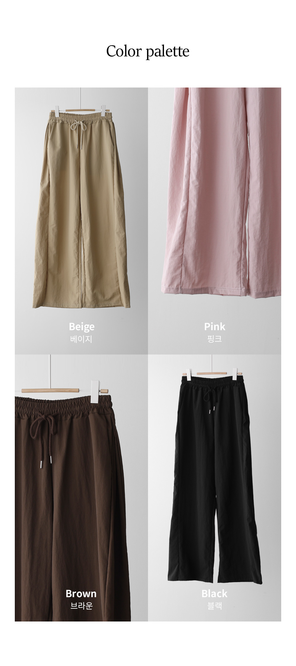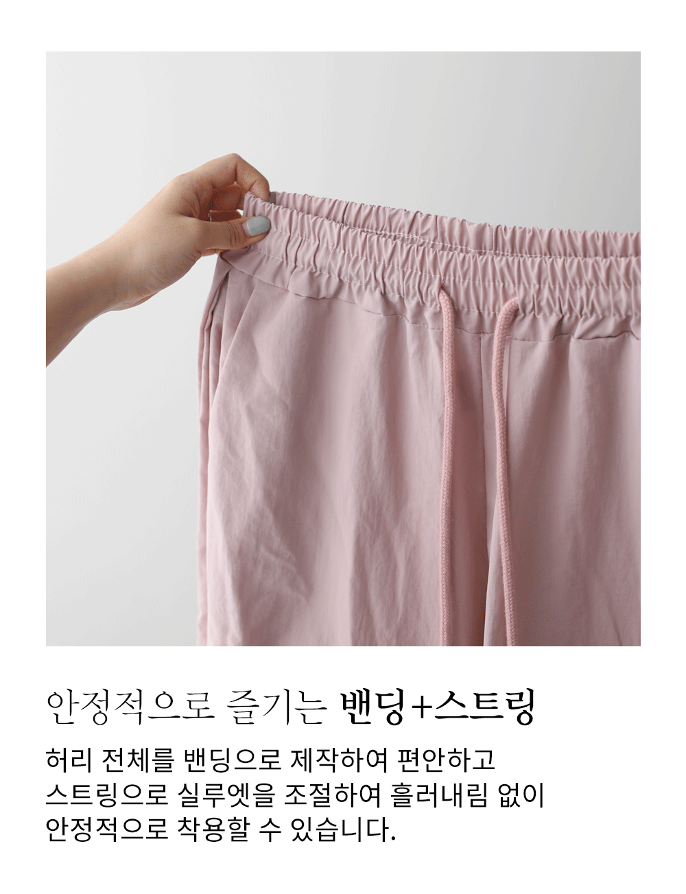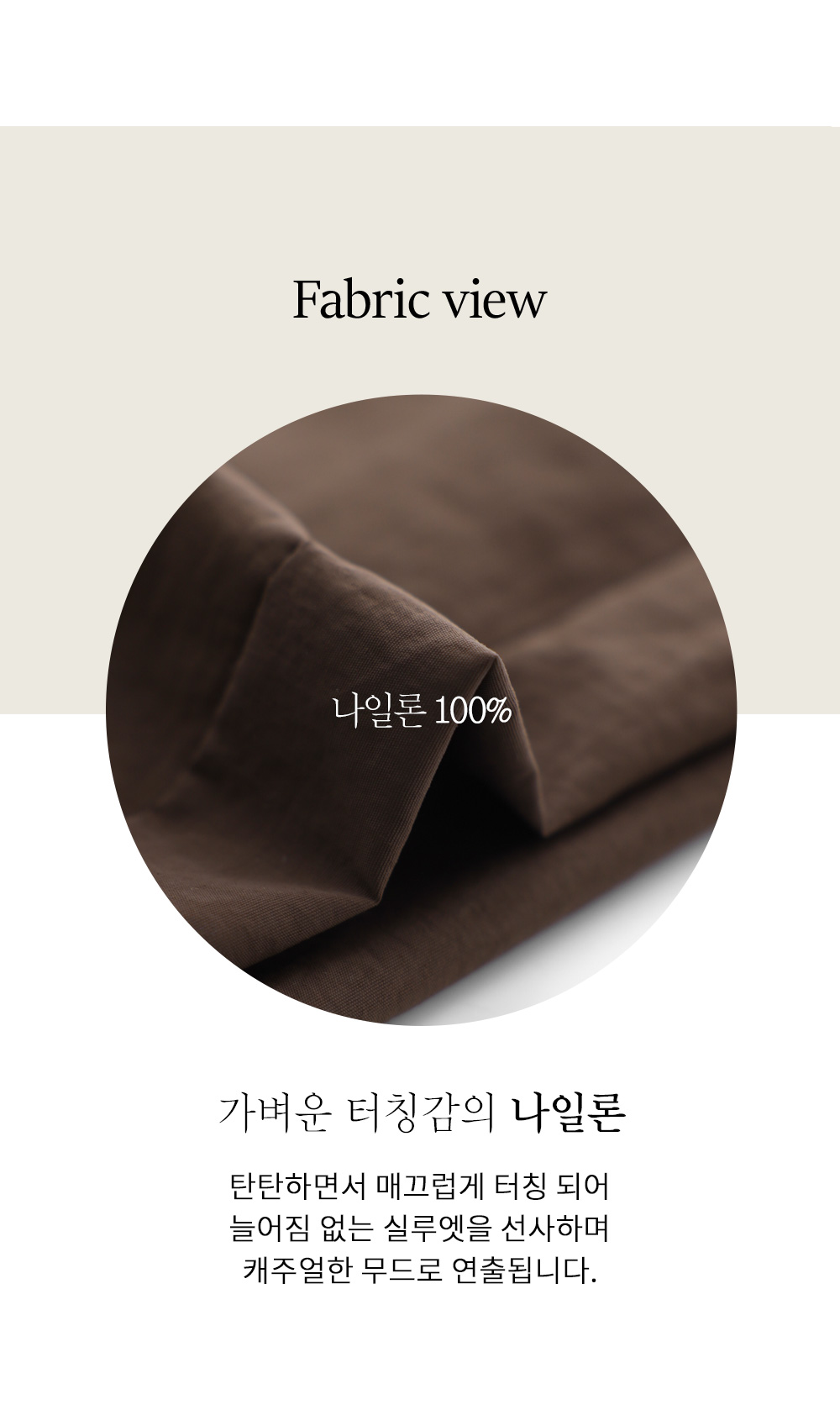 매끄러운 촉감과 가벼운 무게감을 자랑하는 나일론 소재를 사용해 피부에 닿는 감촉이 굉장히 산뜻해요. 탄탄한 조직감 덕분에 무릎 나옴이나 형태 변형이 적어 오랫동안 깔끔한 핏을 유지해 주구요. 매트한 질감이라 부담스럽지 않으며, 바스락거리는 특유의 텍스처가 청량함을 더해준답니다.