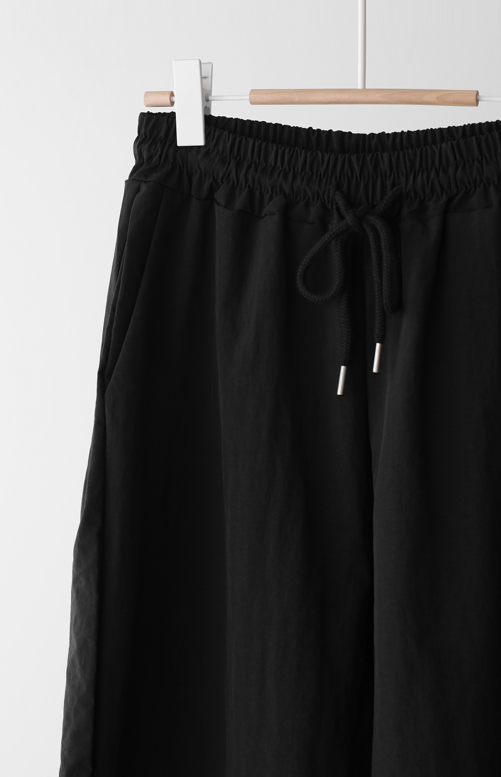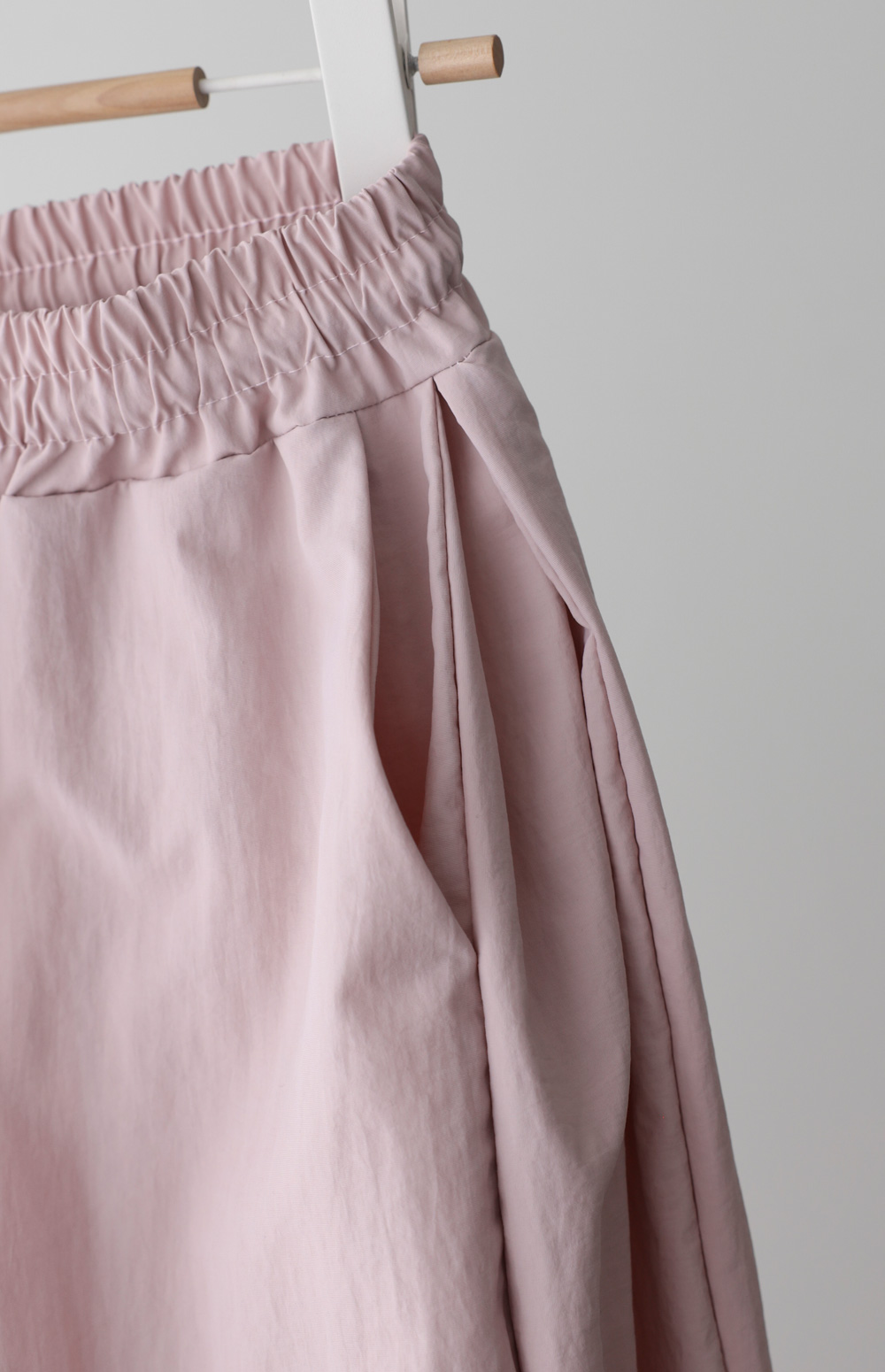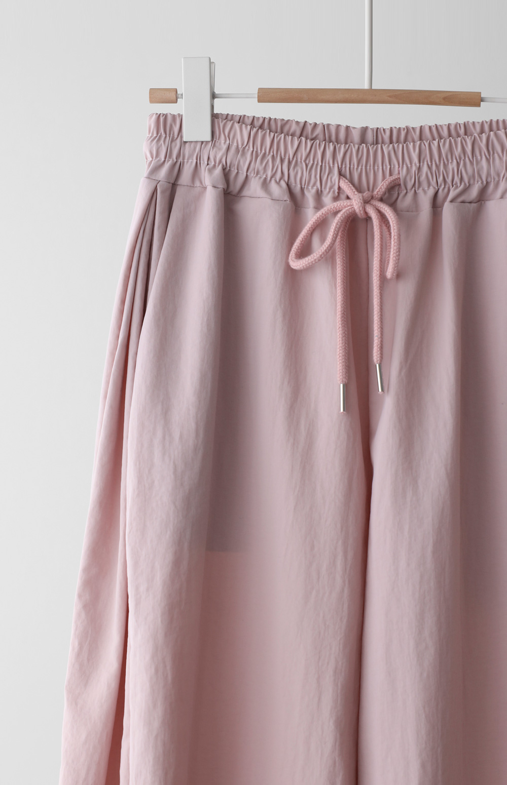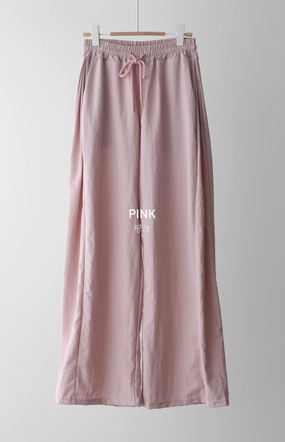 매끄러운 촉감과 가벼운 무게감을 자랑하는 나일론 소재를 사용해 피부에 닿는 감촉이 굉장히 산뜻해요. 탄탄한 조직감 덕분에 무릎 나옴이나 형태 변형이 적어 오랫동안 깔끔한 핏을 유지해 주구요. 매트한 질감이라 부담스럽지 않으며, 바스락거리는 특유의 텍스처가 청량함을 더해준답니다.